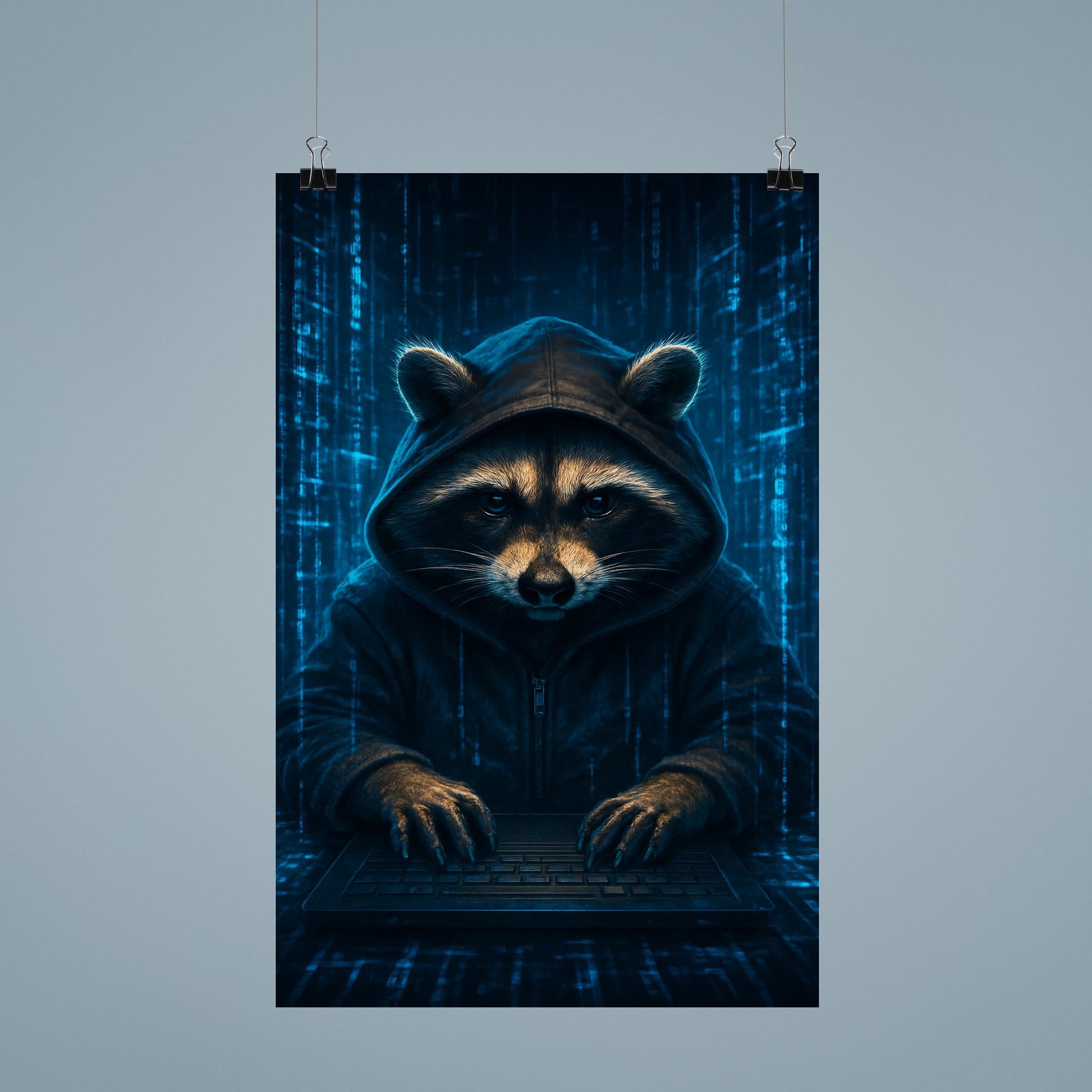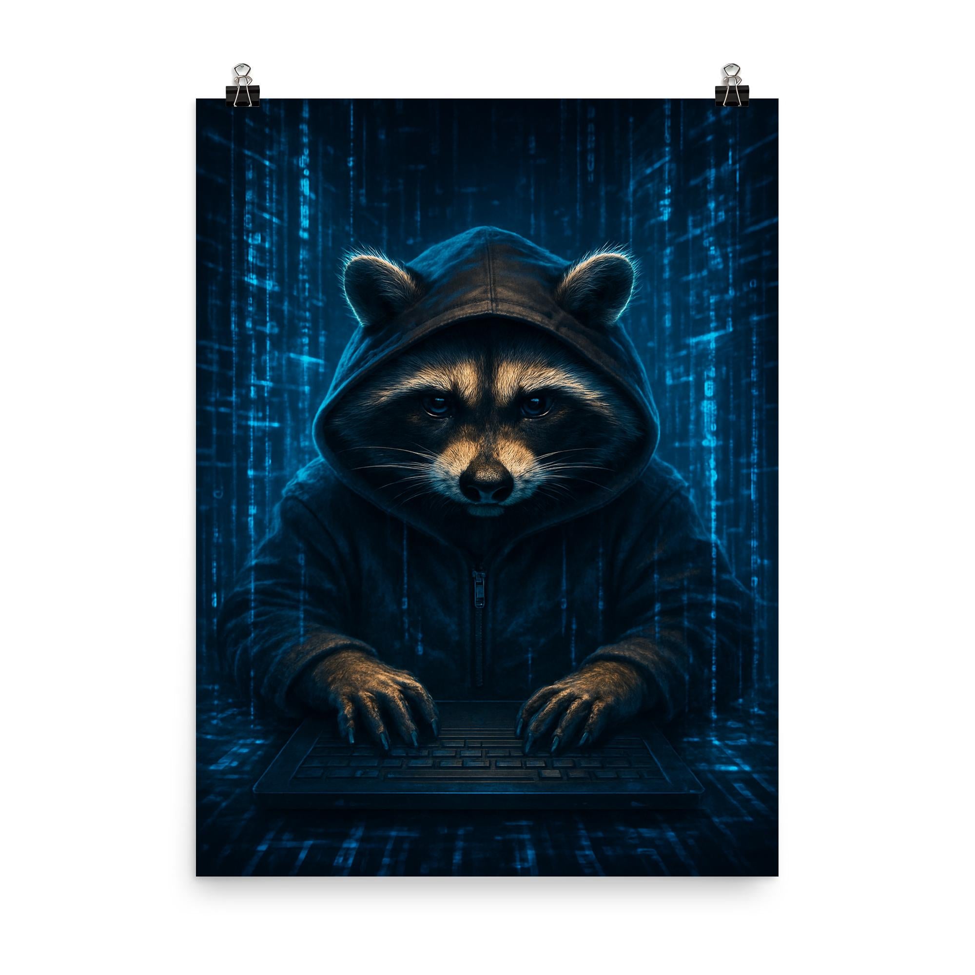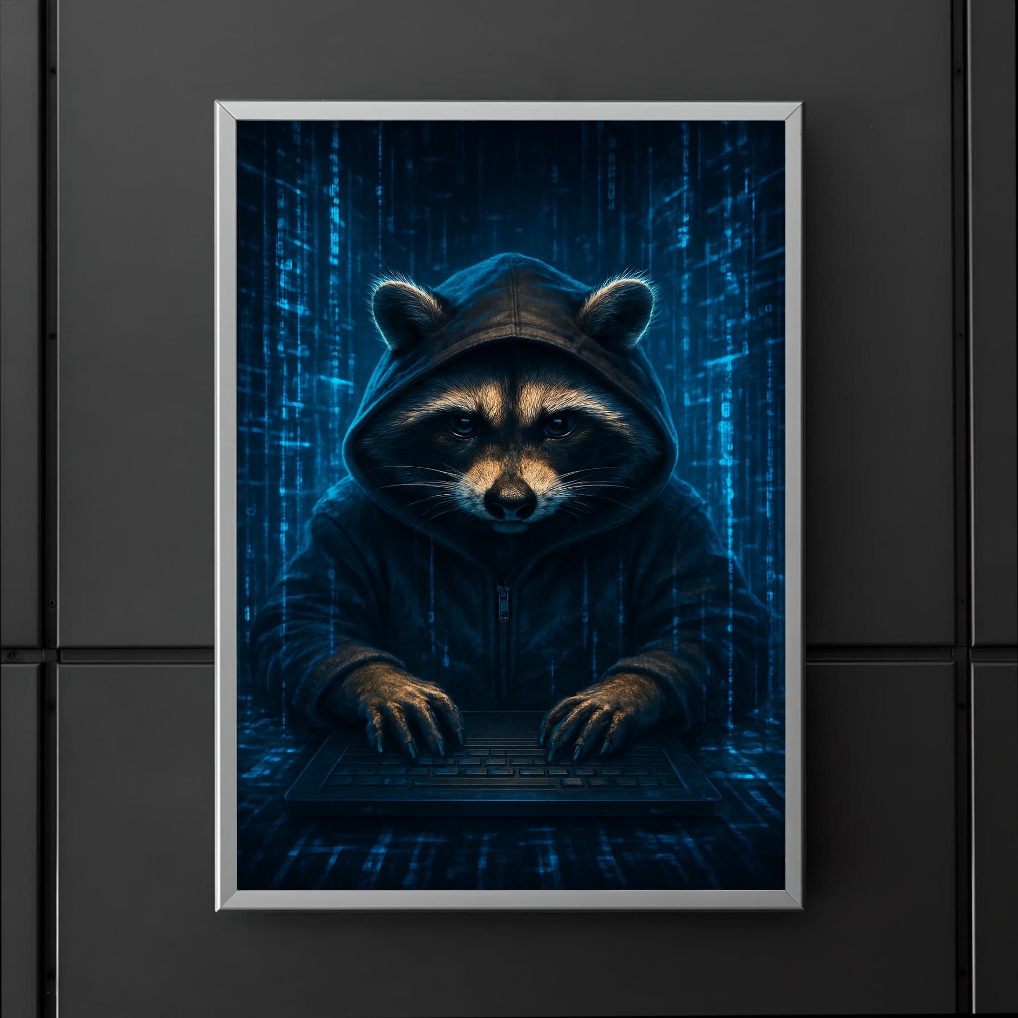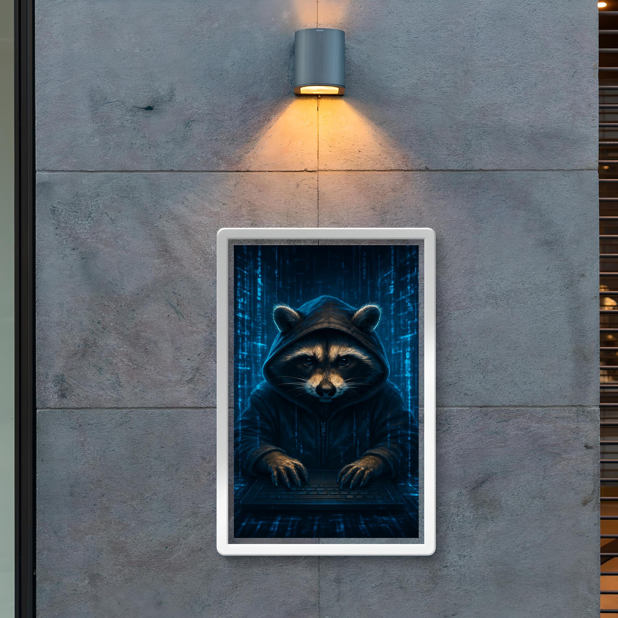 Unleash your inner tech rebel with this striking poster featuring a raccoon hacker immersed in swirling holographic code streams. Perfect for anyone who loves a blend of clever mischief and cyber intrigue, this artwork electrifies any space with its bold, futuristic vibe. Whether in a workspace or gaming den, it’s a captivating tribute to the art of digital stealth and innovation.