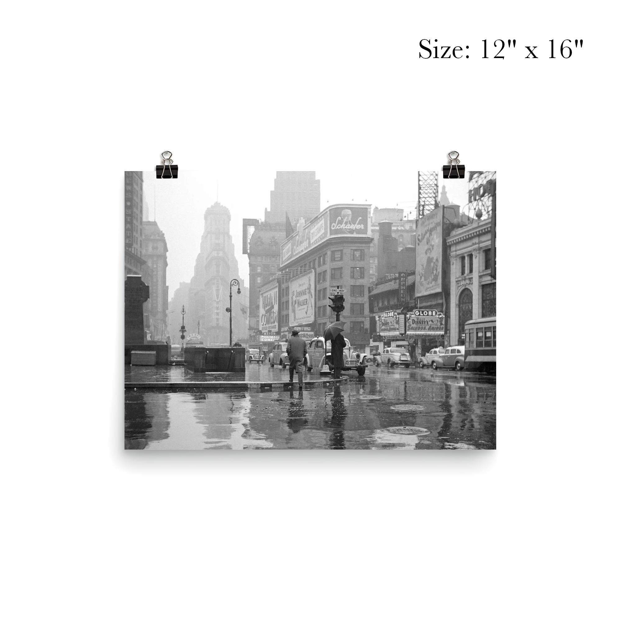 Step back in time with this evocative poster capturing Times Square on a rainy day in 1943. The iconic New York City landmark is bathed in soft reflections, inviting you to experience a moment of quiet elegance amid the bustling urban scene. Perfect for adding a touch of vintage charm and historical depth to any space.