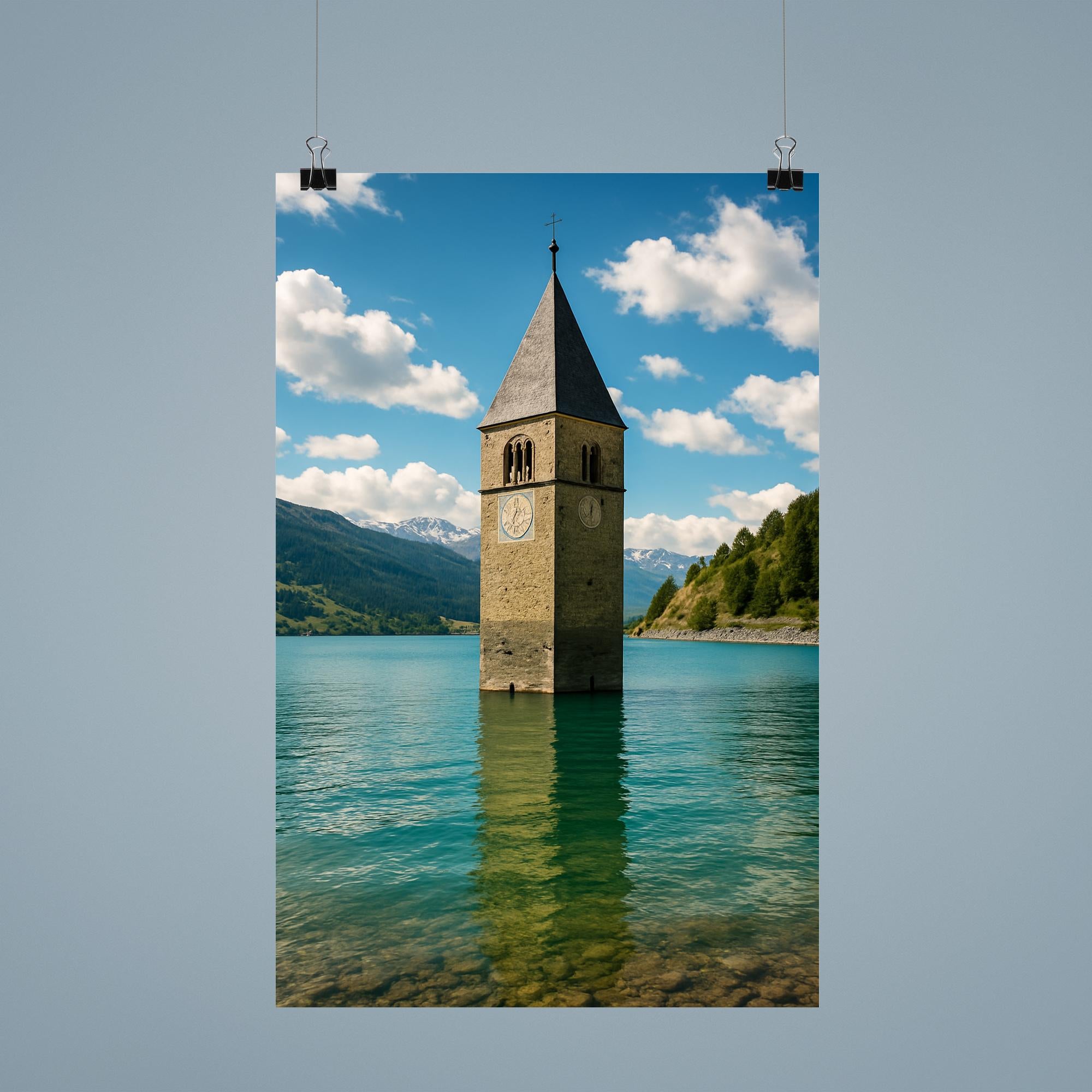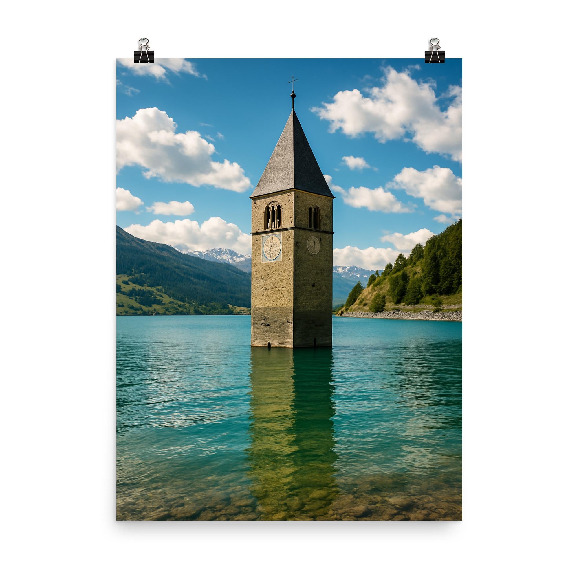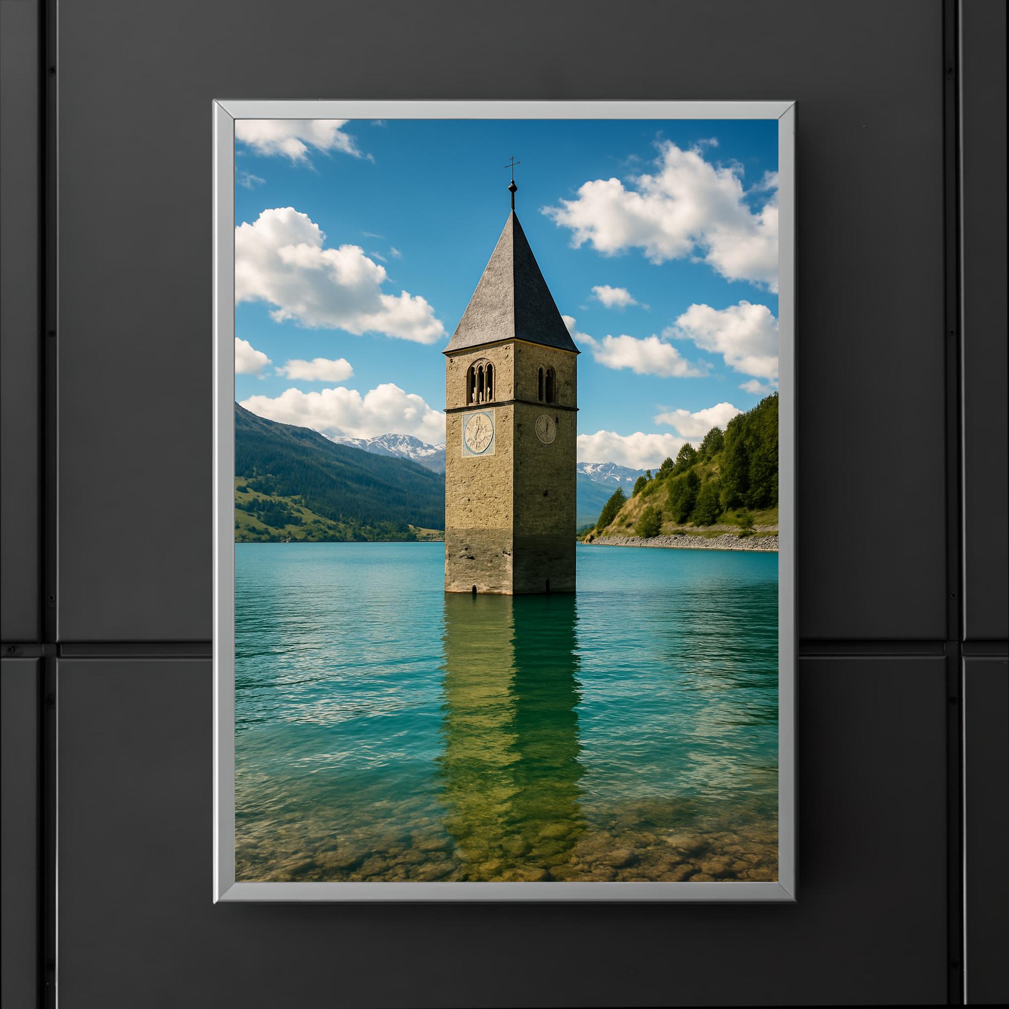 Reschensee Bell Tower Wall Art Poster Print – Stunning Lake Resia Italy Landscape Decor for Home & Office