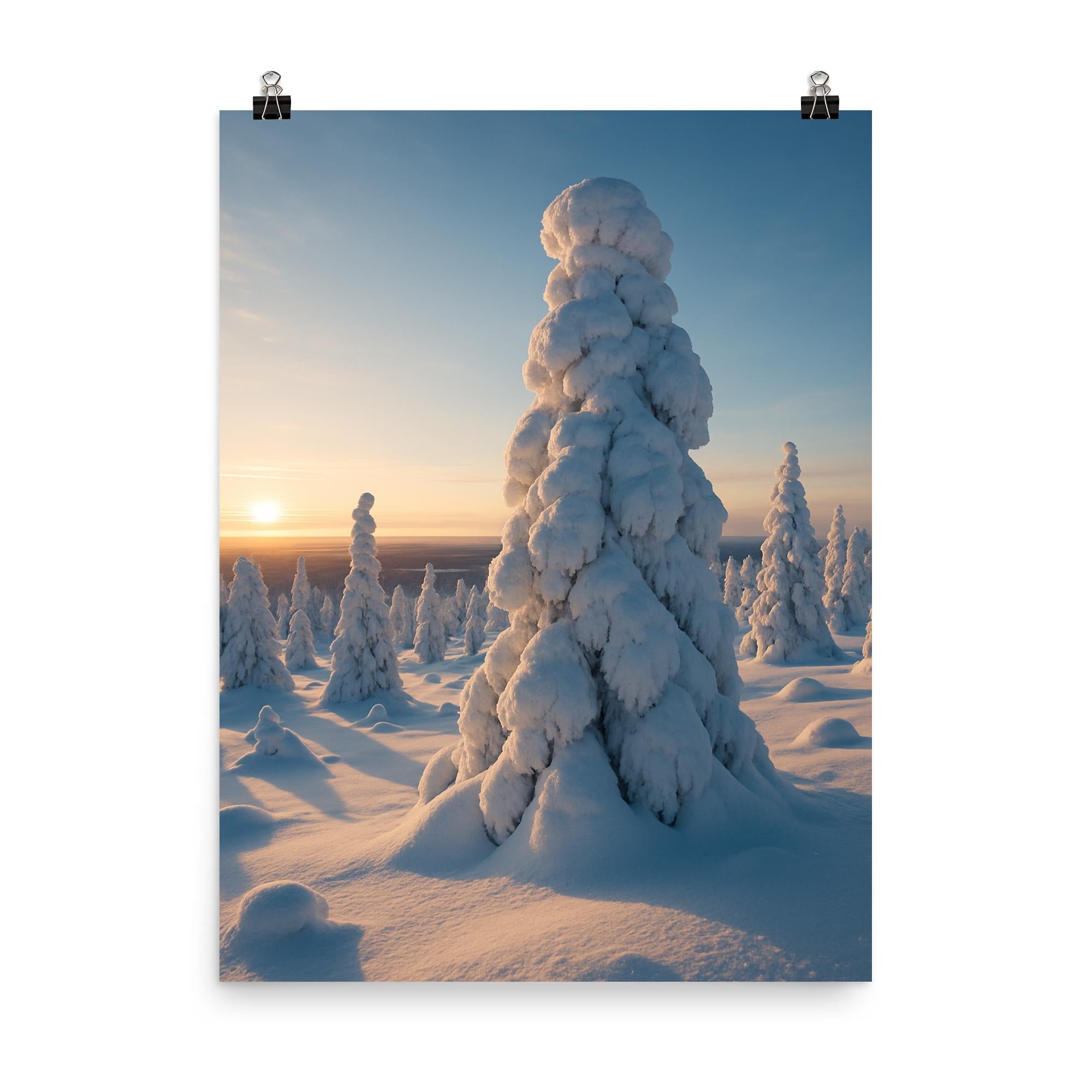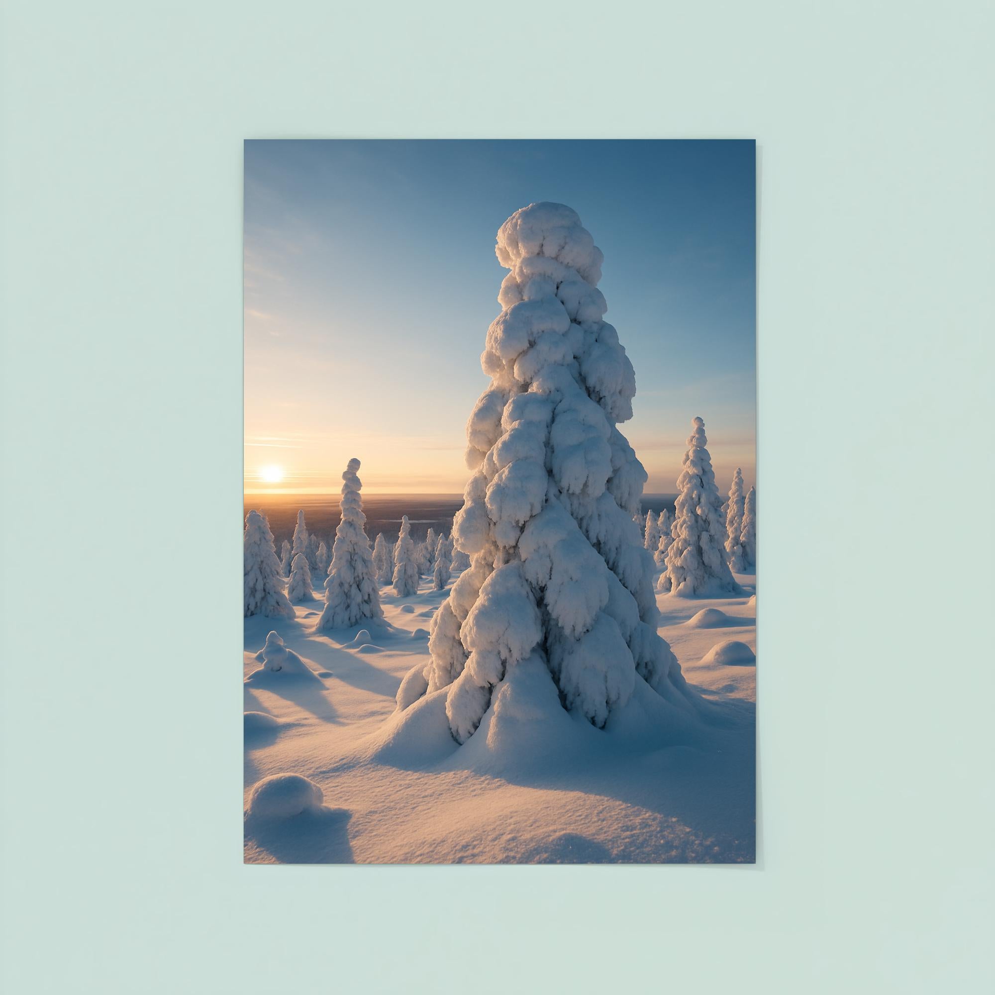 Transform your space with the serene beauty of snowy wilderness captured in this poster of Riisitunturi’s snow-laden trees. Showcasing Finland’s tranquil winter landscape, it invites a moment of calm and wonder into any room. Perfect for nature lovers seeking to bring the magic of untouched snow-covered forests indoors.