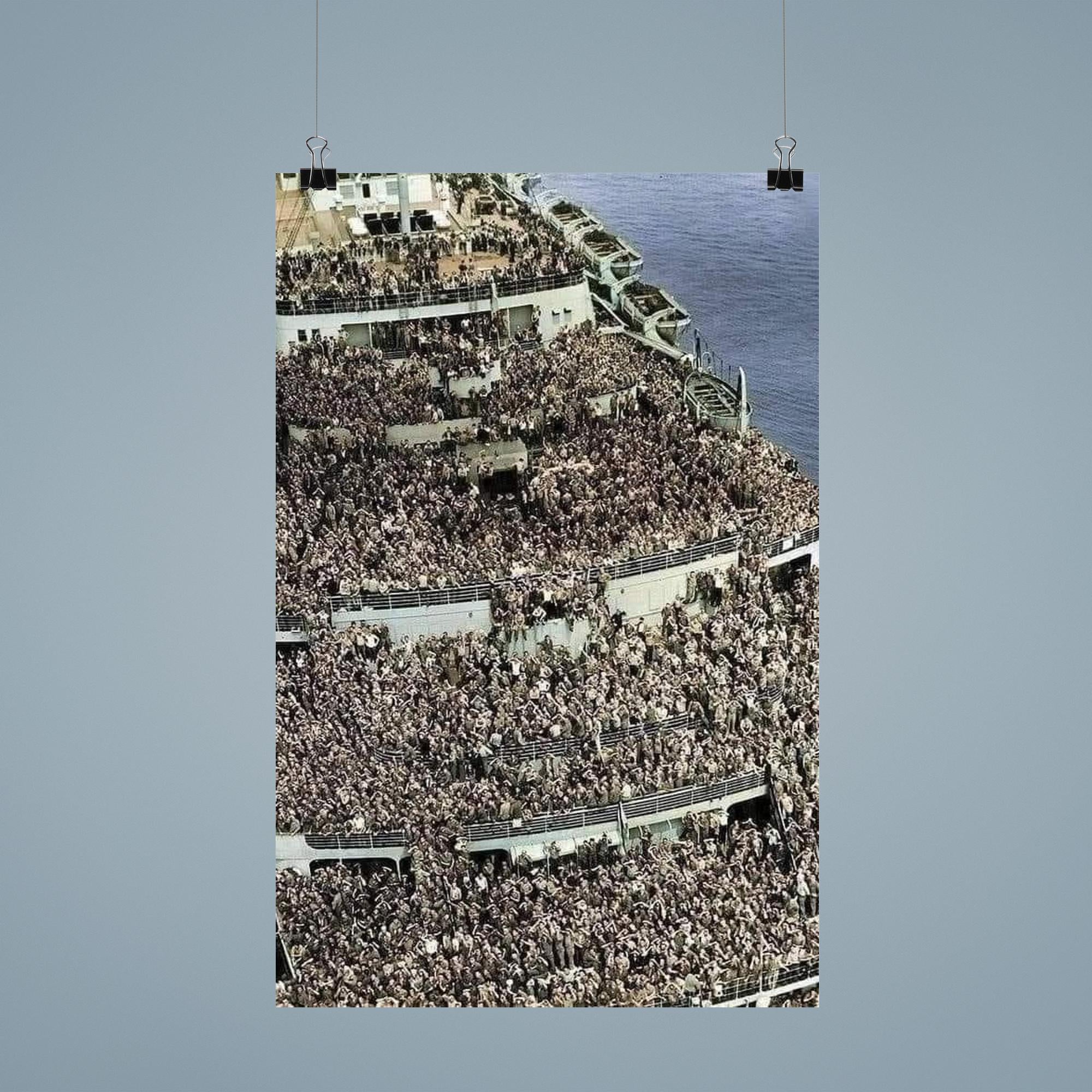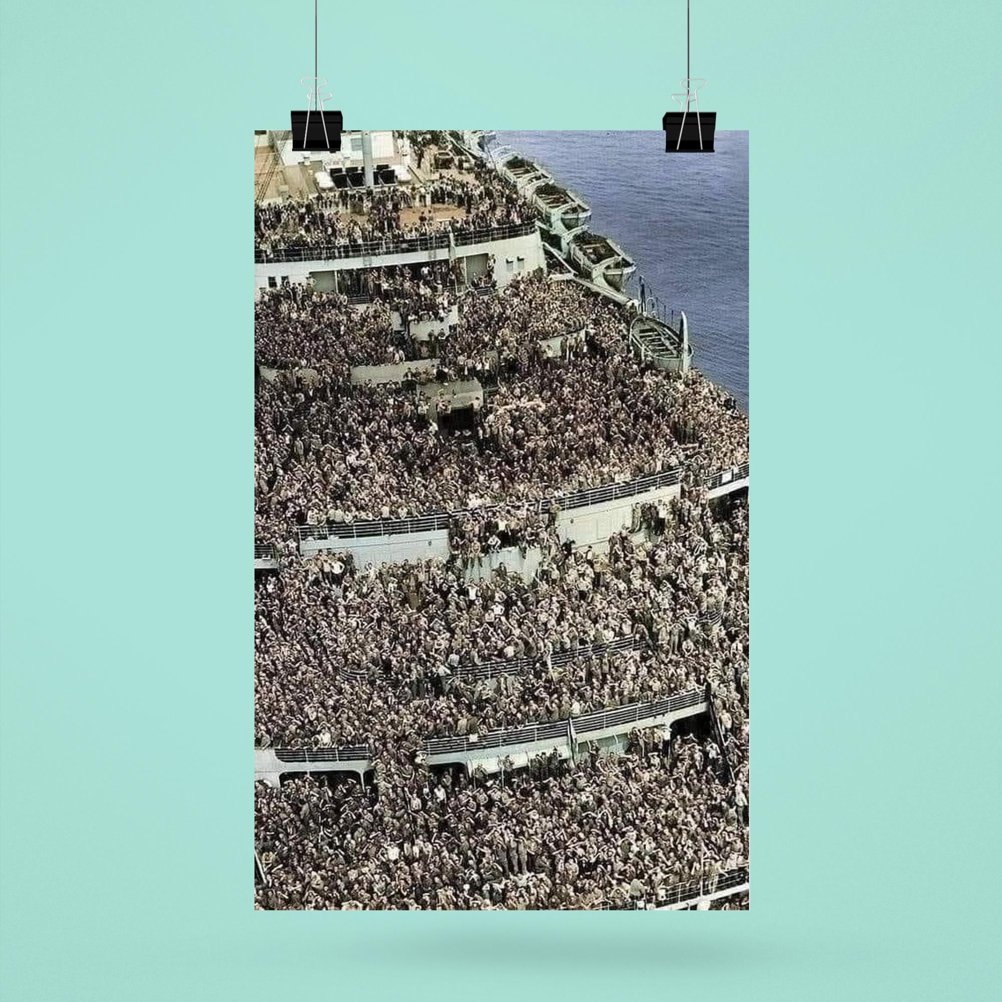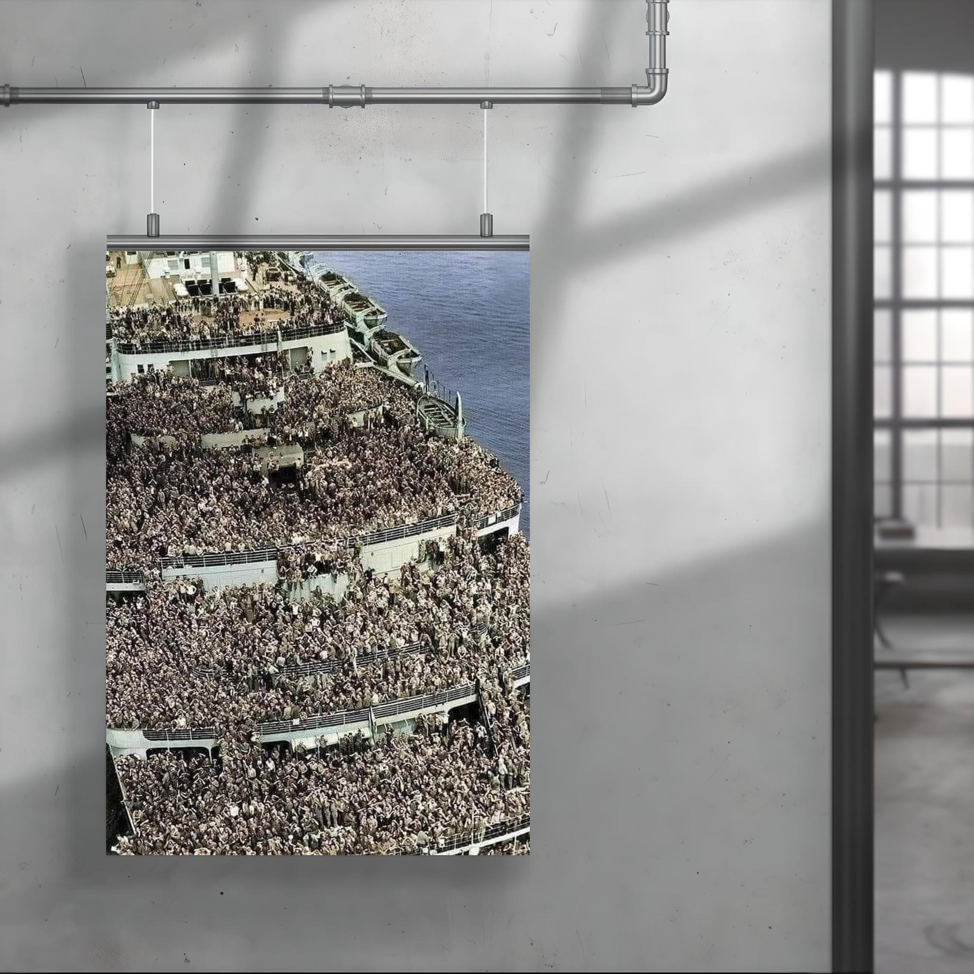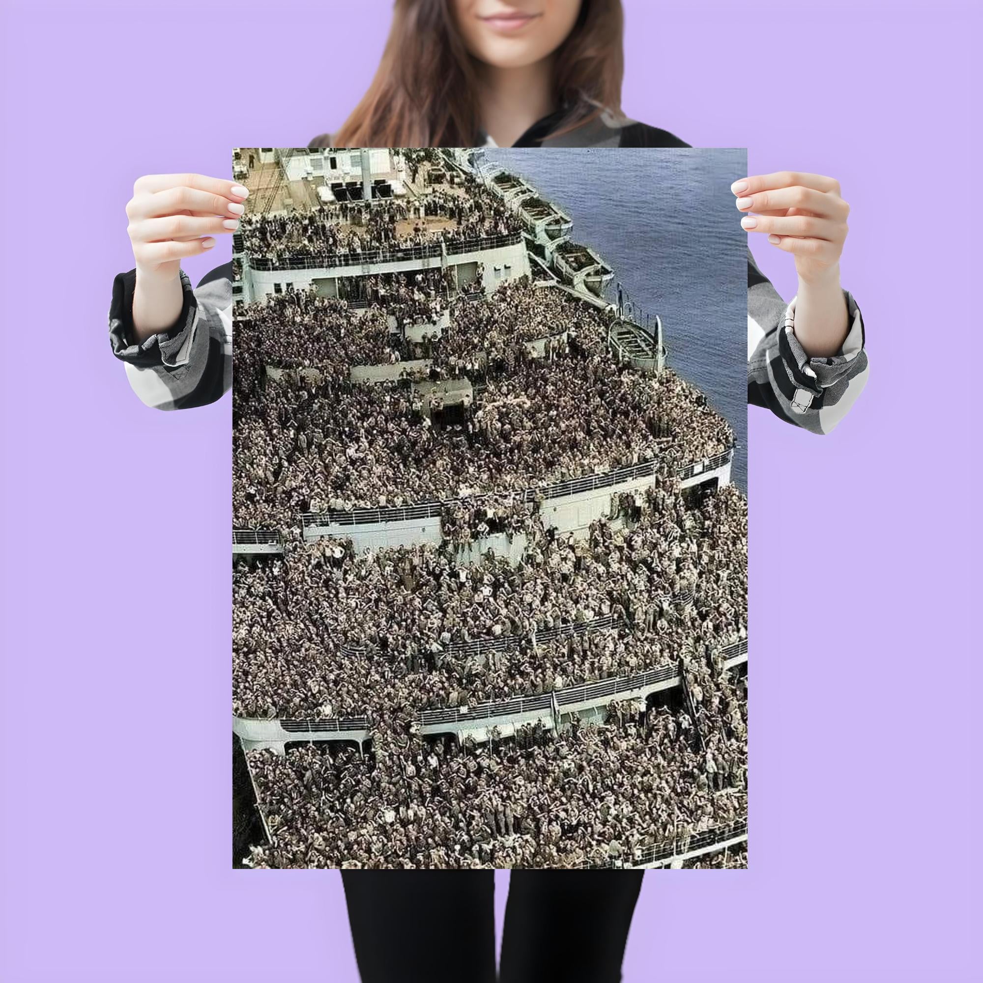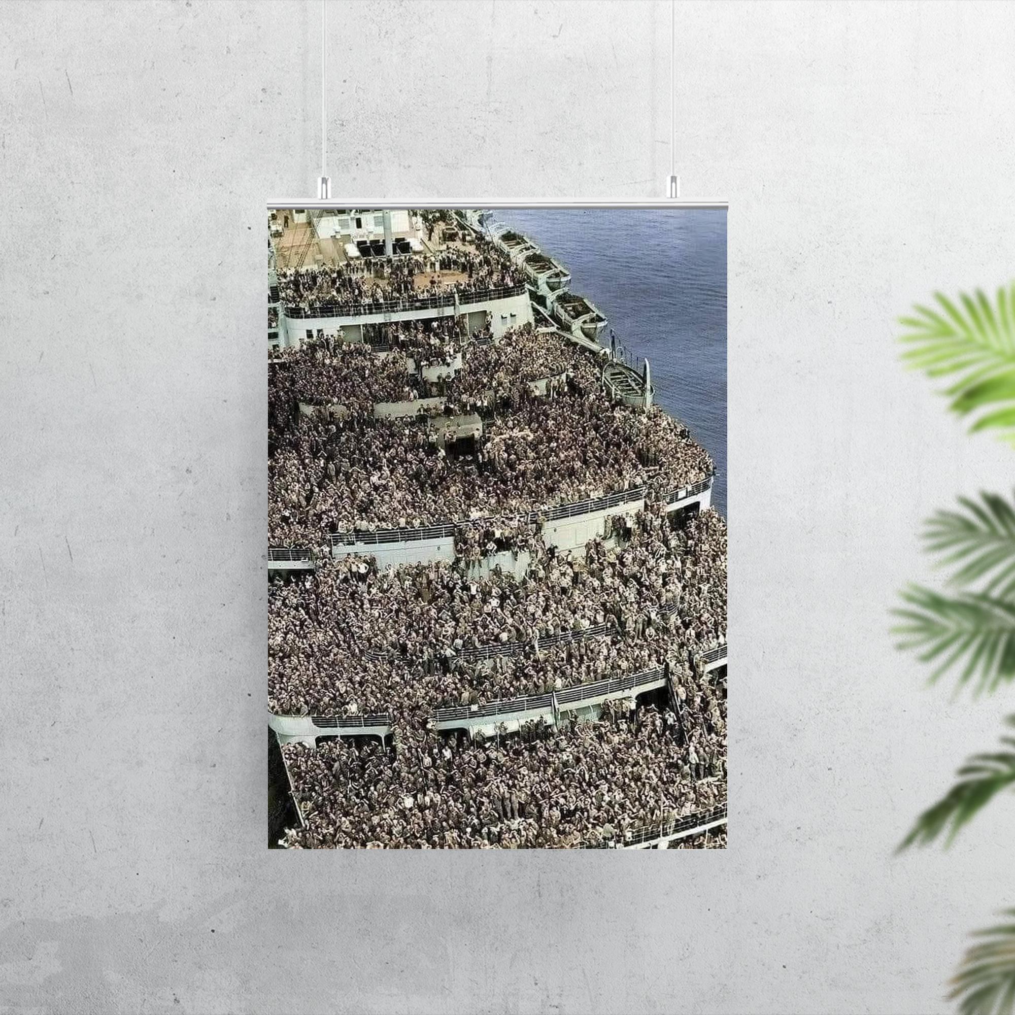 Capture a powerful moment in history with this striking poster of the RMS Queen Elizabeth arriving in New York Harbor in 1945, carrying soldiers home after years of sacrifice. This iconic image honors the bravery and resilience of those who served, making it a timeless tribute and a compelling centerpiece for any space.