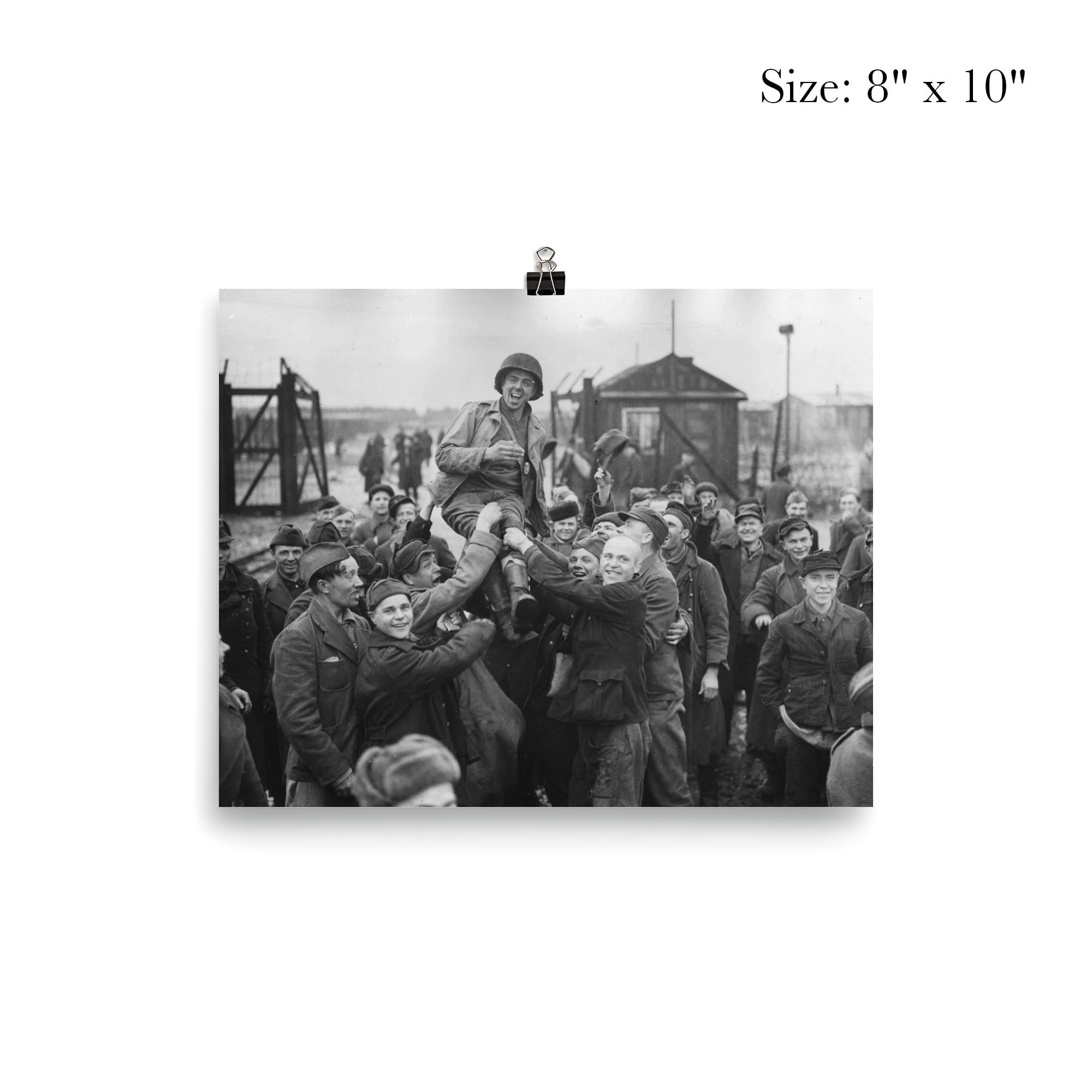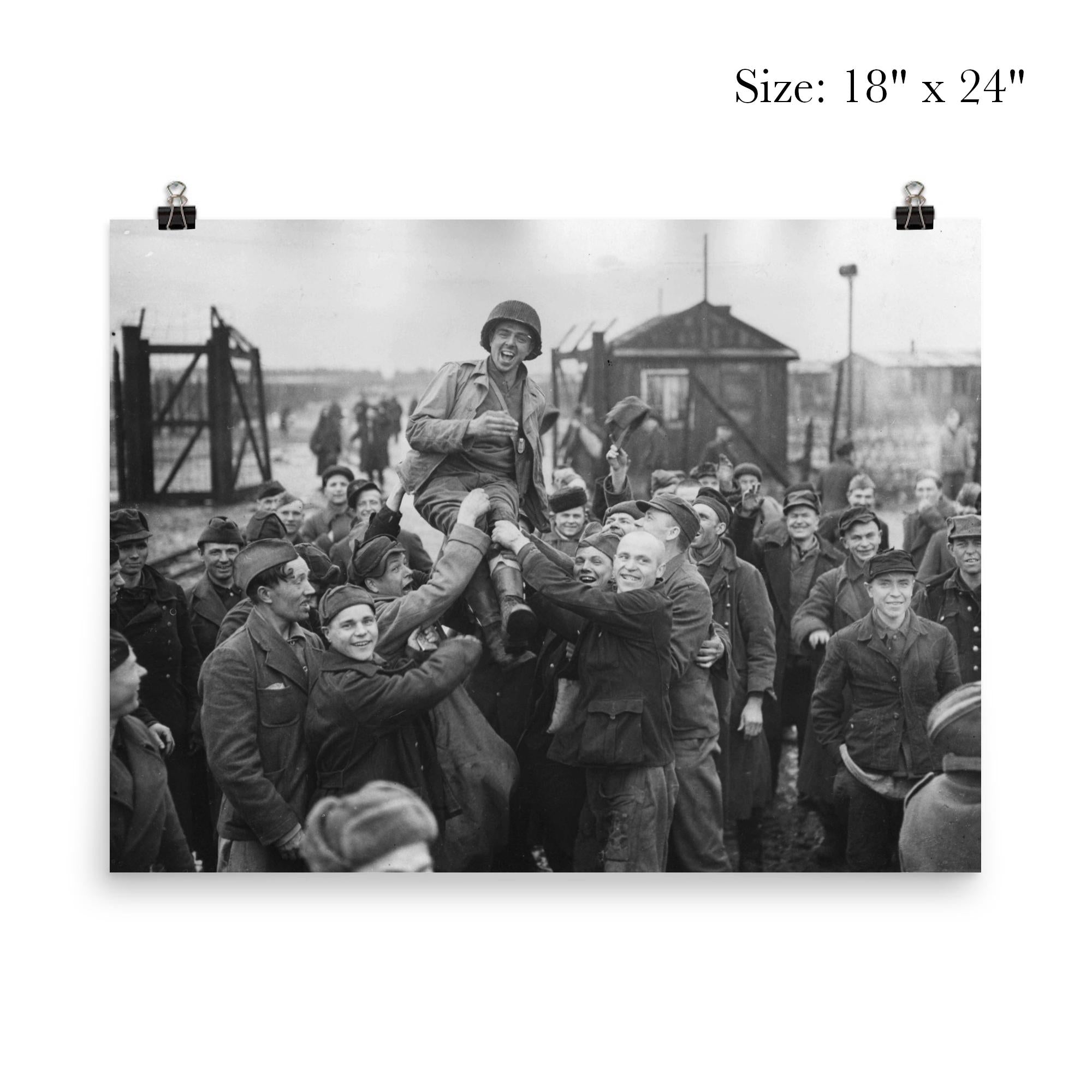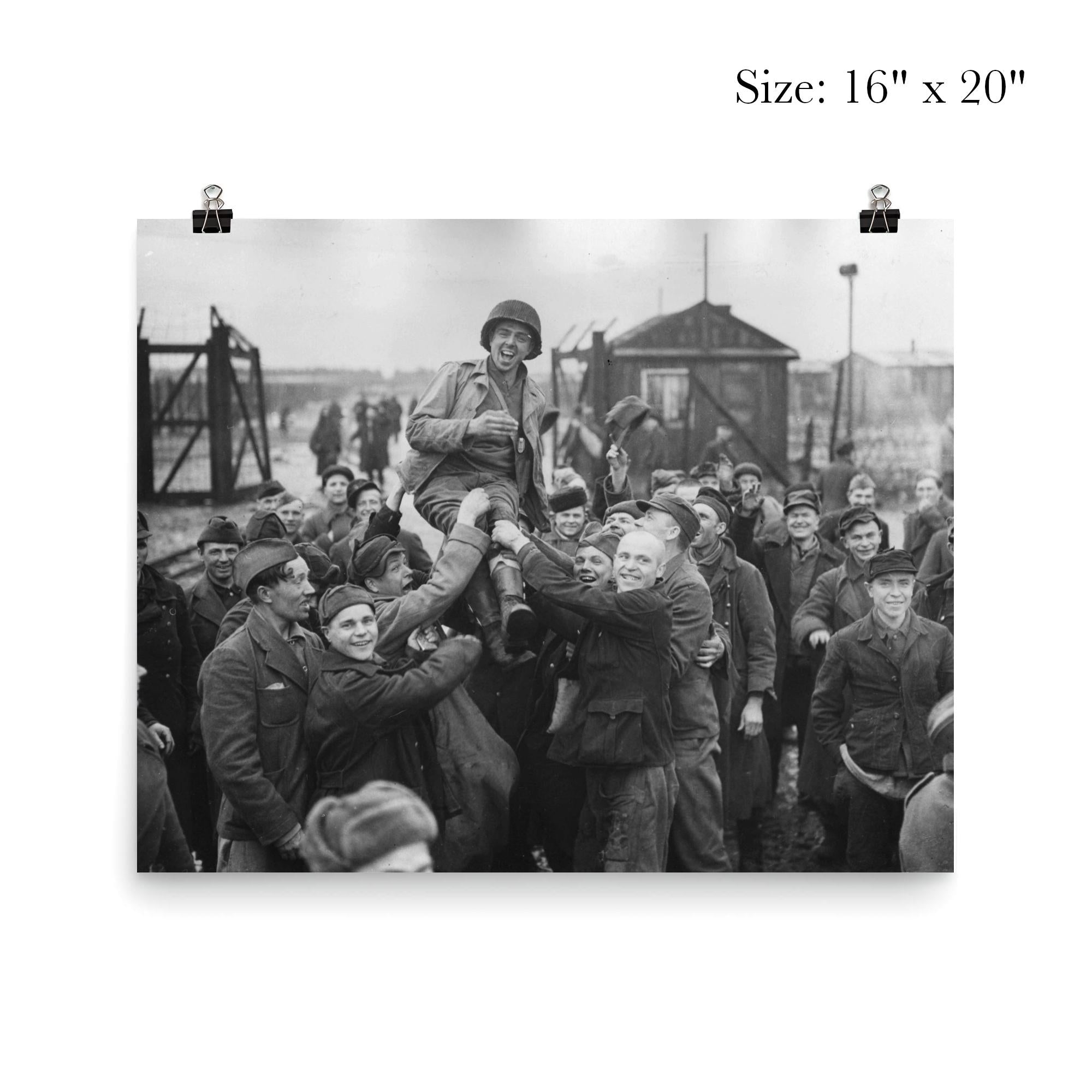 Capture a powerful moment of humanity and resilience with this striking poster depicting Russian prisoners of war lifting an American soldier after liberation in Eselheide, Germany, on April 9, 1945. This compelling image honors the strength of unity amid adversity and serves as a poignant reminder of courage and compassion during one of history’s most trying times. Display this poster to inspire reflection on bravery, solidarity, and the enduring spirit of freedom.