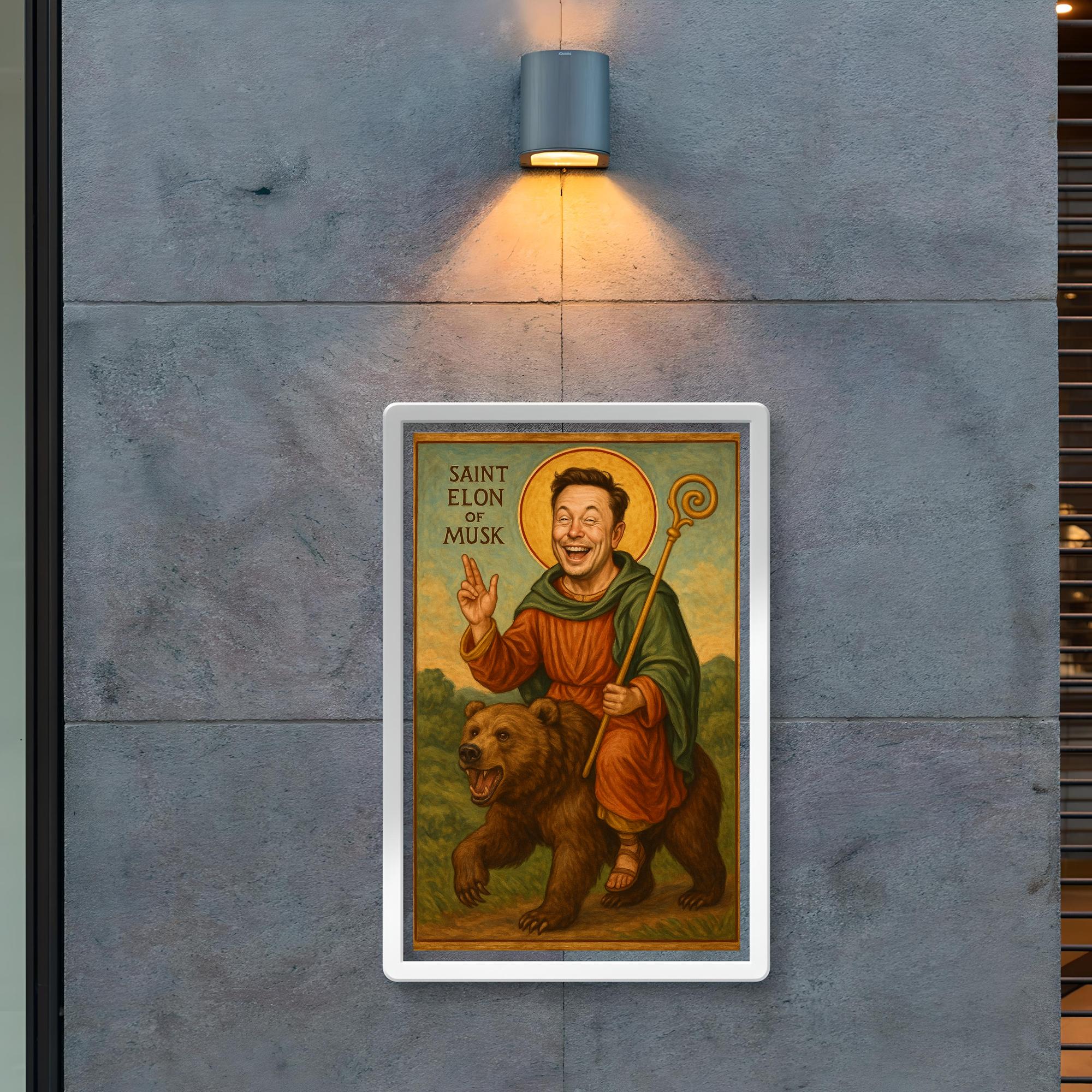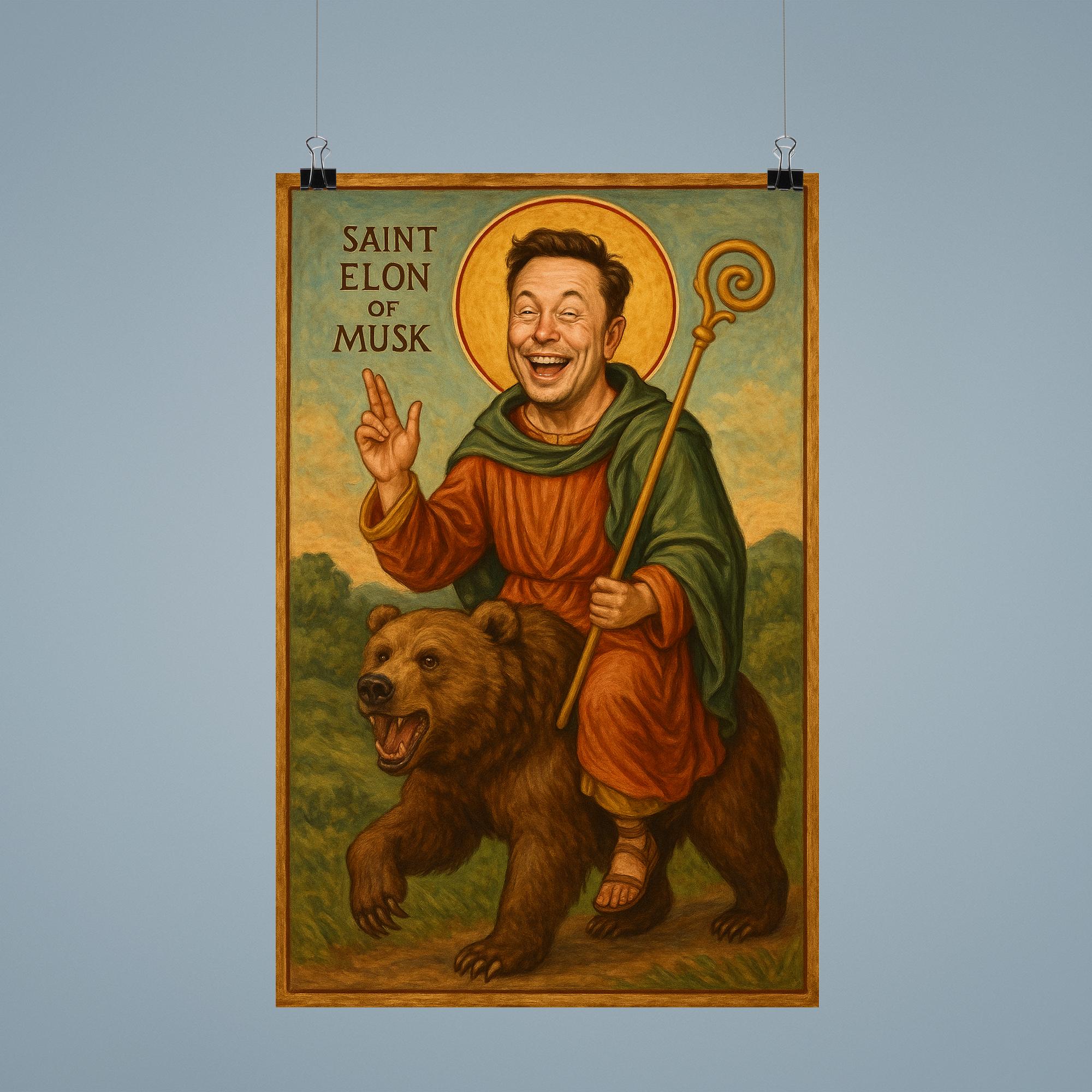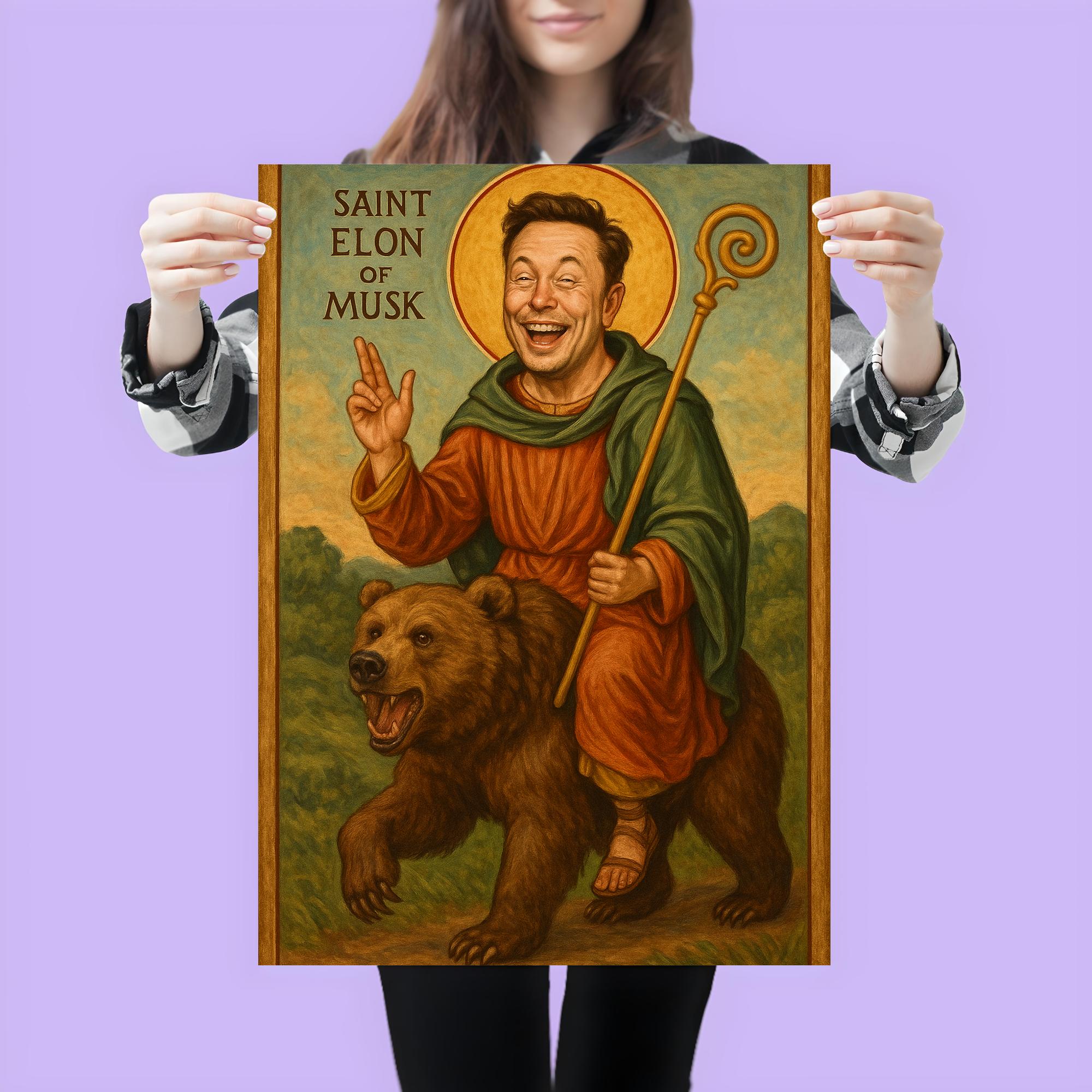Celebrate the fearless spirit of innovation with this striking poster of Saint Elon of Musk riding a bear. A bold tribute to visionary courage and unstoppable drive, this artwork captures a powerful symbol of strength and pioneering ambition—perfect for inspiring your space every day.