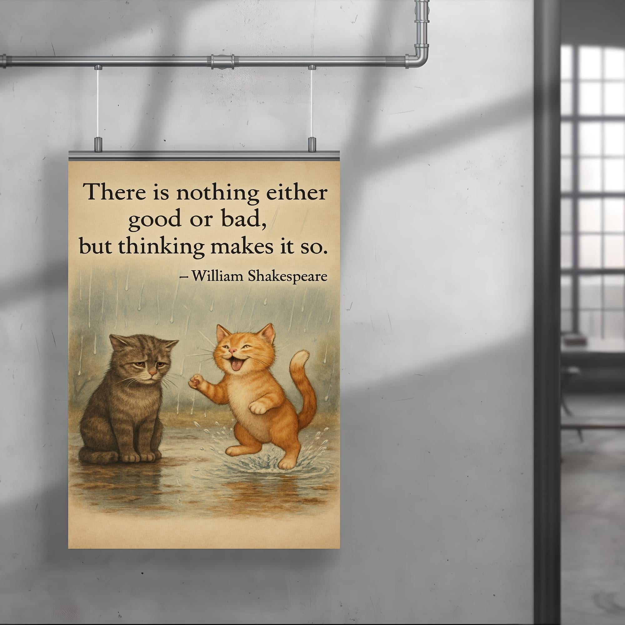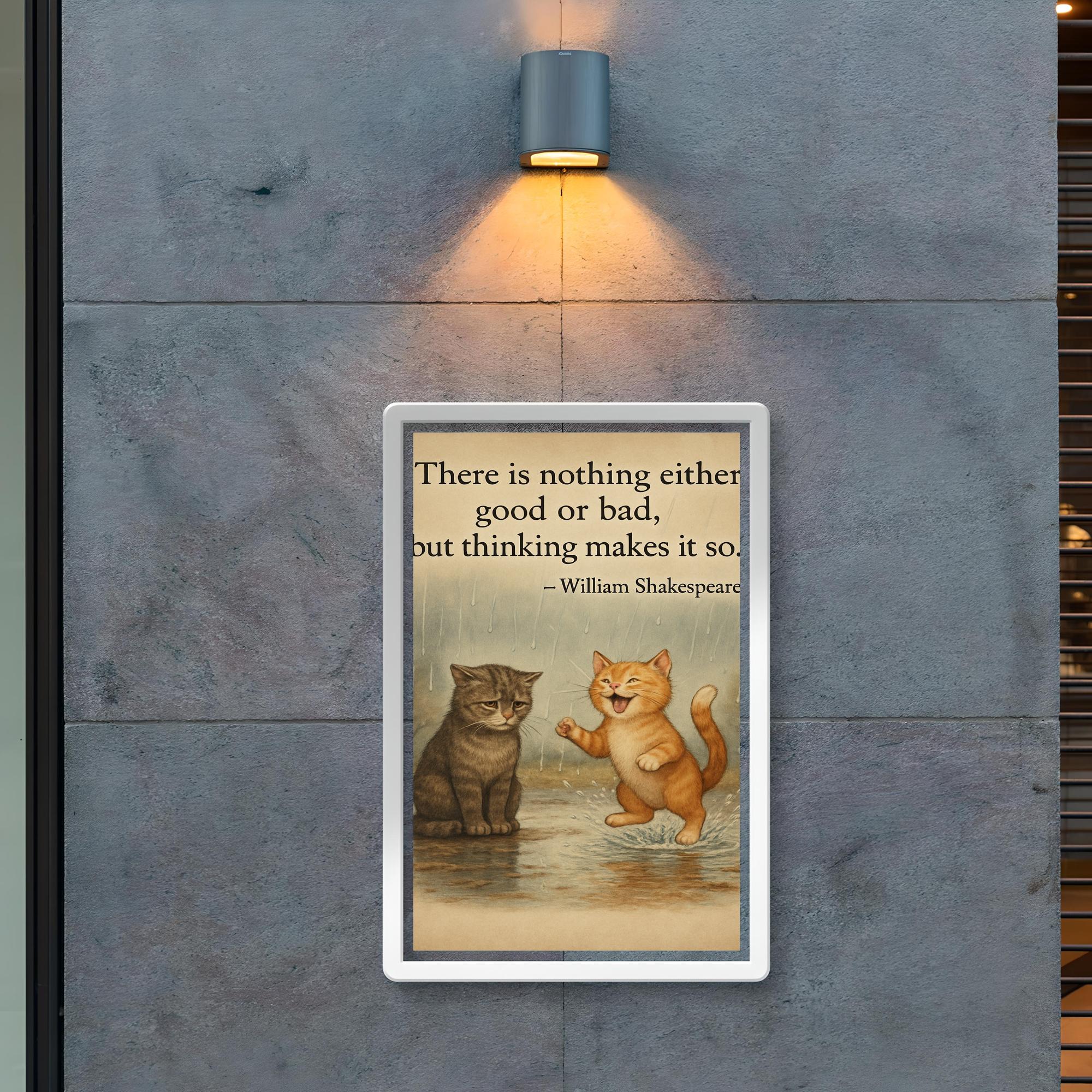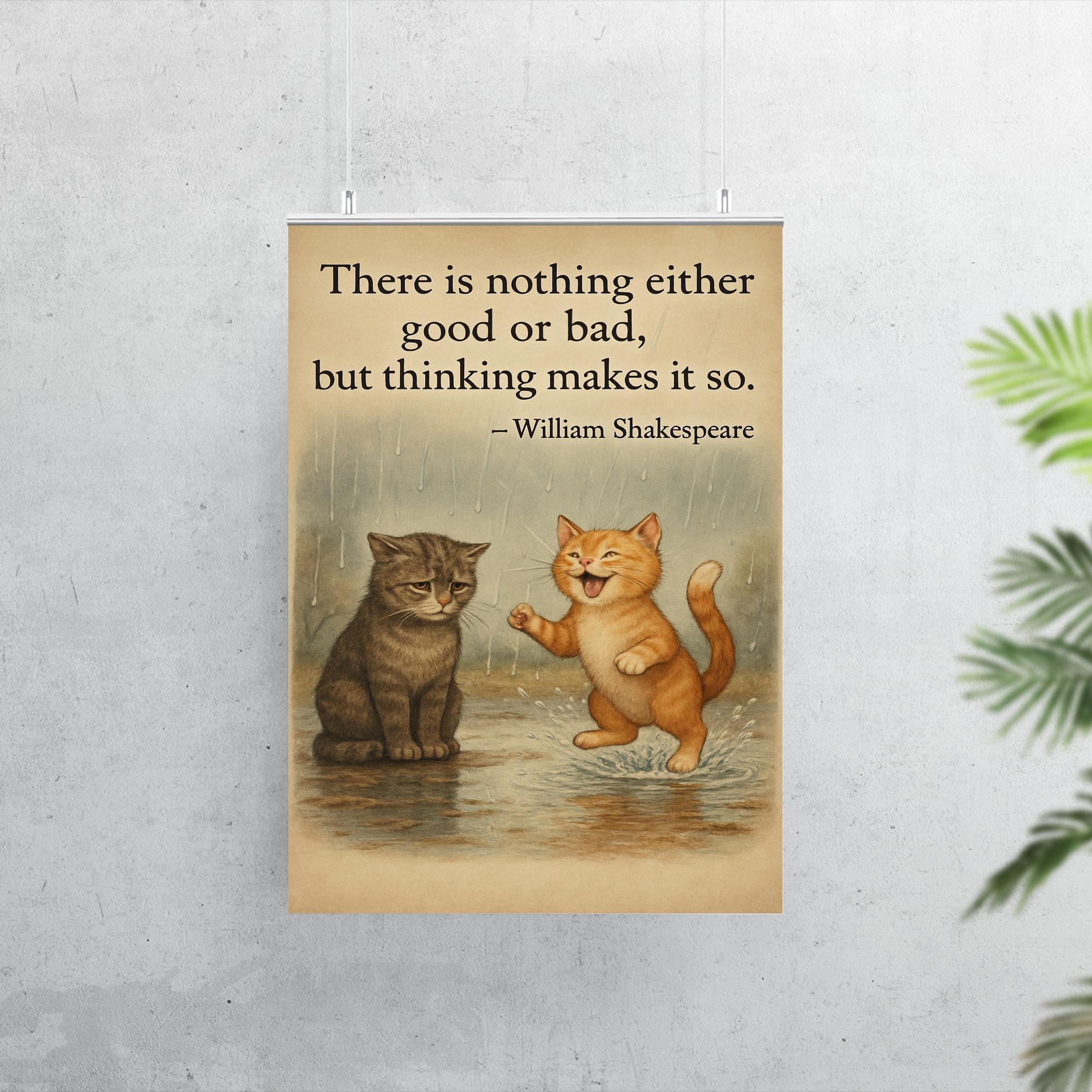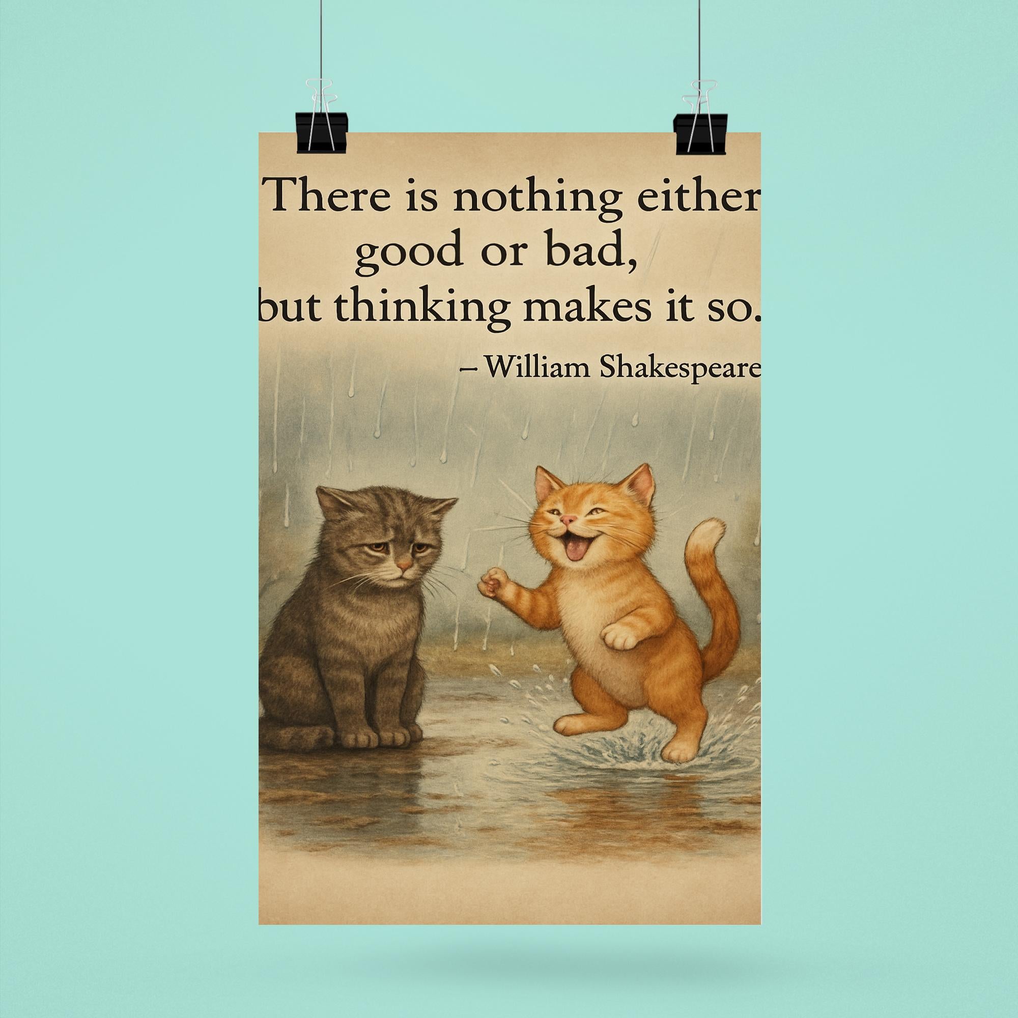 Bring a touch of timeless wisdom and whimsical charm to any space with this inspiring poster featuring a Shakespeare quote alongside two cats on a rainy day—one joyful, one melancholic. Perfect for those who find beauty in life’s contrasts, this artwork invites reflection and uplifts the spirit, making it a meaningful addition to your home or office.