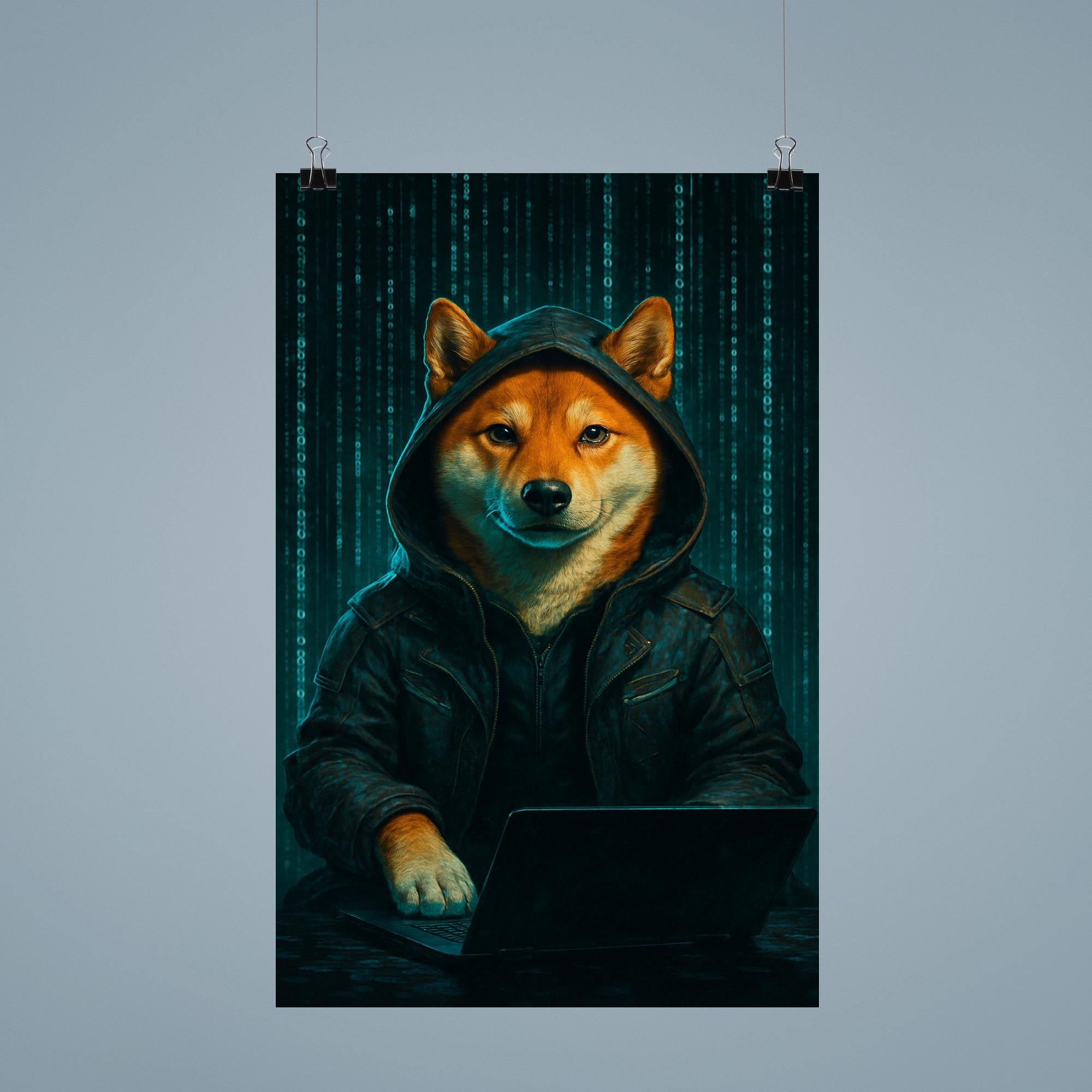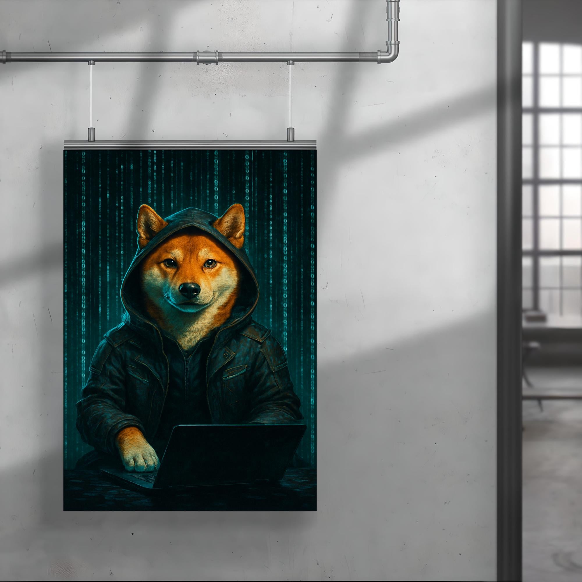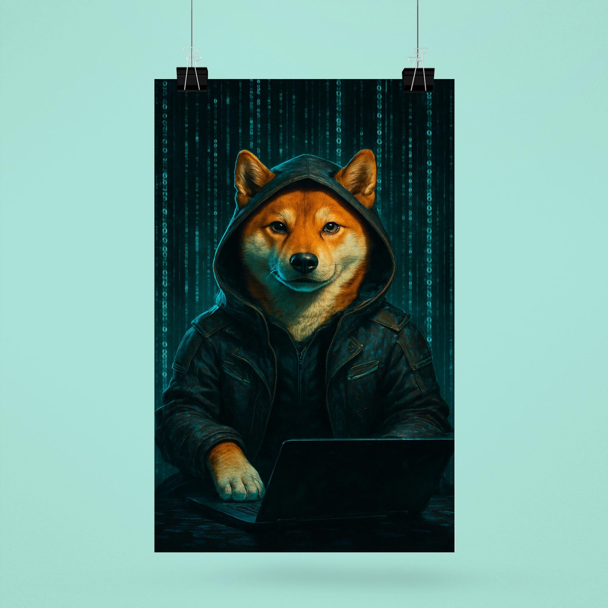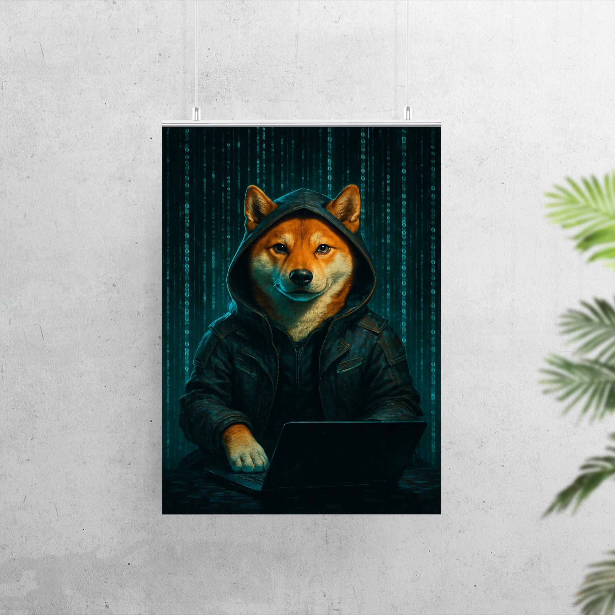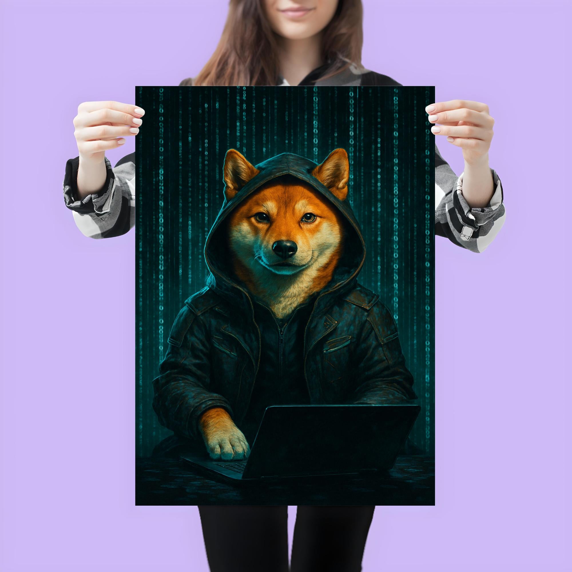 Immerse yourself in a futuristic world with this striking poster featuring a Shiba Inu cyberpunk hacker enveloped by a cascade of digital code. Perfect for tech enthusiasts and fans of edgy, modern art, this piece blends bold energy with mysterious intrigue to electrify any space. Let this captivating image inspire your inner coder and bring a unique vibe to your walls.