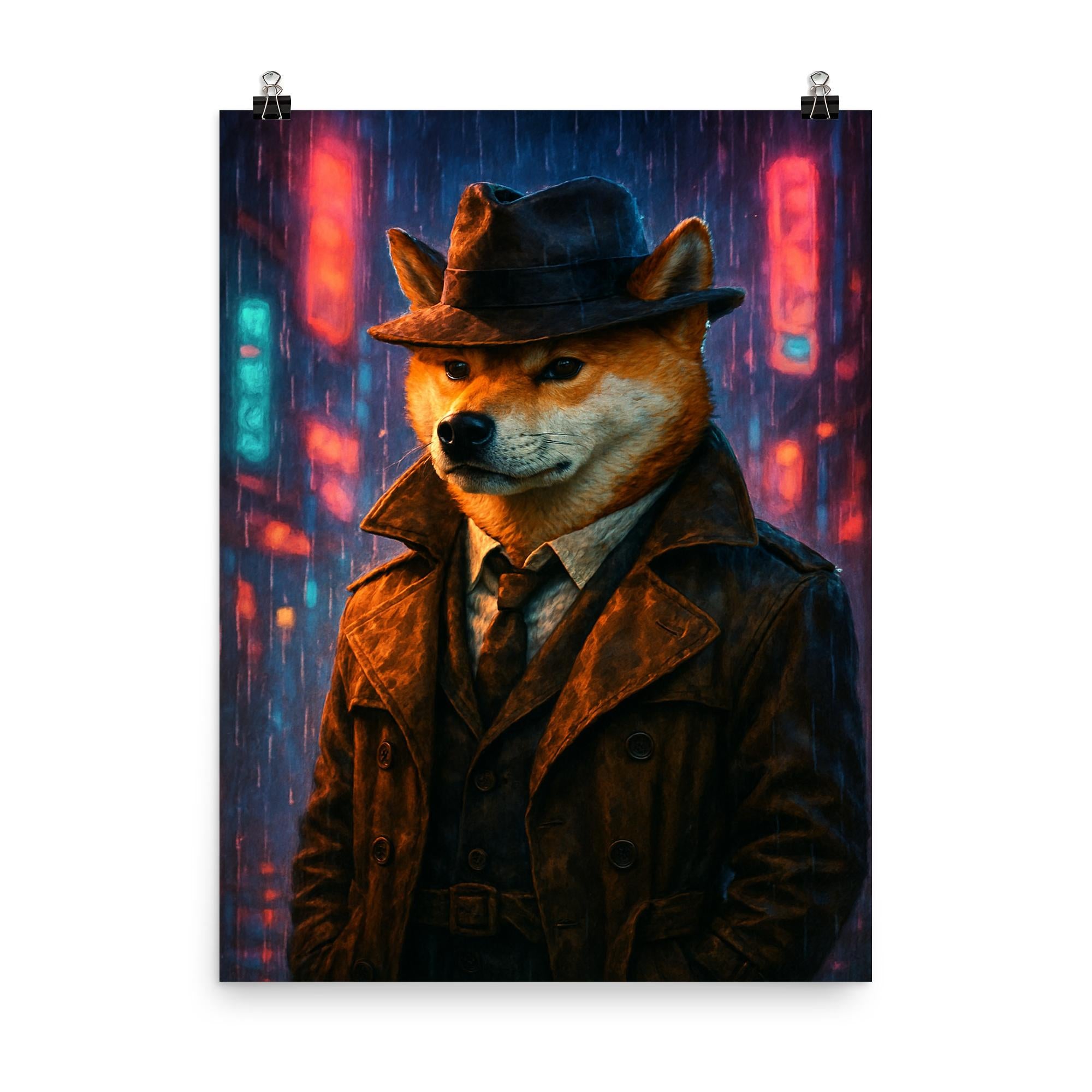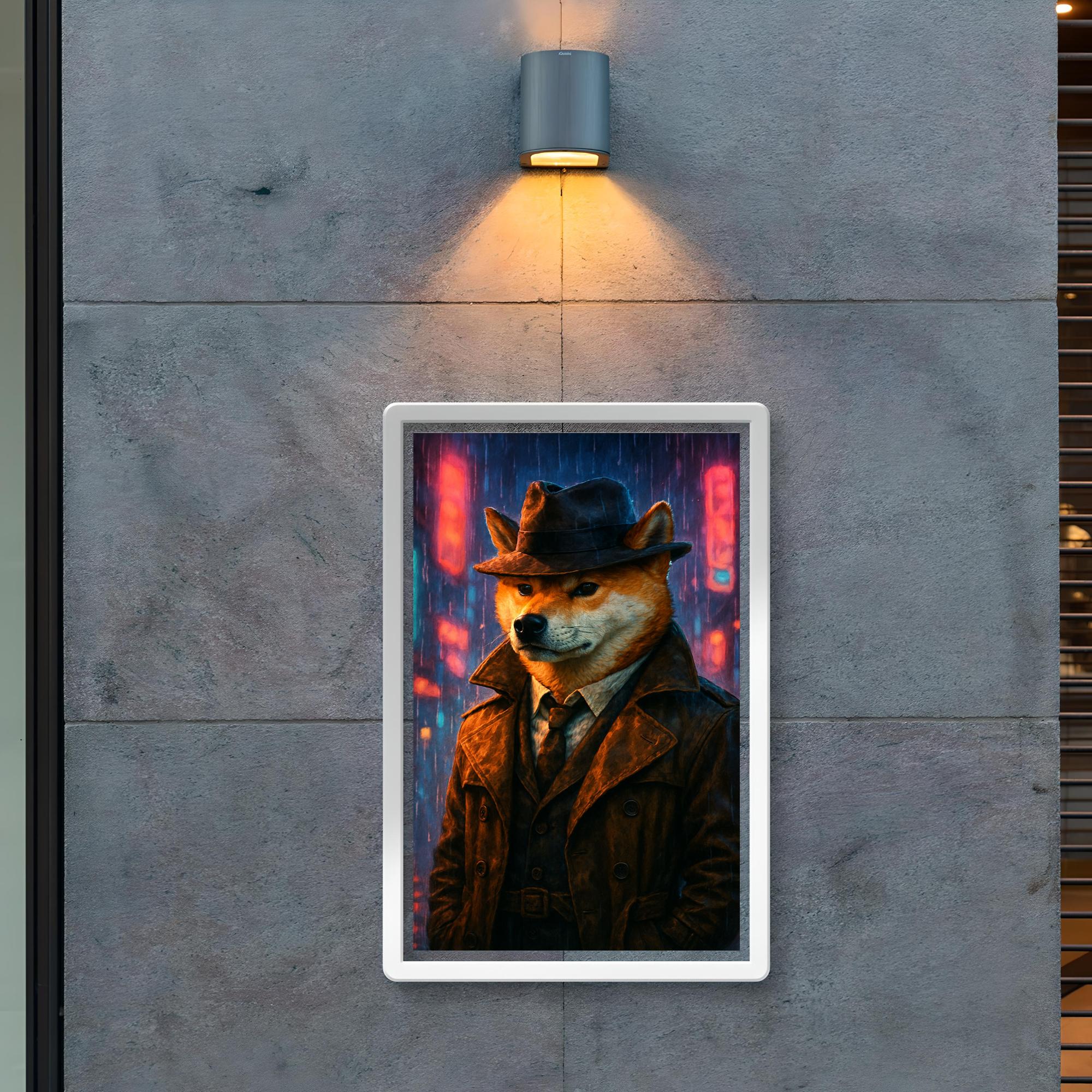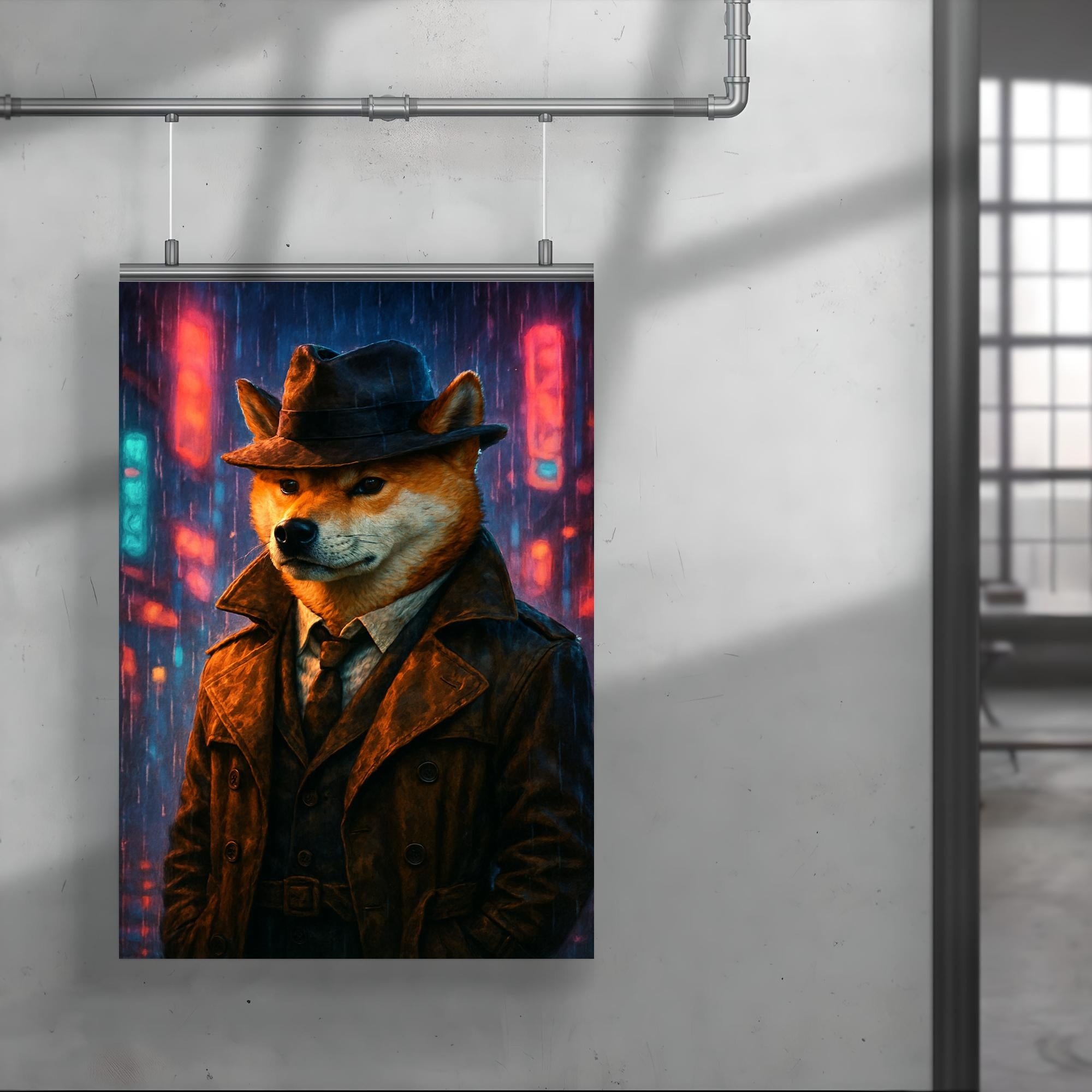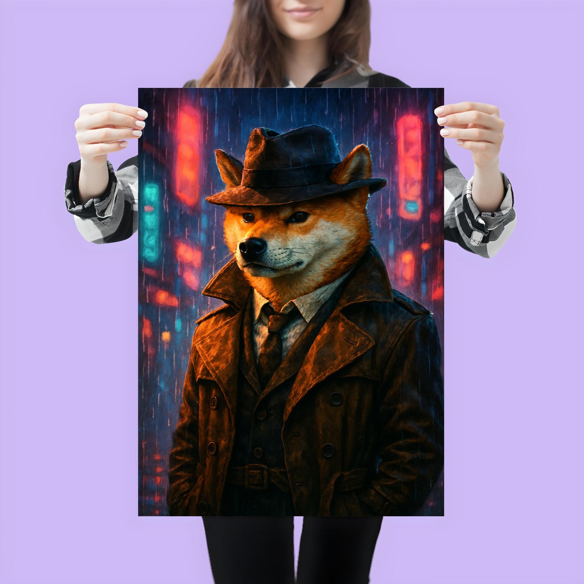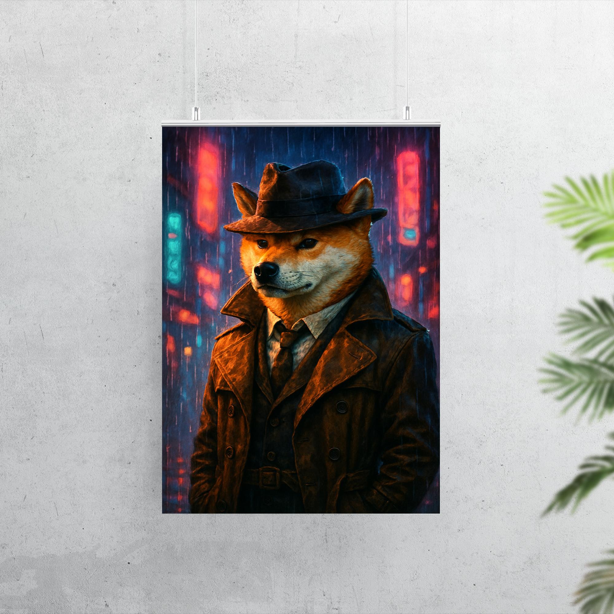Step into a world of mystery with this striking poster featuring a Shiba Inu detective, dressed in a trench coat beneath glowing neon rain. Perfect for adding a touch of noir-inspired charm and playful intrigue to any space, this piece captures the perfect blend of clever character and atmospheric style. Elevate your walls with this unique homage to canine curiosity and classic detective vibes.