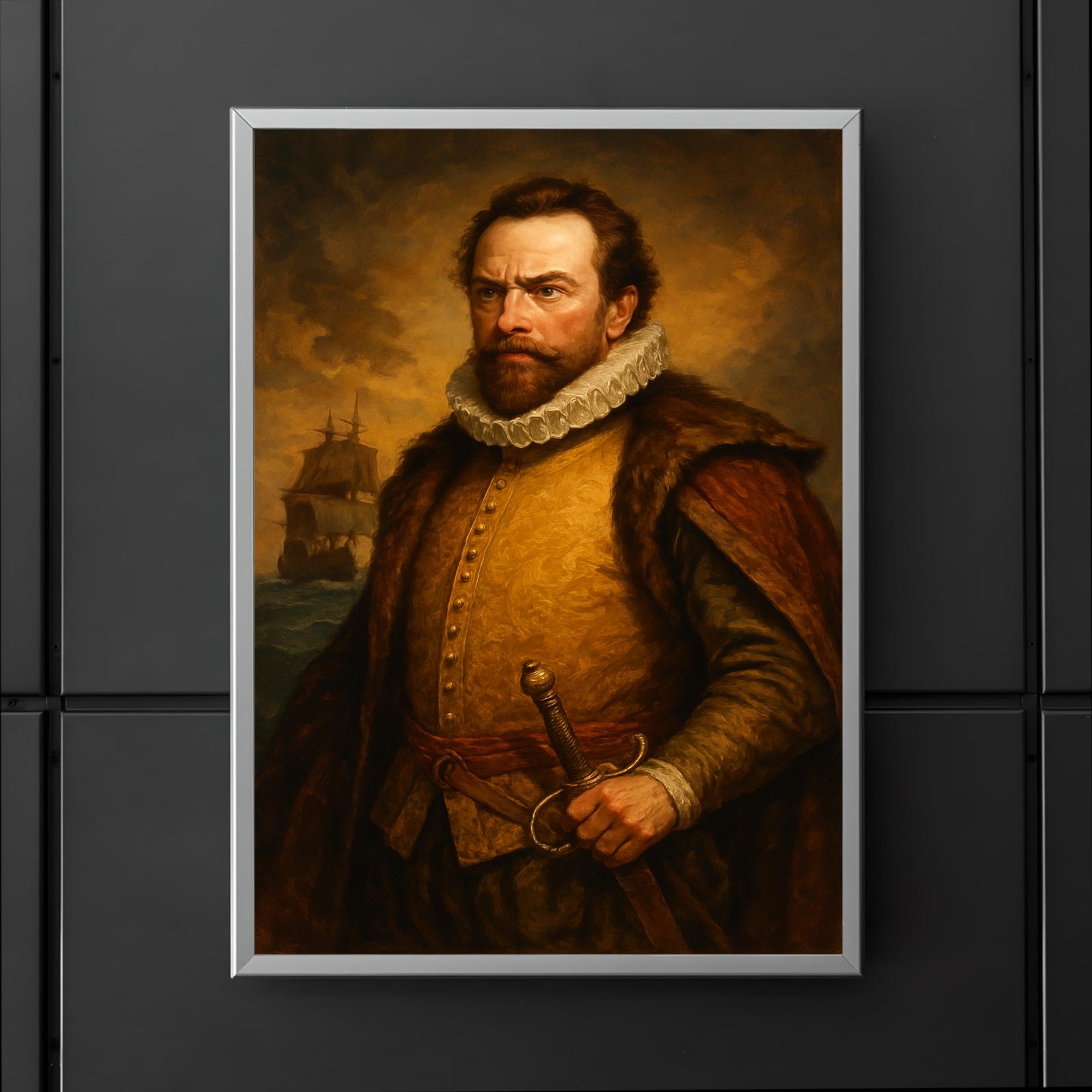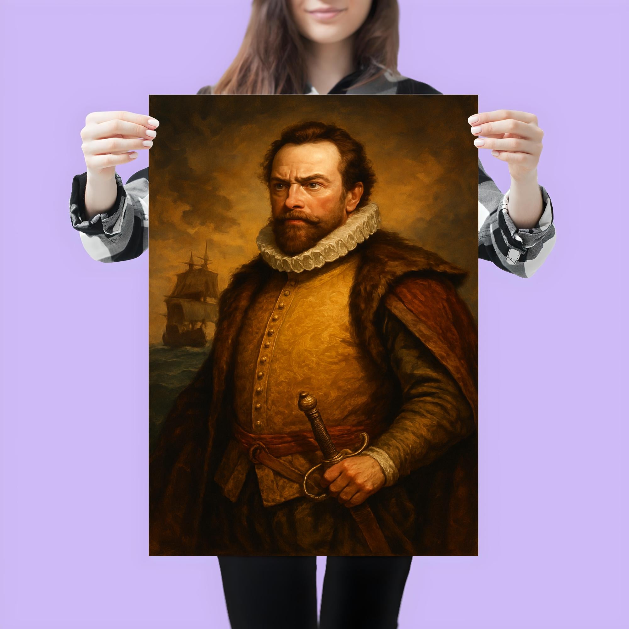 Celebrate the legacy of Sir Martin Frobisher with this striking poster, capturing the spirit of one of history’s most daring explorers. Perfect for history enthusiasts and admirers of maritime adventure, this piece adds a timeless touch of courage and discovery to any space. Elevate your collection with a tribute to a true pioneer of the age of exploration.