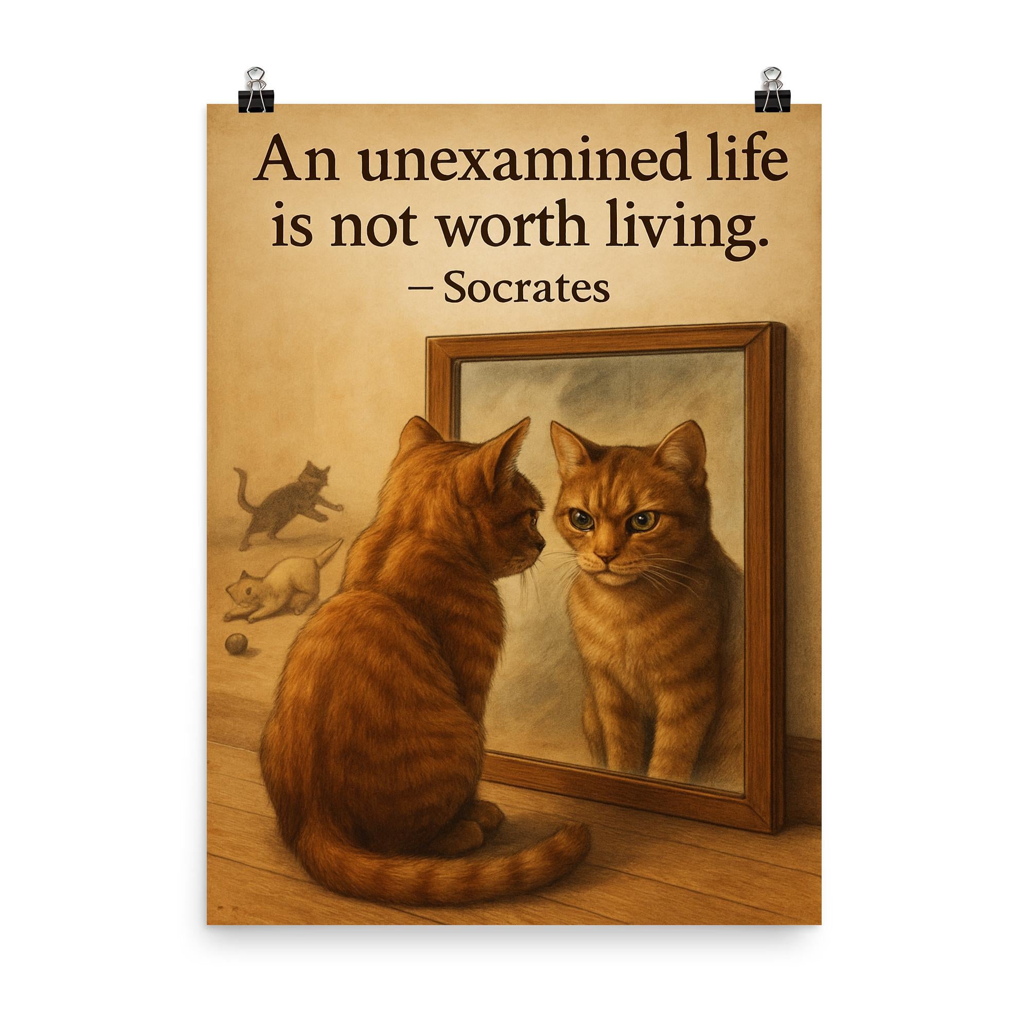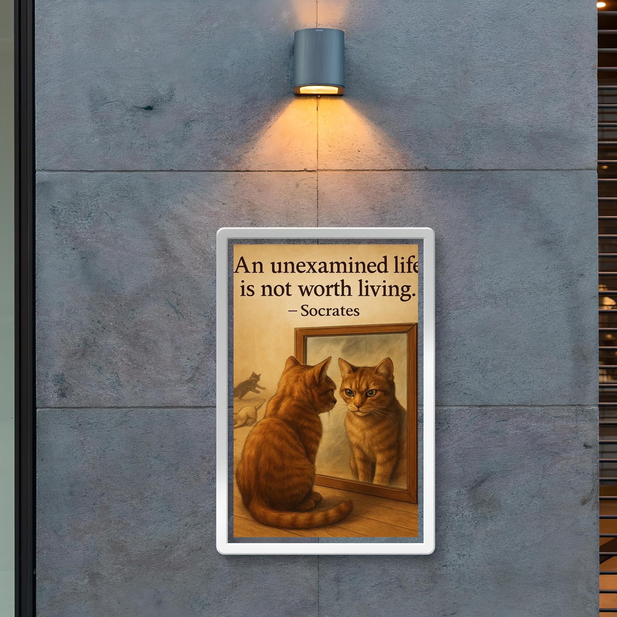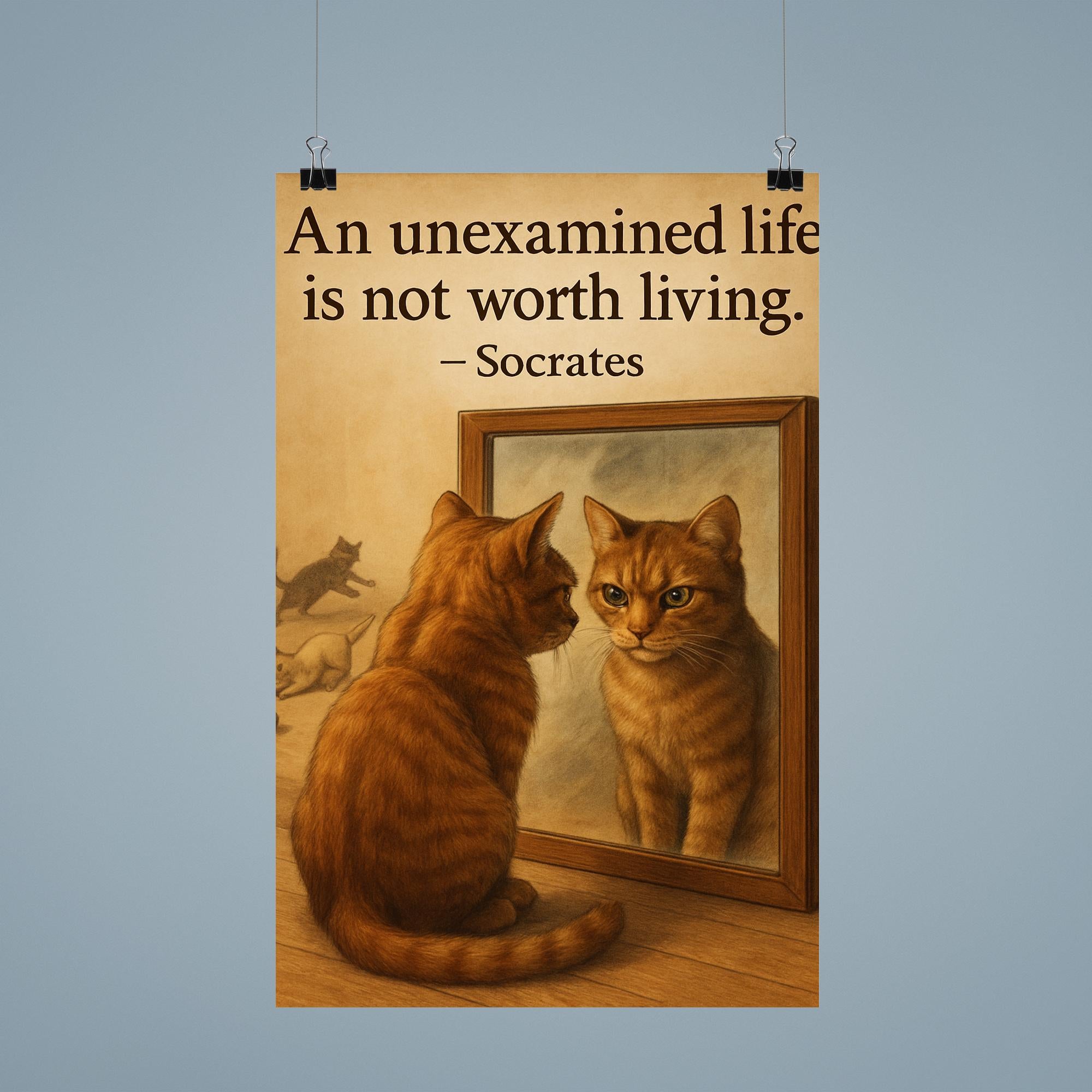 Invite timeless wisdom into your space with this striking poster featuring Socrates' iconic quote, "The unexamined life is not worth living." Paired with a powerful image of a cat staring thoughtfully at its own reflection among other cats, it sparks reflection and curiosity every time you see it. Perfect for sparking deep thought and inspiring introspection in any room.
