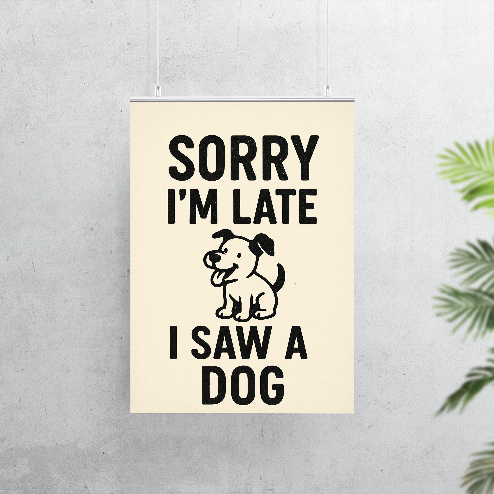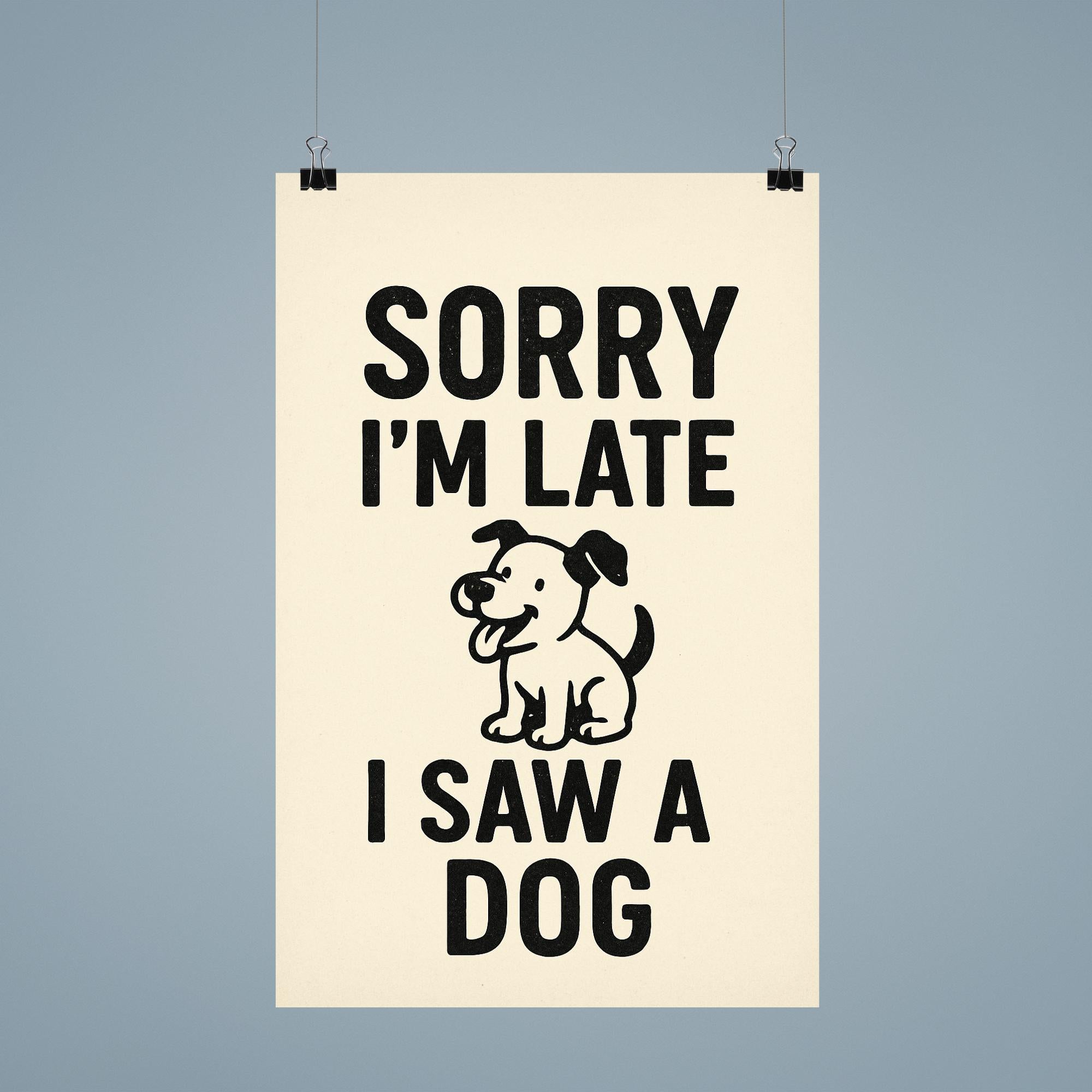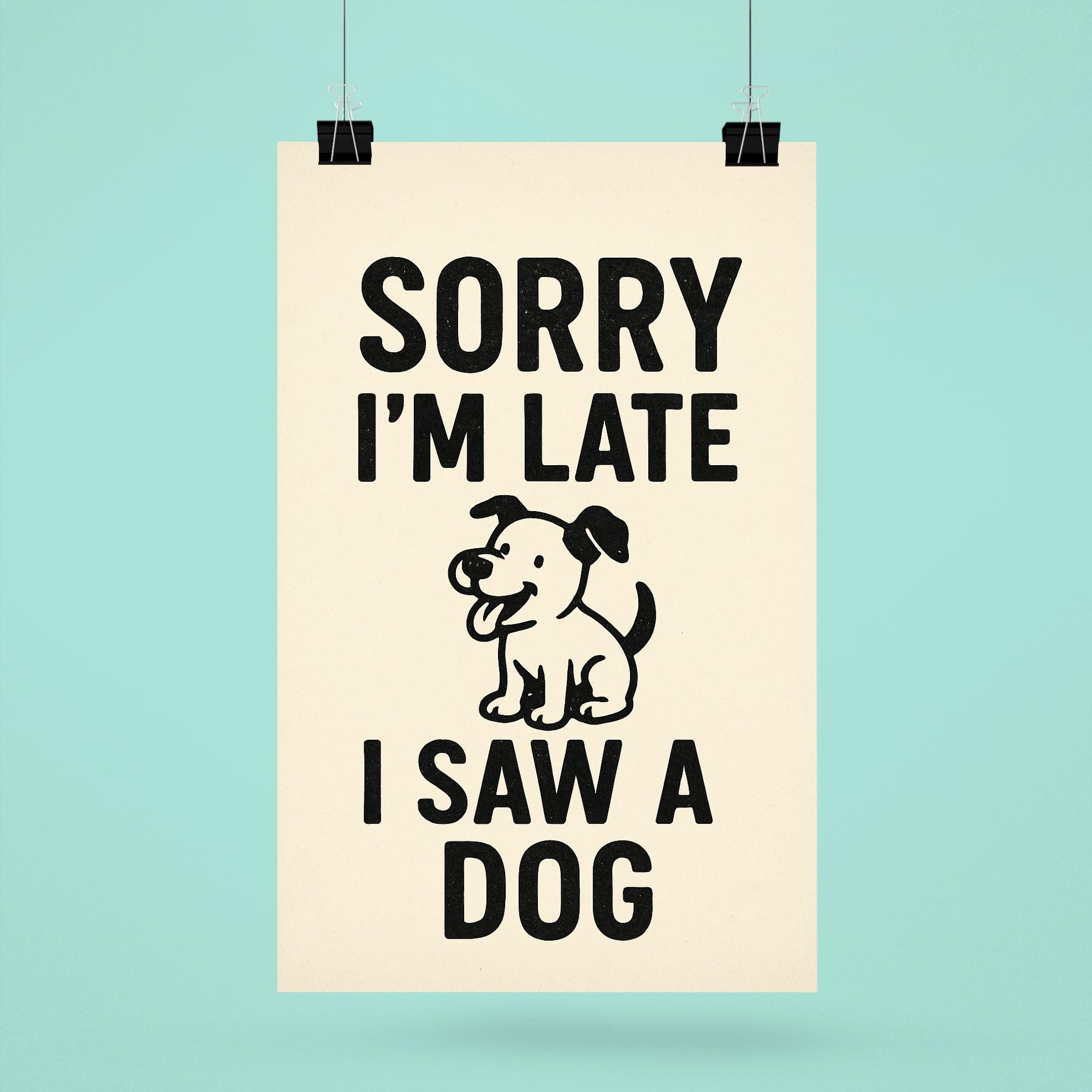 Brighten up your space—and your mood—with this playful "Sorry I’m late I saw a dog" poster. It's the perfect conversation starter for every dog lover who knows the struggle of irresistible canine distractions. Hang it in your home, office, or classroom for a daily dose of humor that everyone can relate to.