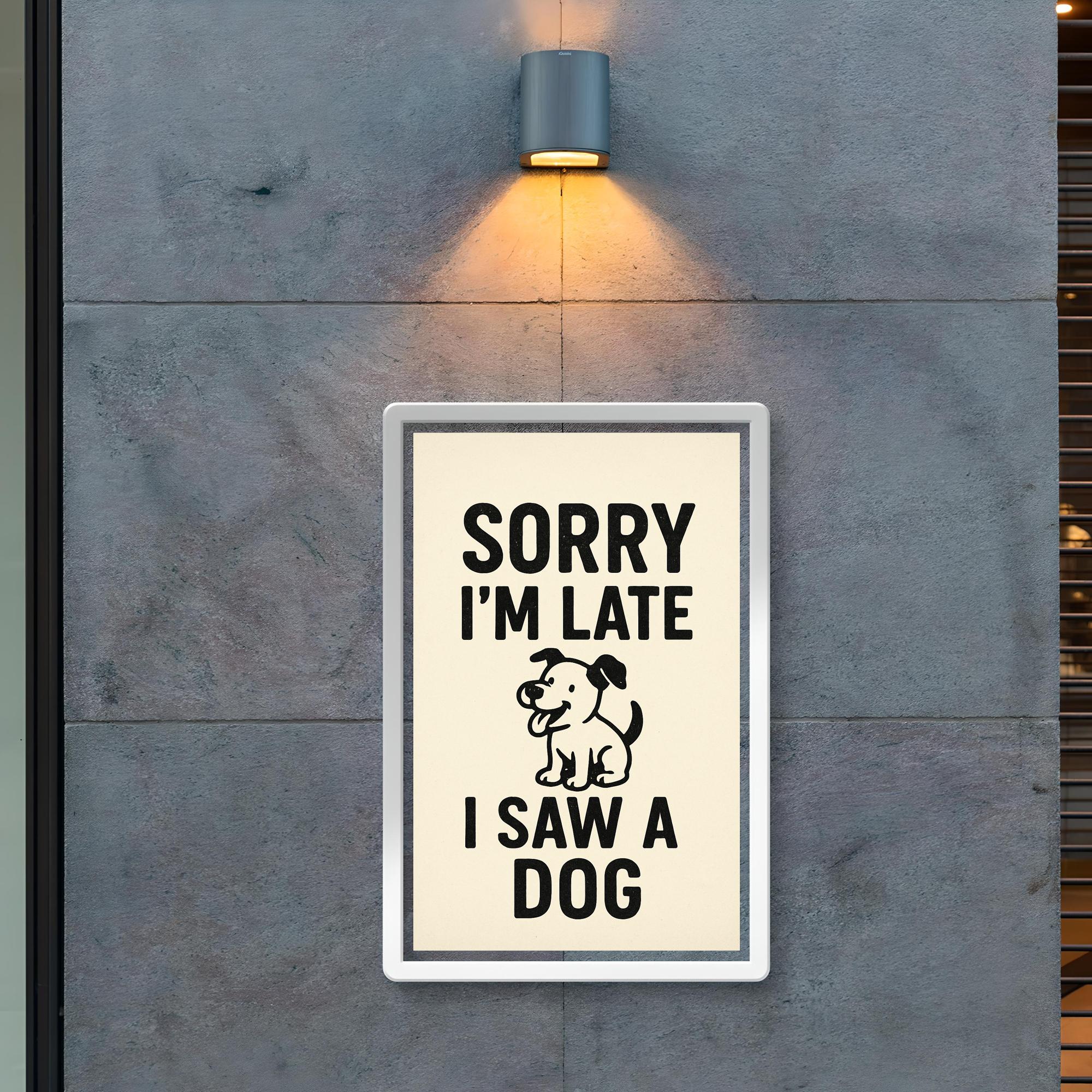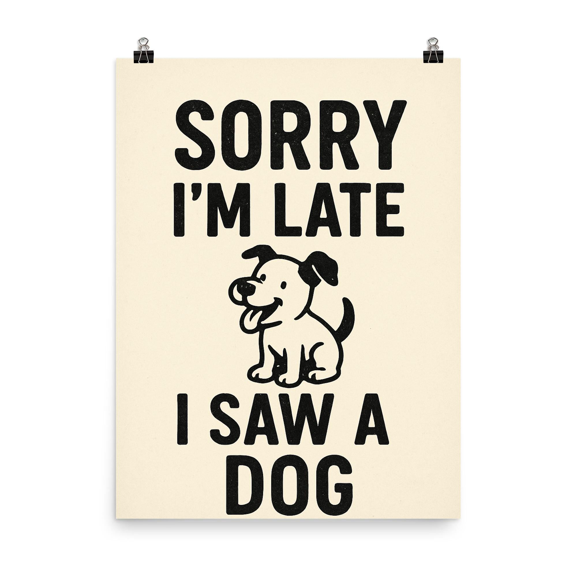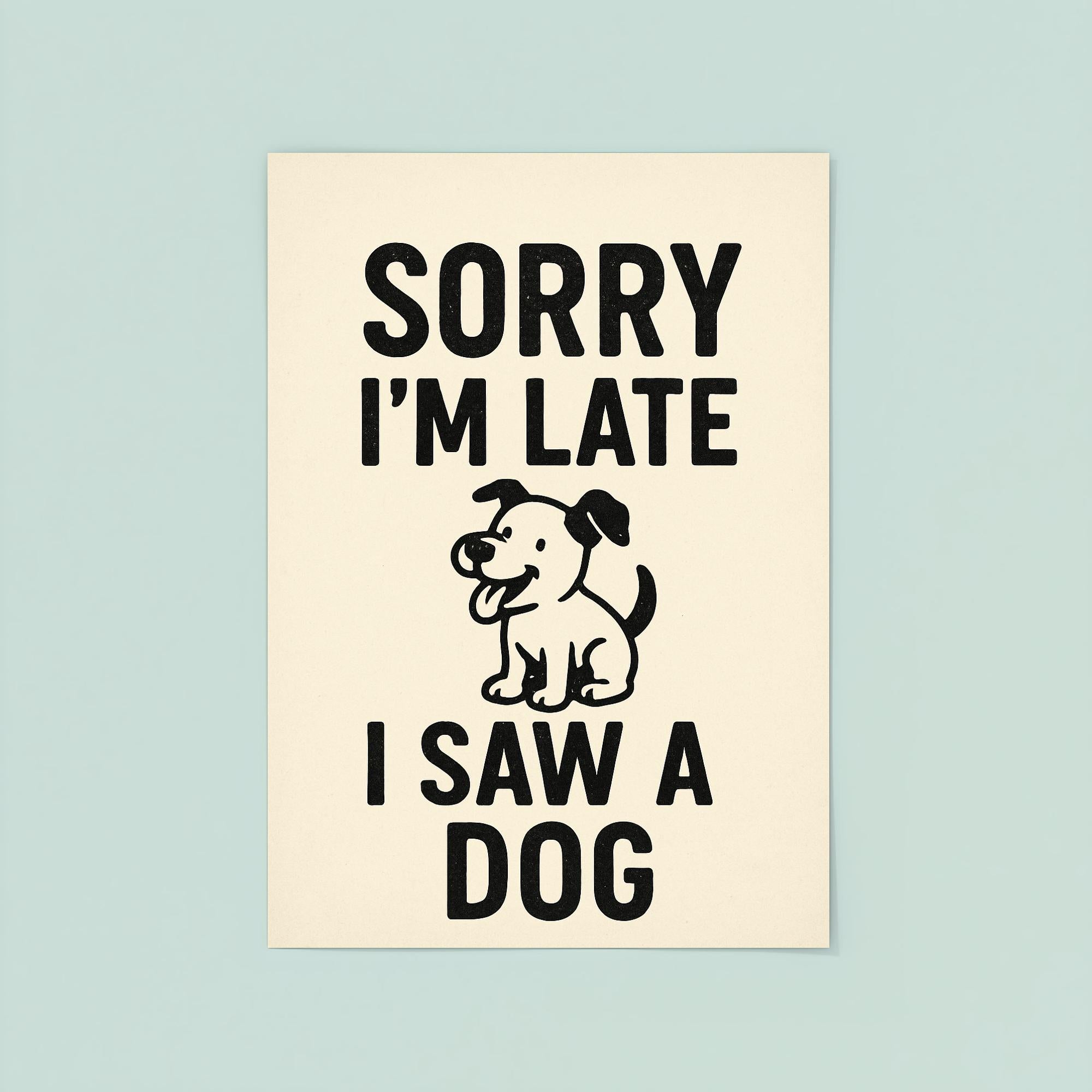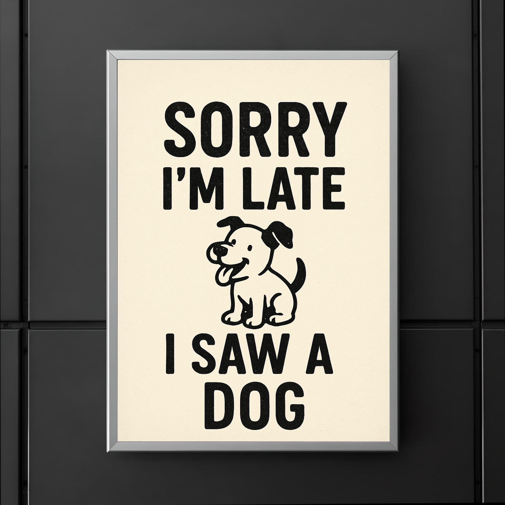 Brighten up your space—and your mood—with this playful "Sorry I’m late I saw a dog" poster. It's the perfect conversation starter for every dog lover who knows the struggle of irresistible canine distractions. Hang it in your home, office, or classroom for a daily dose of humor that everyone can relate to.