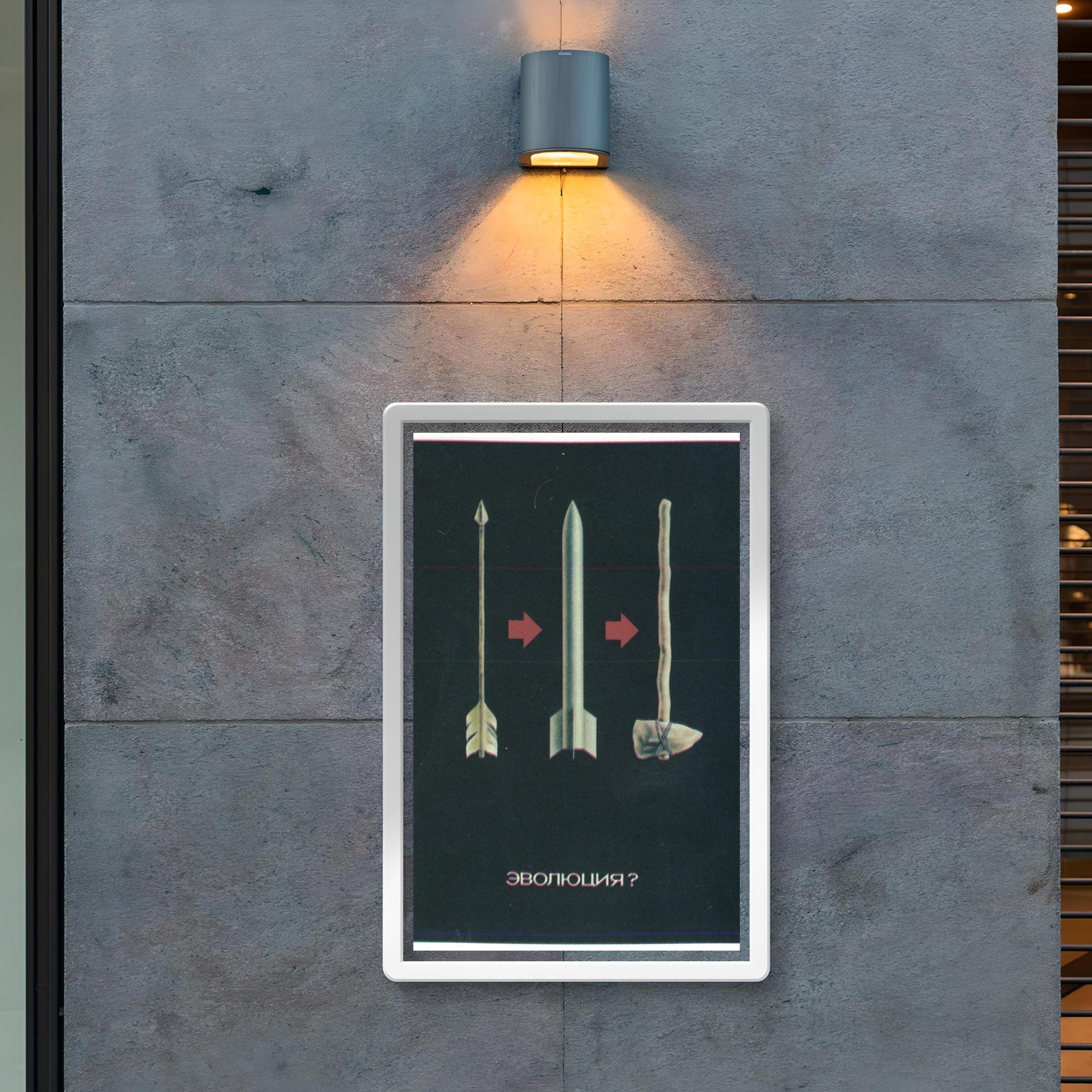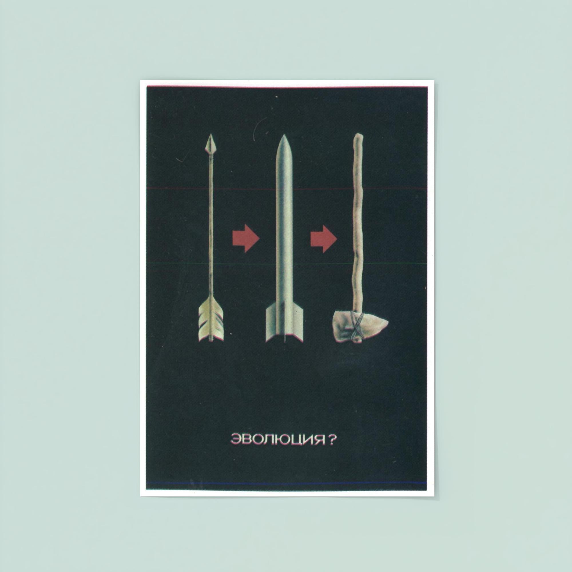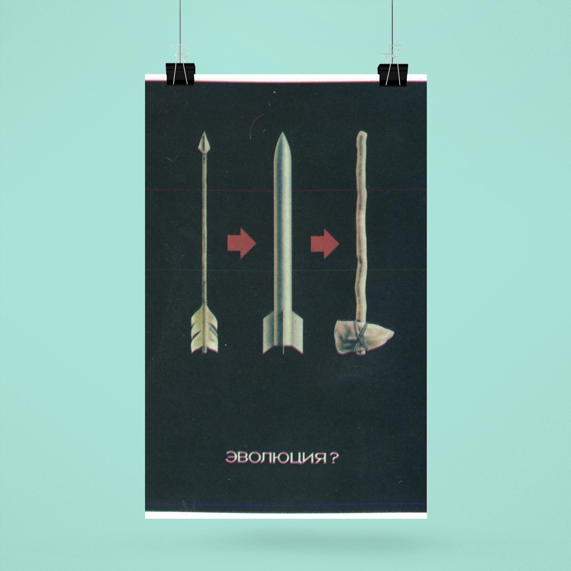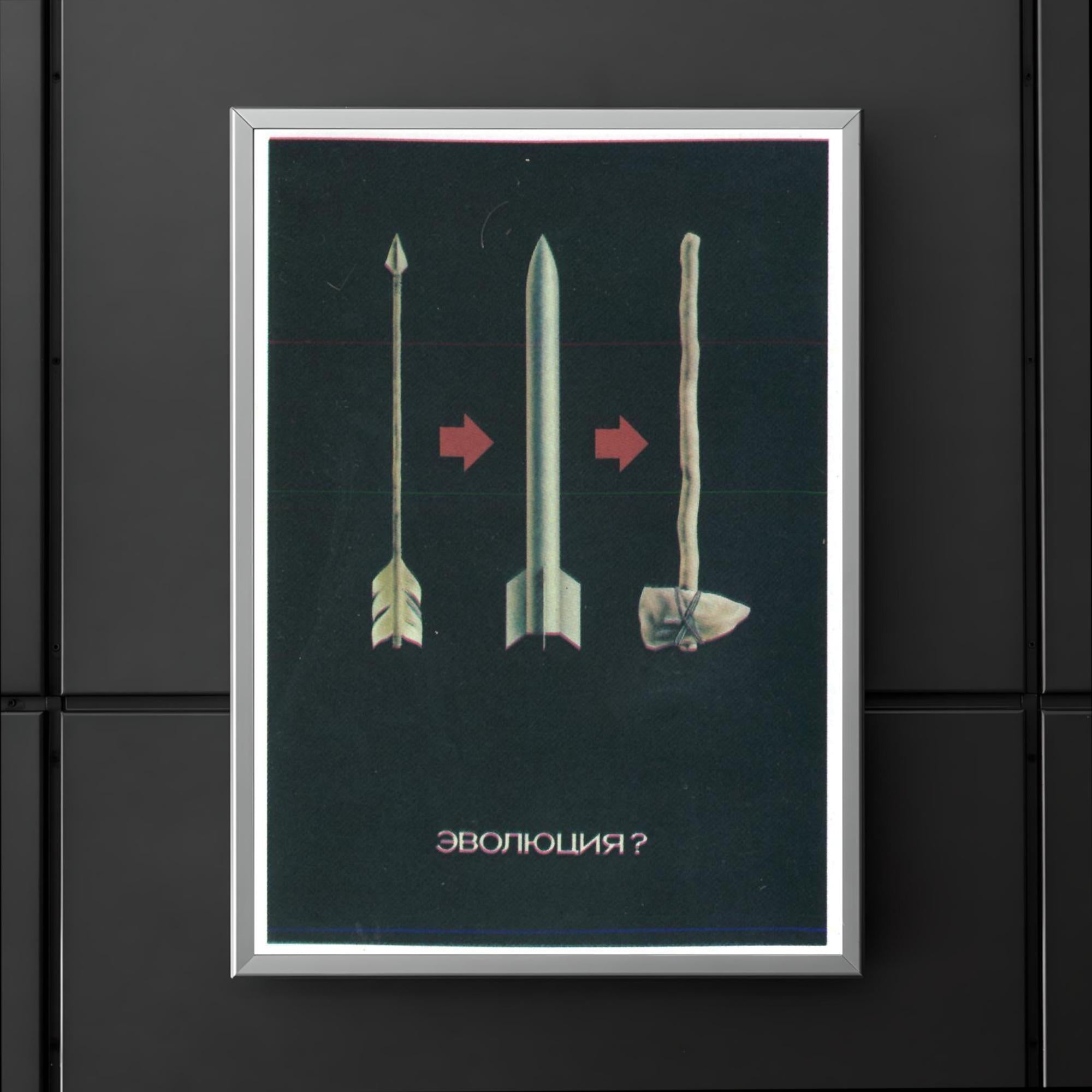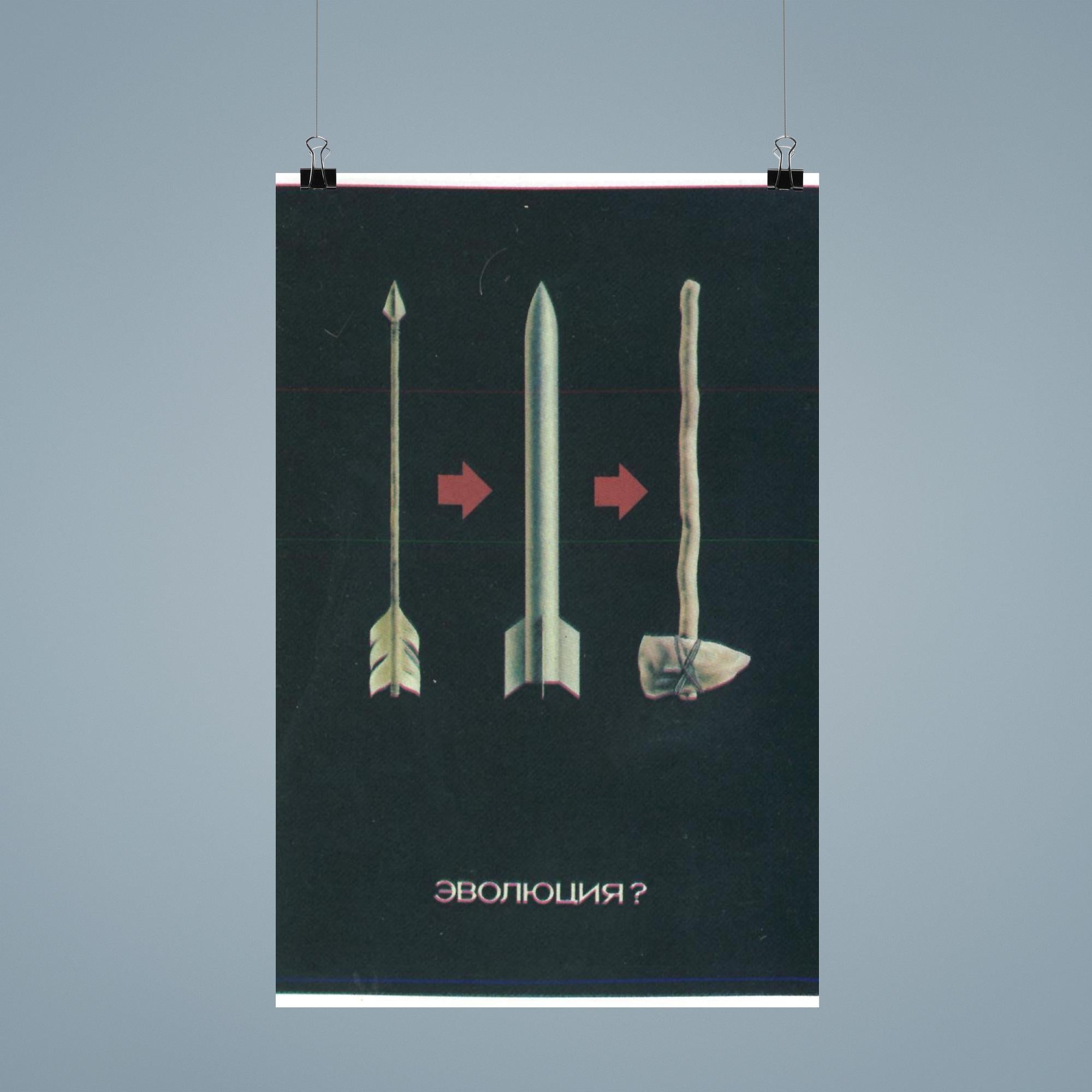 Step back into a pivotal era with this striking Soviet Anti-Nuke poster titled "Evolution?" from the 1970s or 1980s. Its powerful message challenges the notion of progress through the lens of nuclear disarmament, offering a thought-provoking glimpse into Cold War anxieties and hopes. A bold conversation piece, this poster embodies a moment in history when creativity met urgent activism.