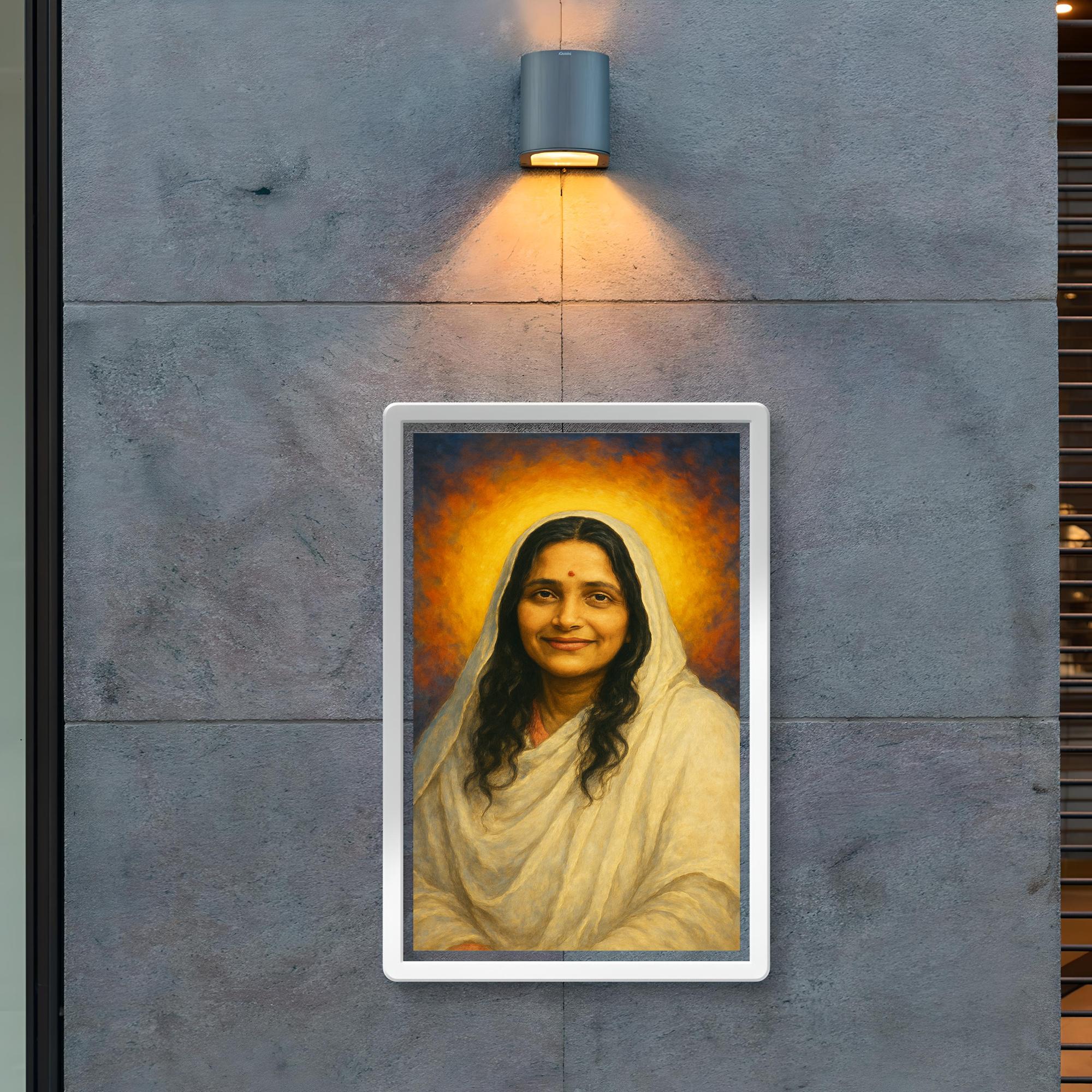 Celebrate the timeless wisdom and radiant presence of Sri Anandamayi Ma with this exquisite poster. Designed to inspire serenity and spiritual connection, it brings the gentle grace and profound peace of this revered saint into your sacred space. Perfect for meditation corners, living rooms, or any place where calm and insight are cherished.