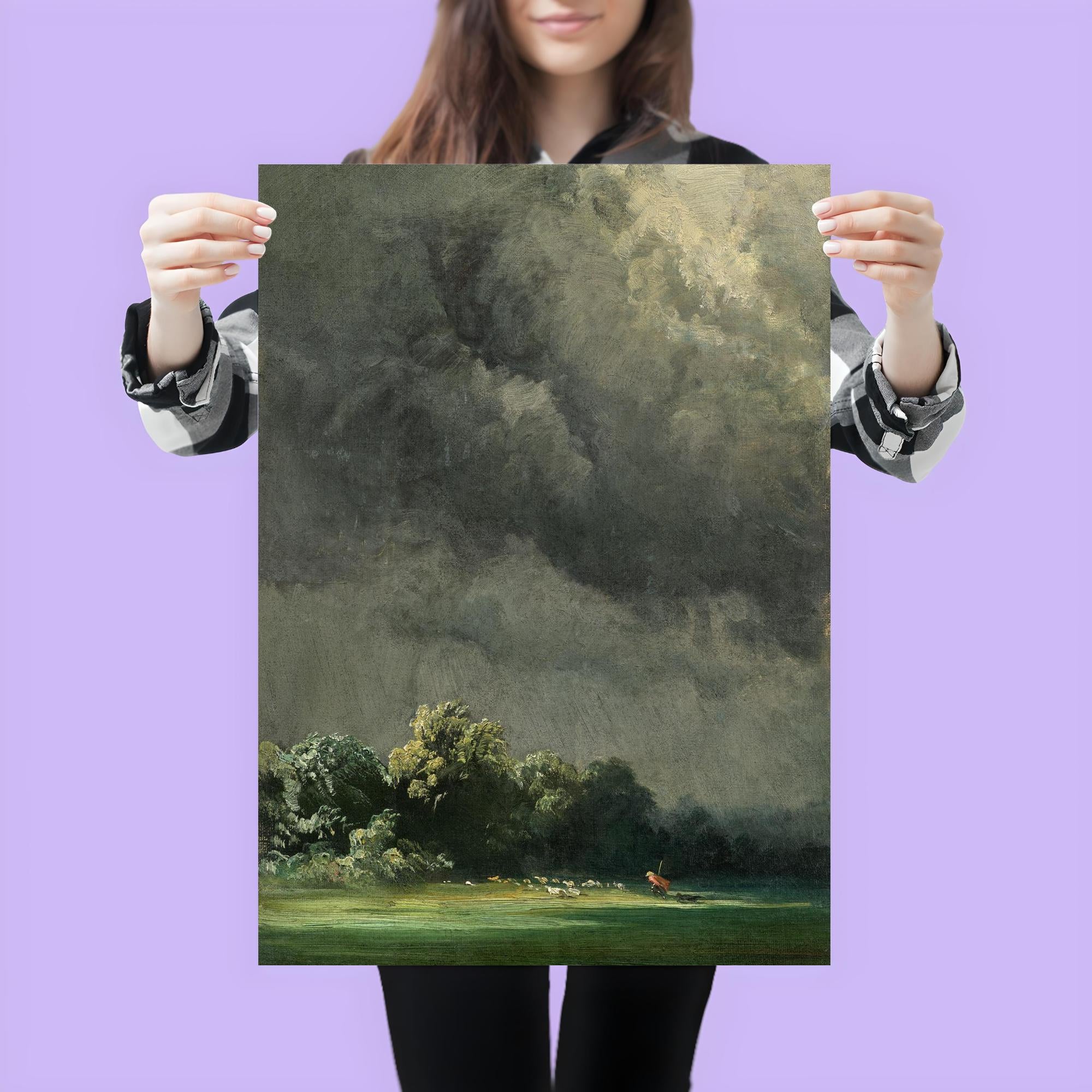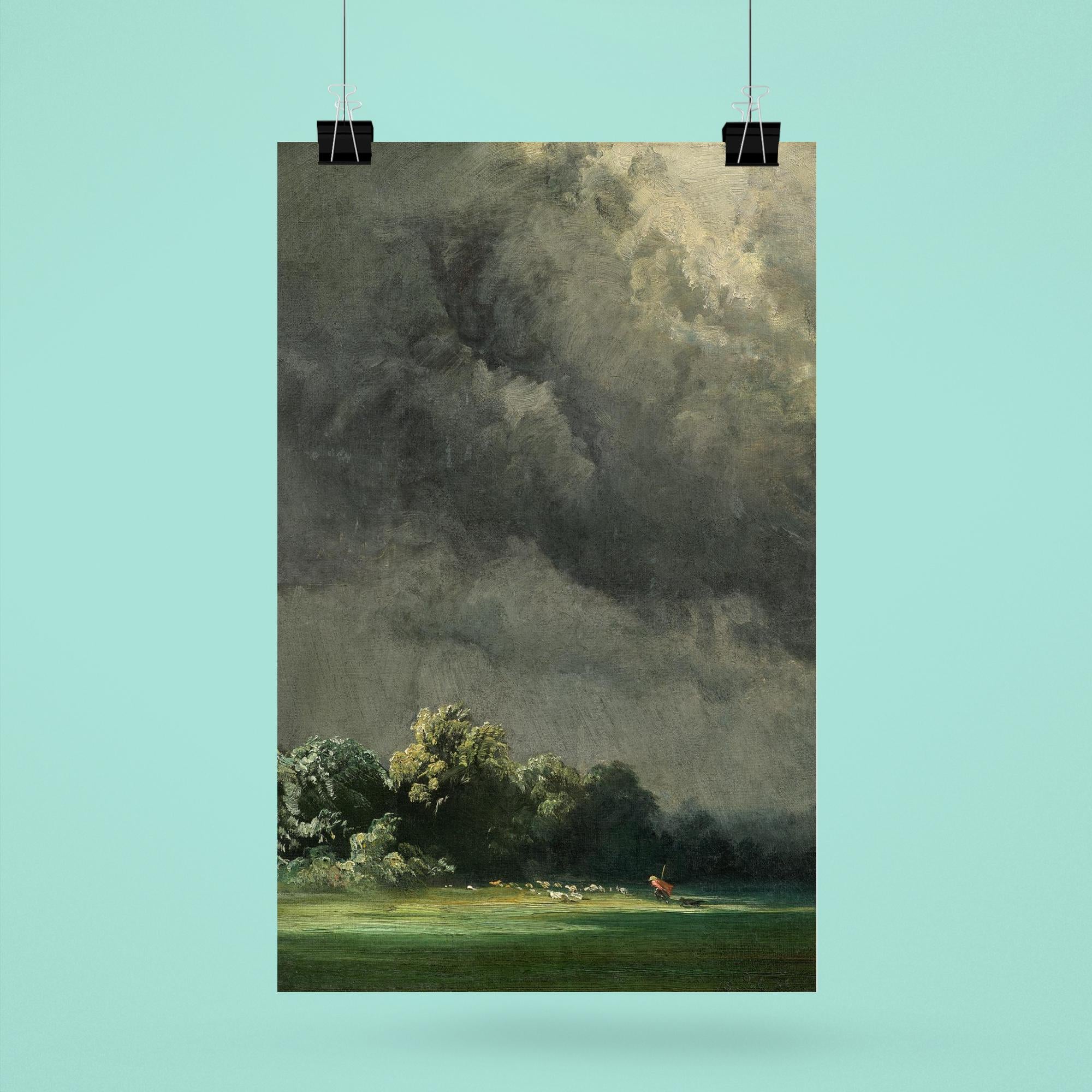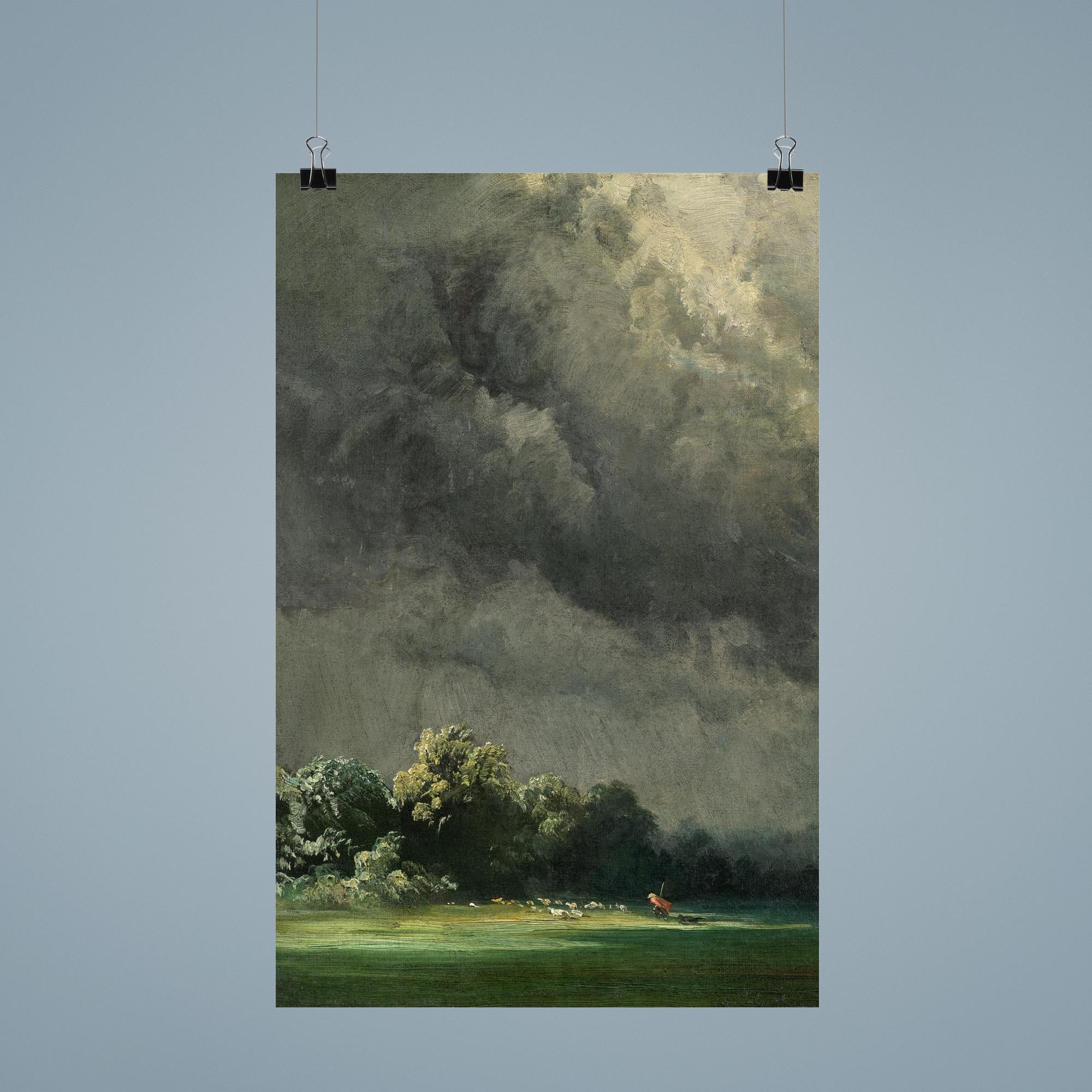 Immerse yourself in the raw power of nature with "Storm-Ridden Landscape" by Robert Zünd, painted in 1854. This timeless masterpiece captures the dramatic tension of a tempestuous sky meeting a rugged terrain, inviting you to experience the sublime beauty of the natural world. Perfect for lovers of classic art and atmospheric scenes, this poster brings a stirring sense of depth and emotion to any space.