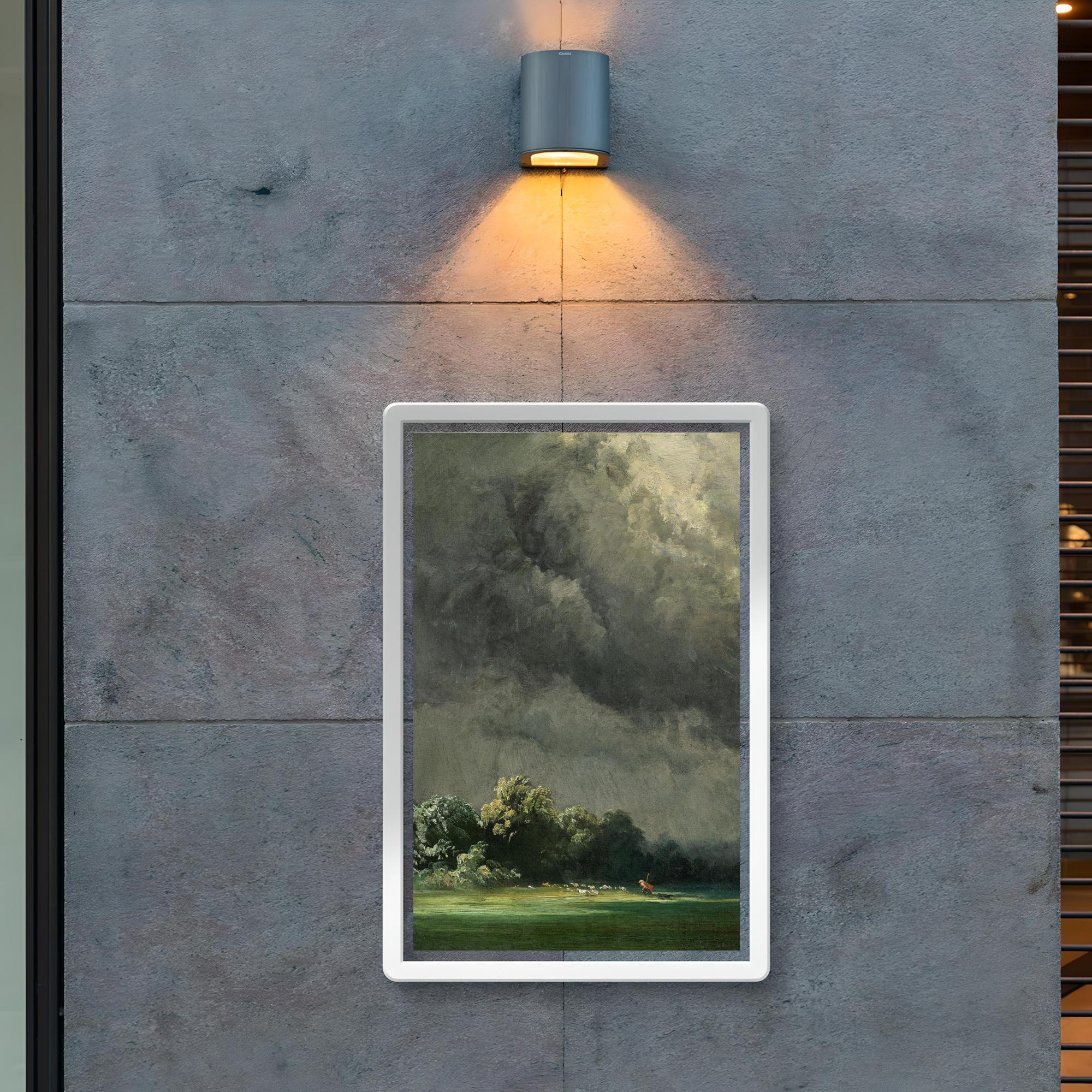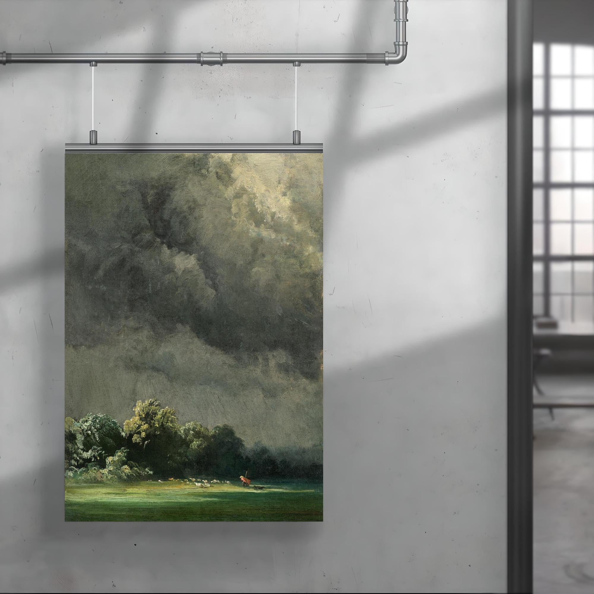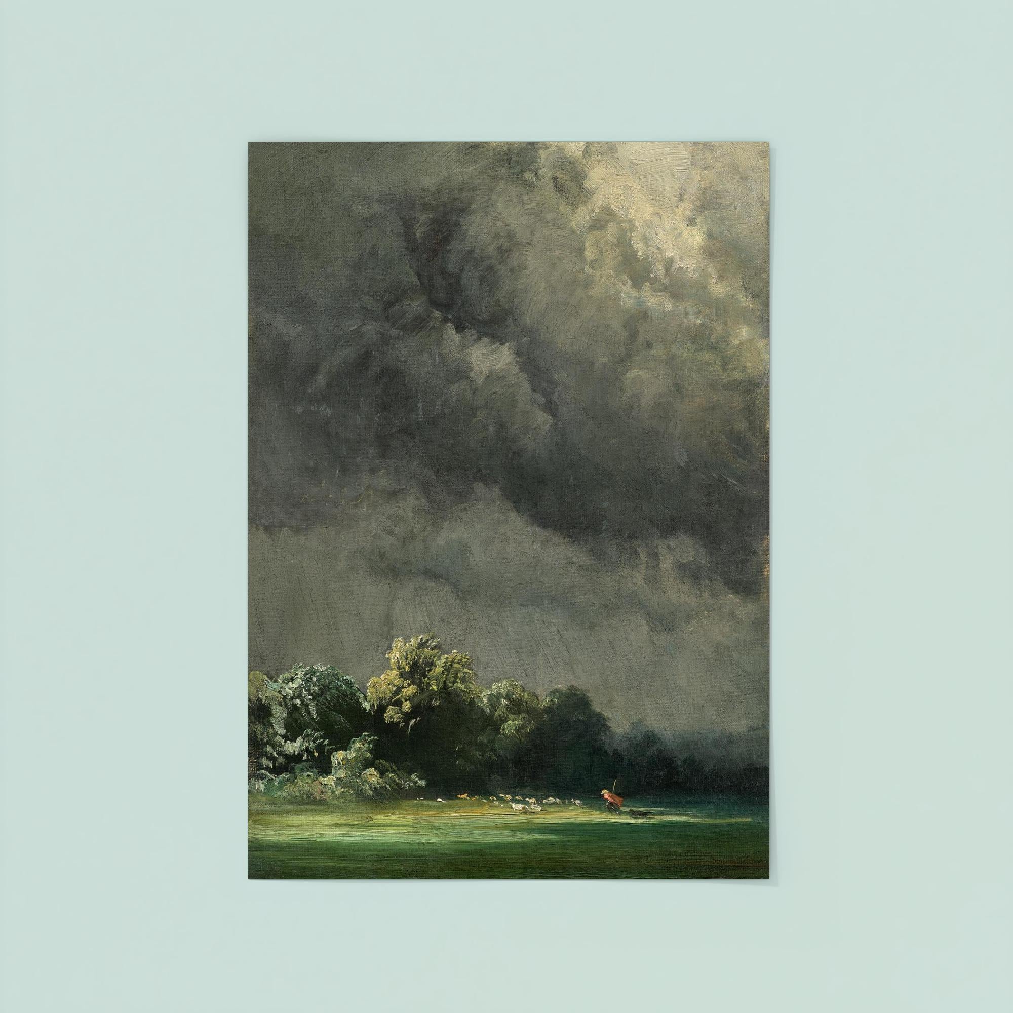 Immerse yourself in the raw power of nature with "Storm-Ridden Landscape" by Robert Zünd, painted in 1854. This timeless masterpiece captures the dramatic tension of a tempestuous sky meeting a rugged terrain, inviting you to experience the sublime beauty of the natural world. Perfect for lovers of classic art and atmospheric scenes, this poster brings a stirring sense of depth and emotion to any space.