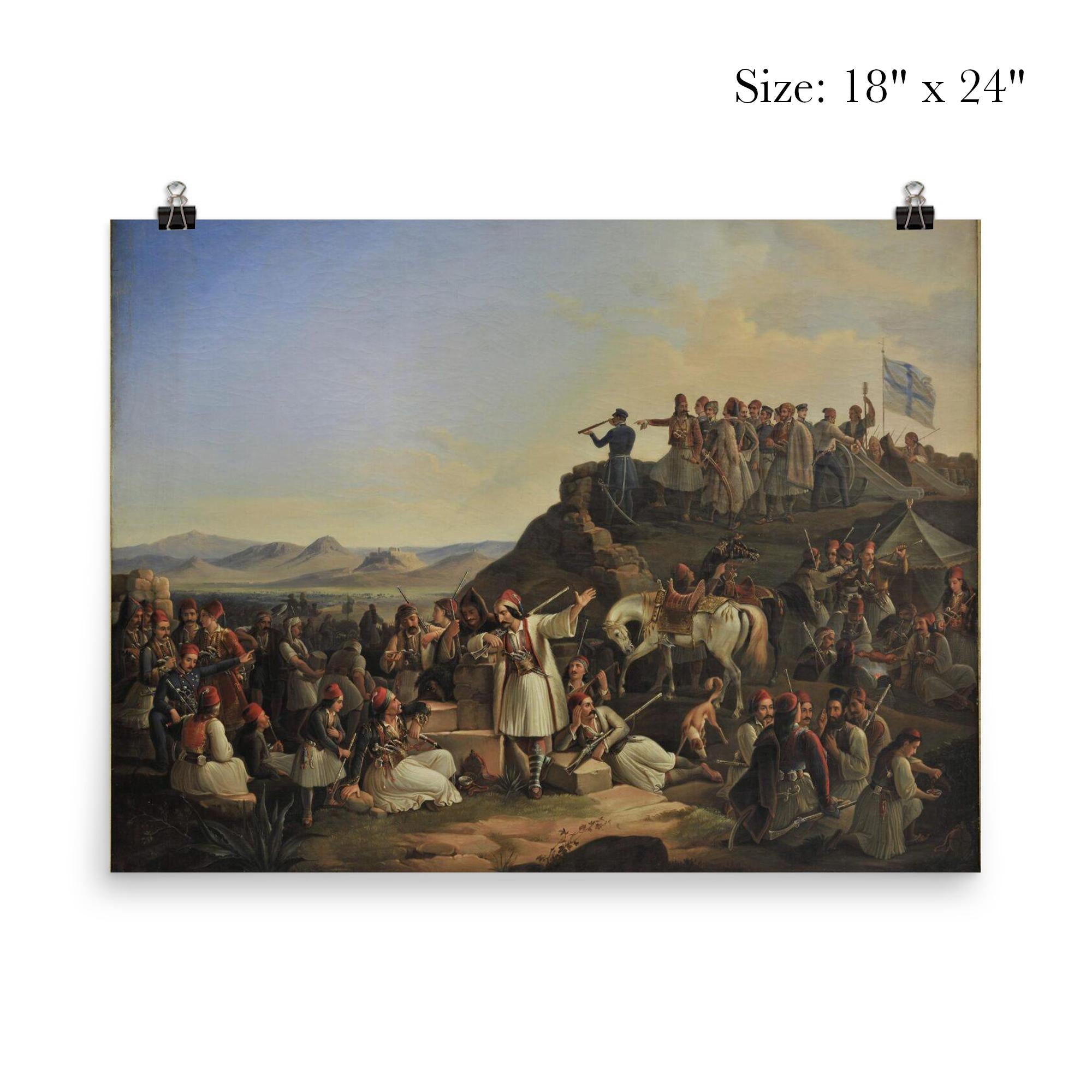 Immerse yourself in a pivotal moment of history with this striking poster of *The Camp of Georgios Karaiskakis* by Theodoros Vryzakis, crafted in 1855. This masterpiece captures the spirit of courage and resilience during Greece’s fight for freedom, offering a timeless tribute that inspires patriotism and reflection. Perfect for history enthusiasts and art lovers alike, it brings a powerful narrative to your space with authenticity and artistic grandeur.