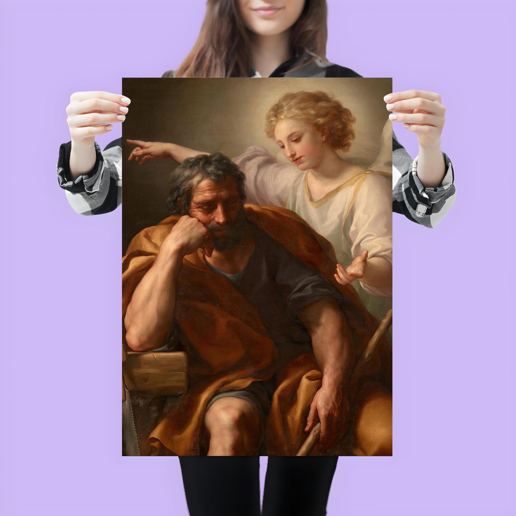 Experience the serene beauty of Anton Raphael Mengs' masterpiece with this stunning poster of *The Dream of St. Joseph*. Perfectly capturing the delicate balance of divine inspiration and human grace, this artwork adds a timeless elegance to any space. Elevate your décor with a piece that invites quiet reflection and artistic admiration.