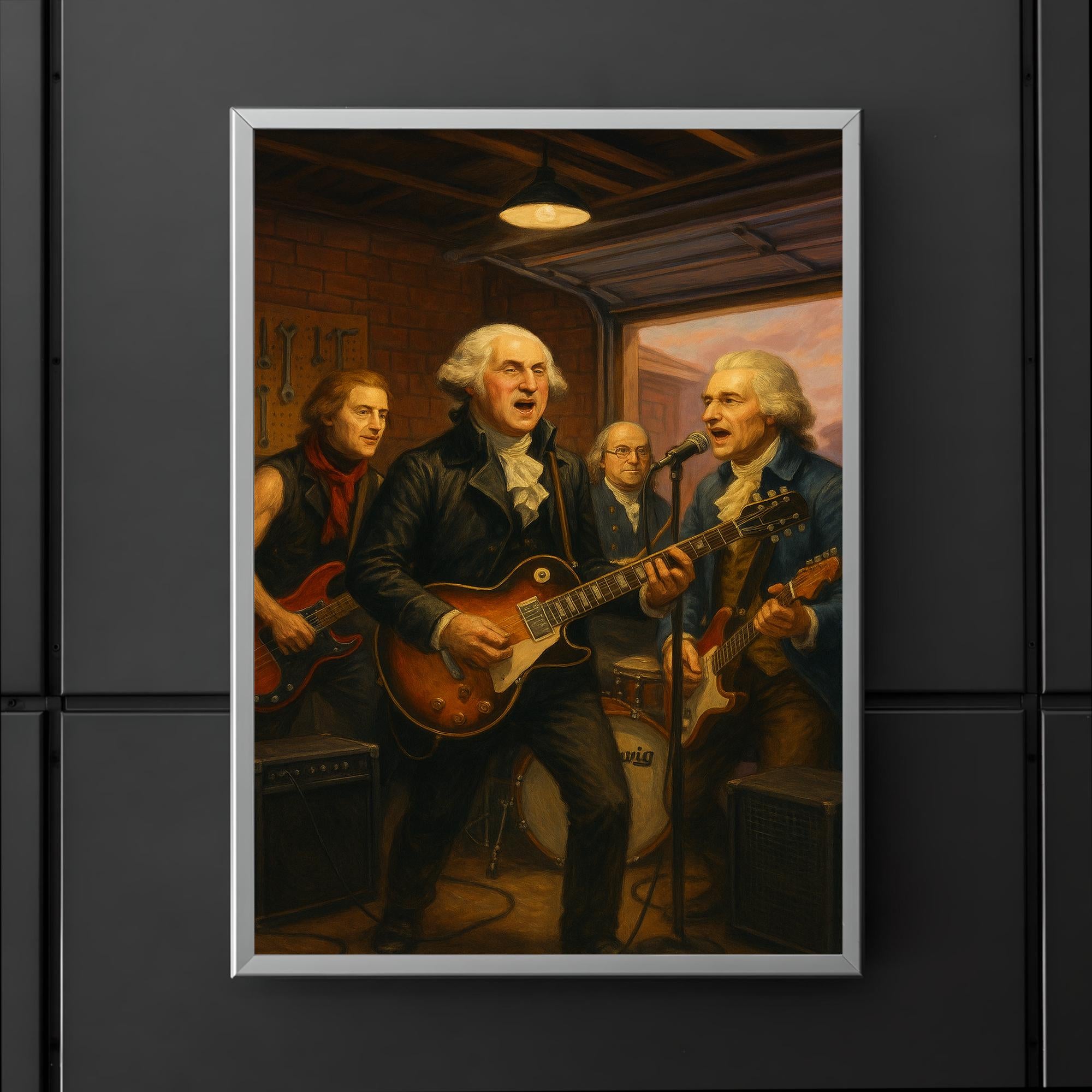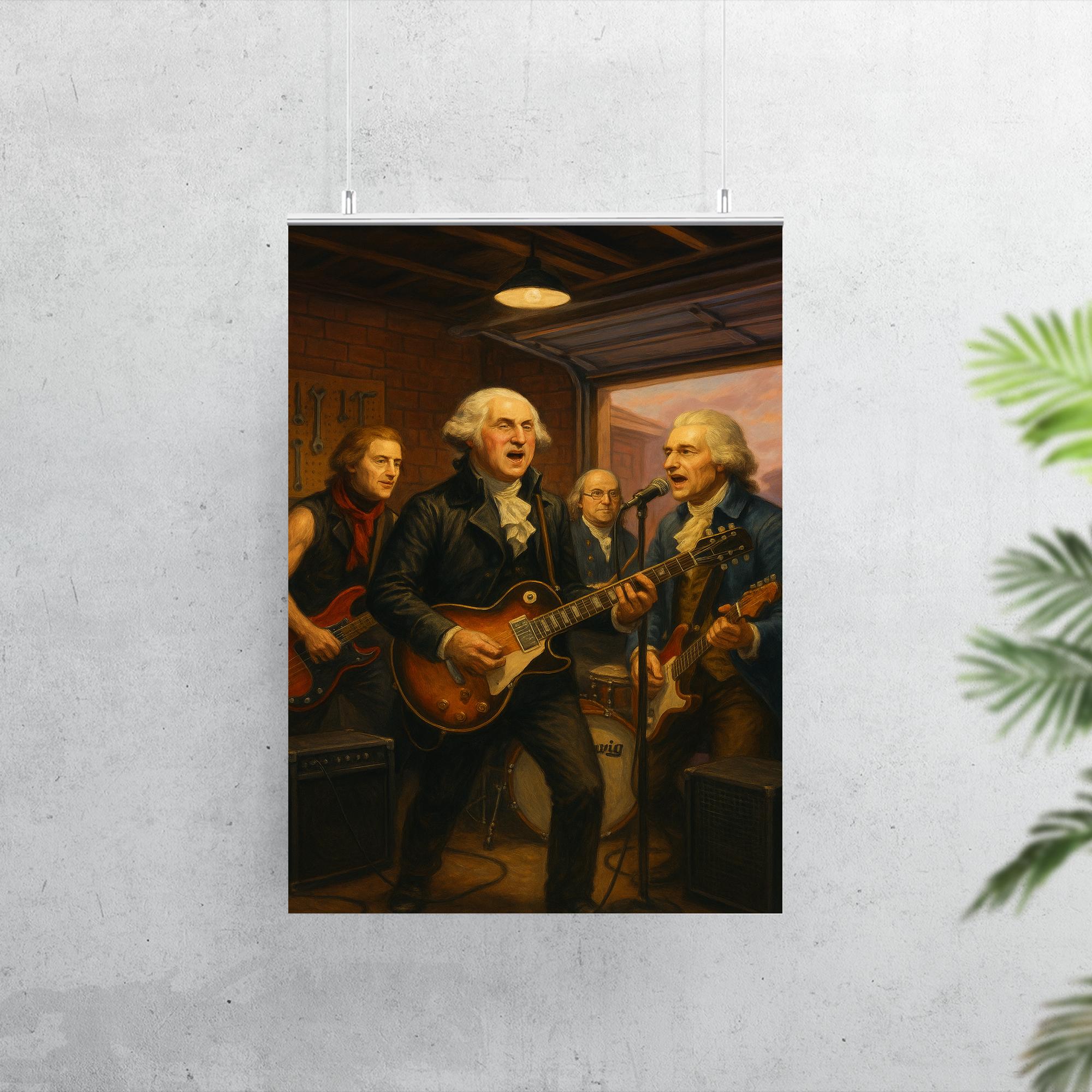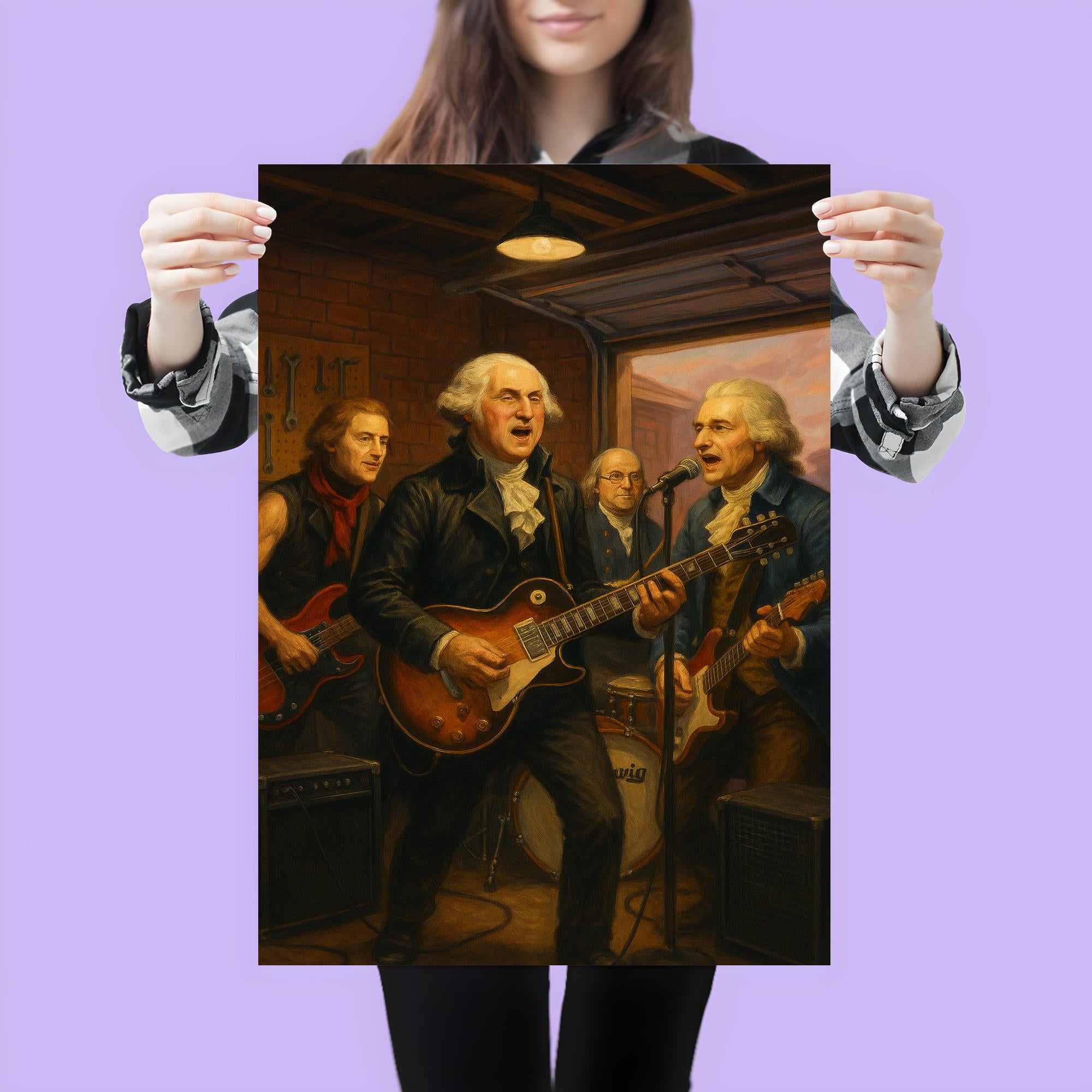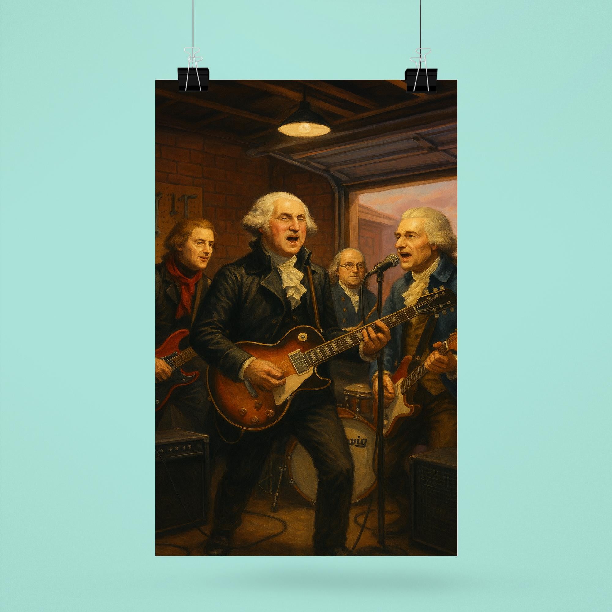Founding Fathers Rock Band Poster Print – Vintage Garage Wall Art for History & Music Lovers, Unique Patriotic Decor, High-Quality Matte Finish