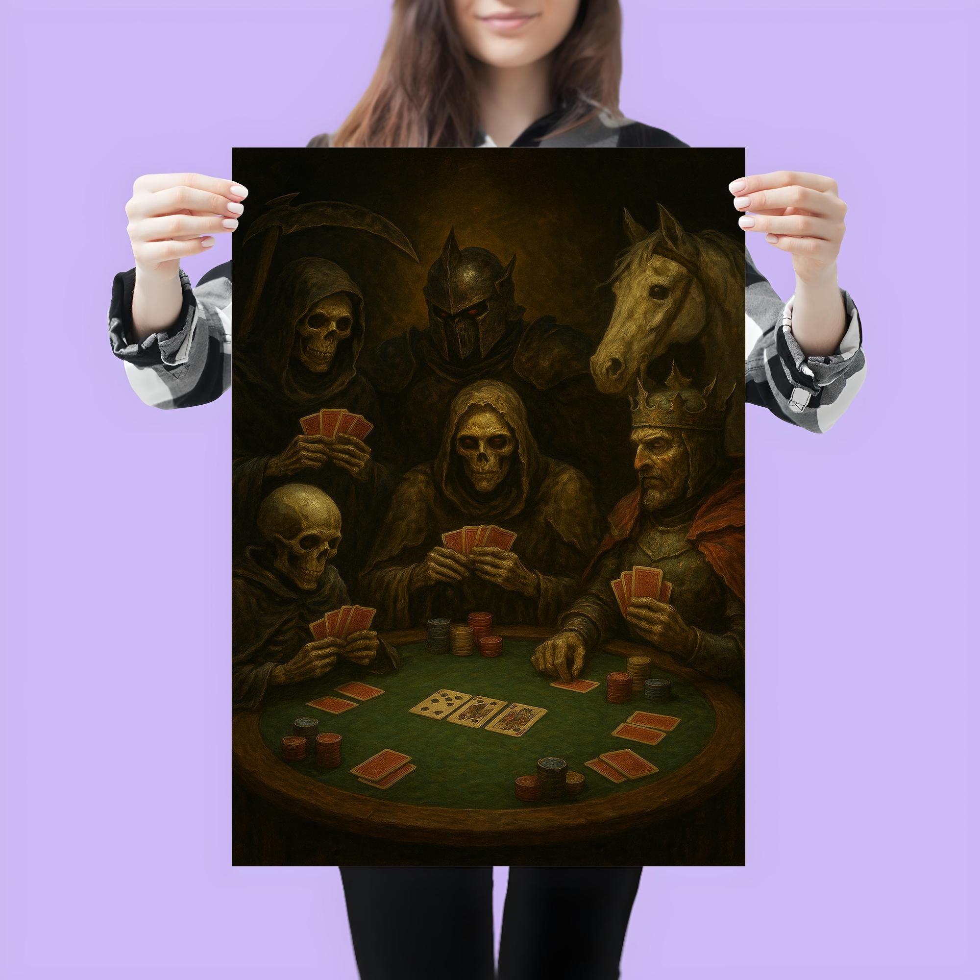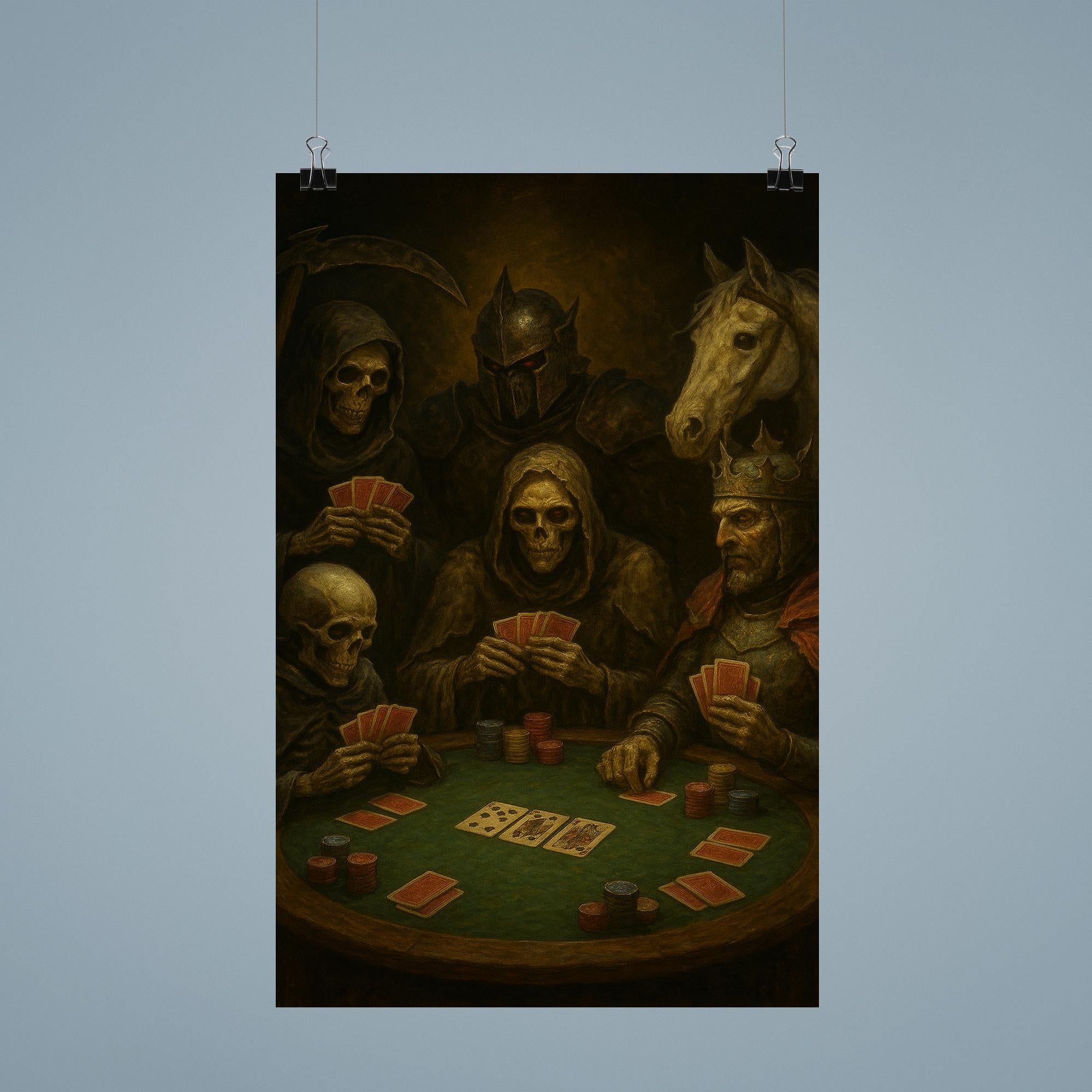 Bring a striking blend of myth and modern edge into your space with this compelling poster featuring The Four Horsemen of the Apocalypse immersed in a tense game of poker. This bold artwork captures a moment where destiny and chance collide, making it a perfect statement piece for fans of dark lore and captivating storytelling. Elevate your decor with a poster that ignites curiosity and conversation.
