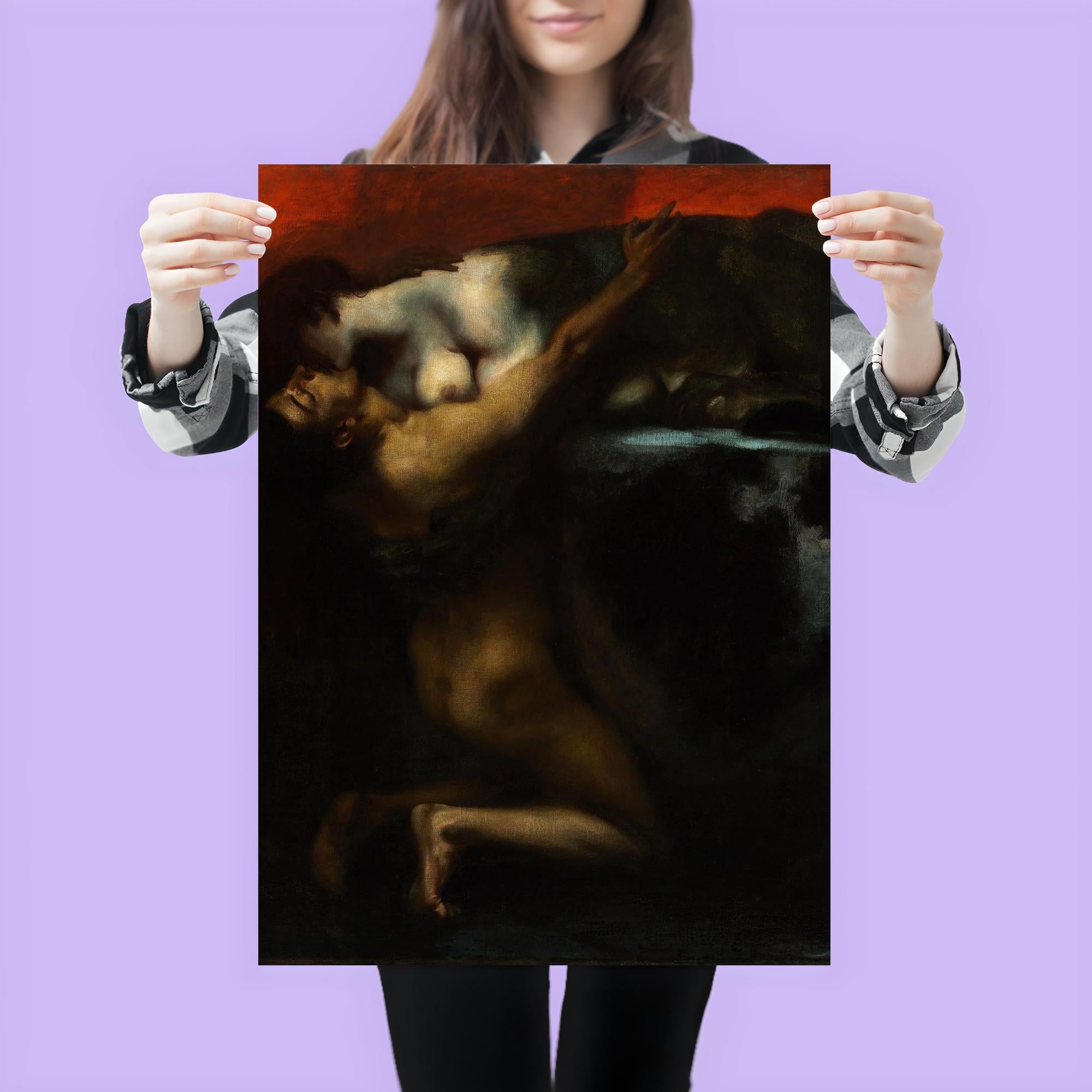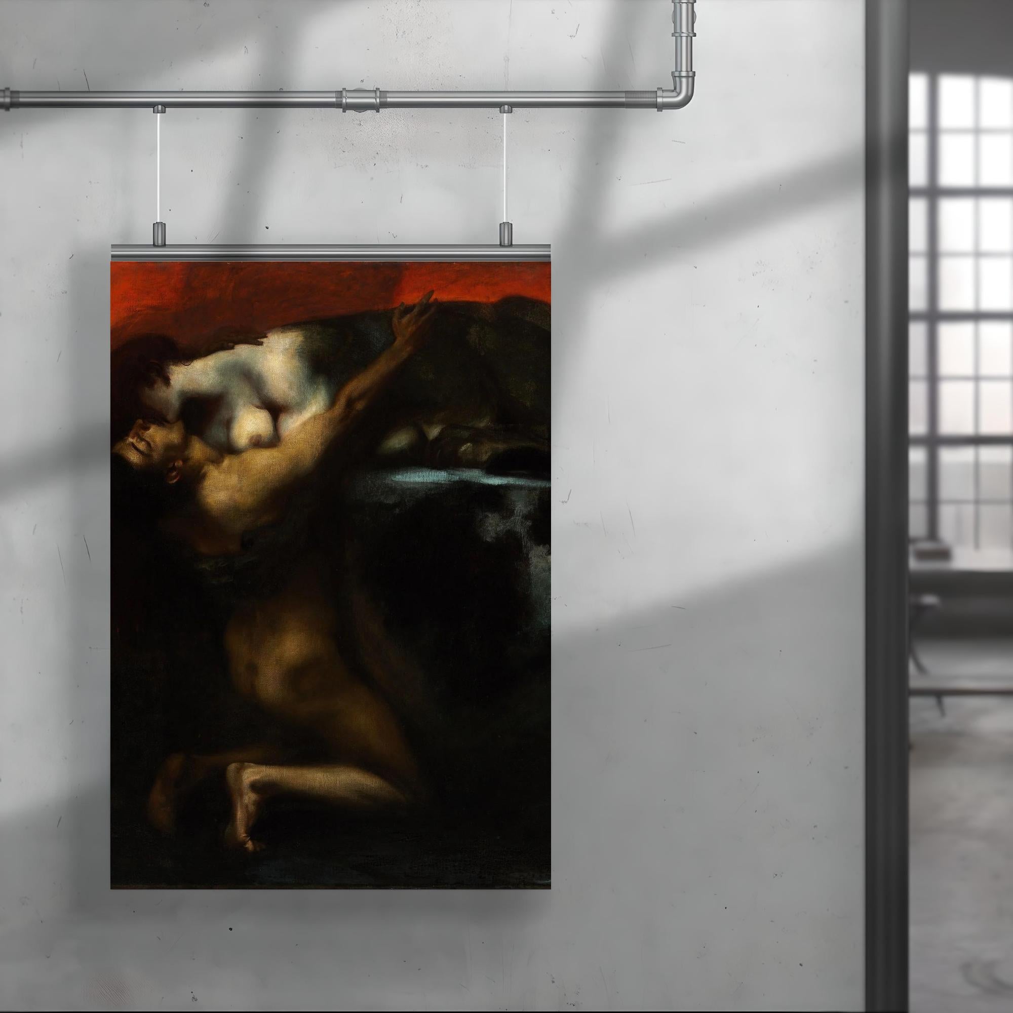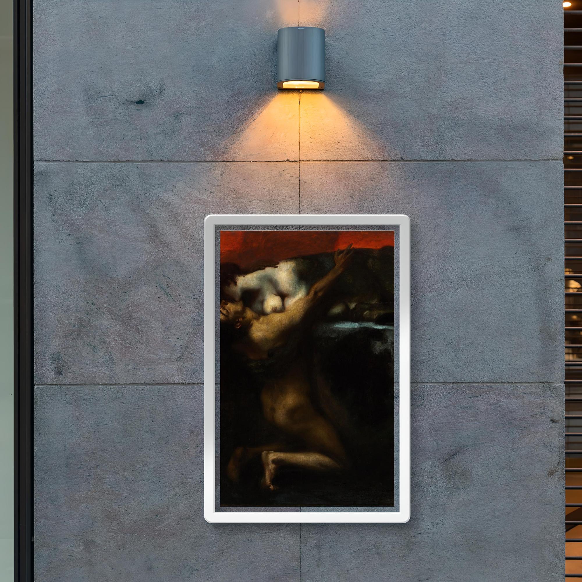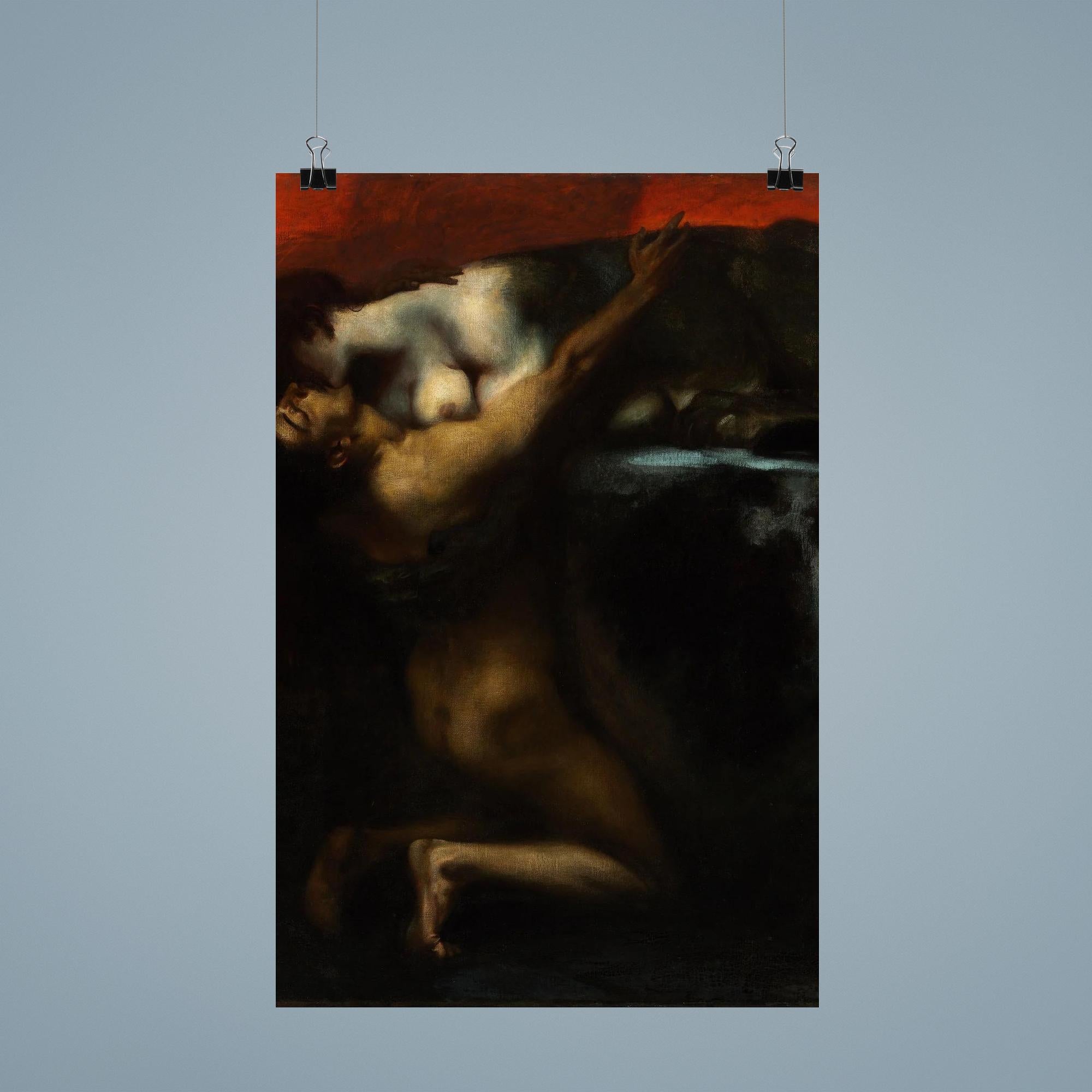Experience the enigmatic allure of Franz von Stuck’s 1895 masterpiece, *The Kiss of the Sphinx*. This striking poster captures the dark, seductive power and mystery that define von Stuck’s symbolist vision—transform any space with a timeless blend of intrigue and artistic intensity. A true conversation piece, it invites you to lose yourself in the haunting embrace of myth and emotion.