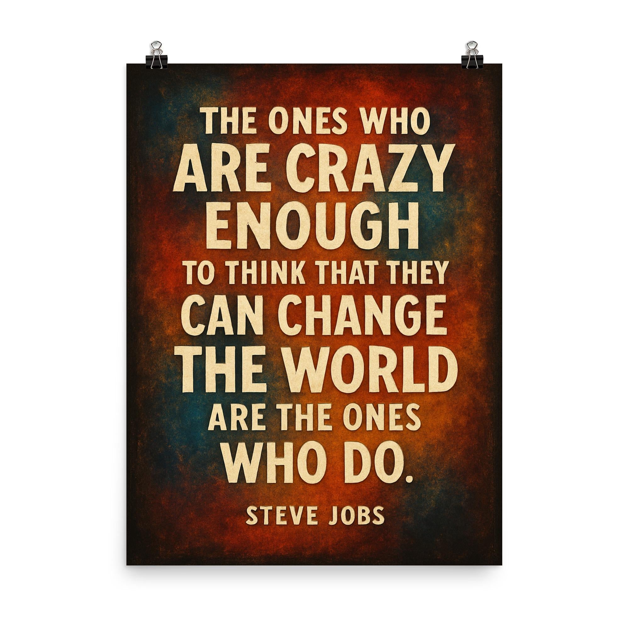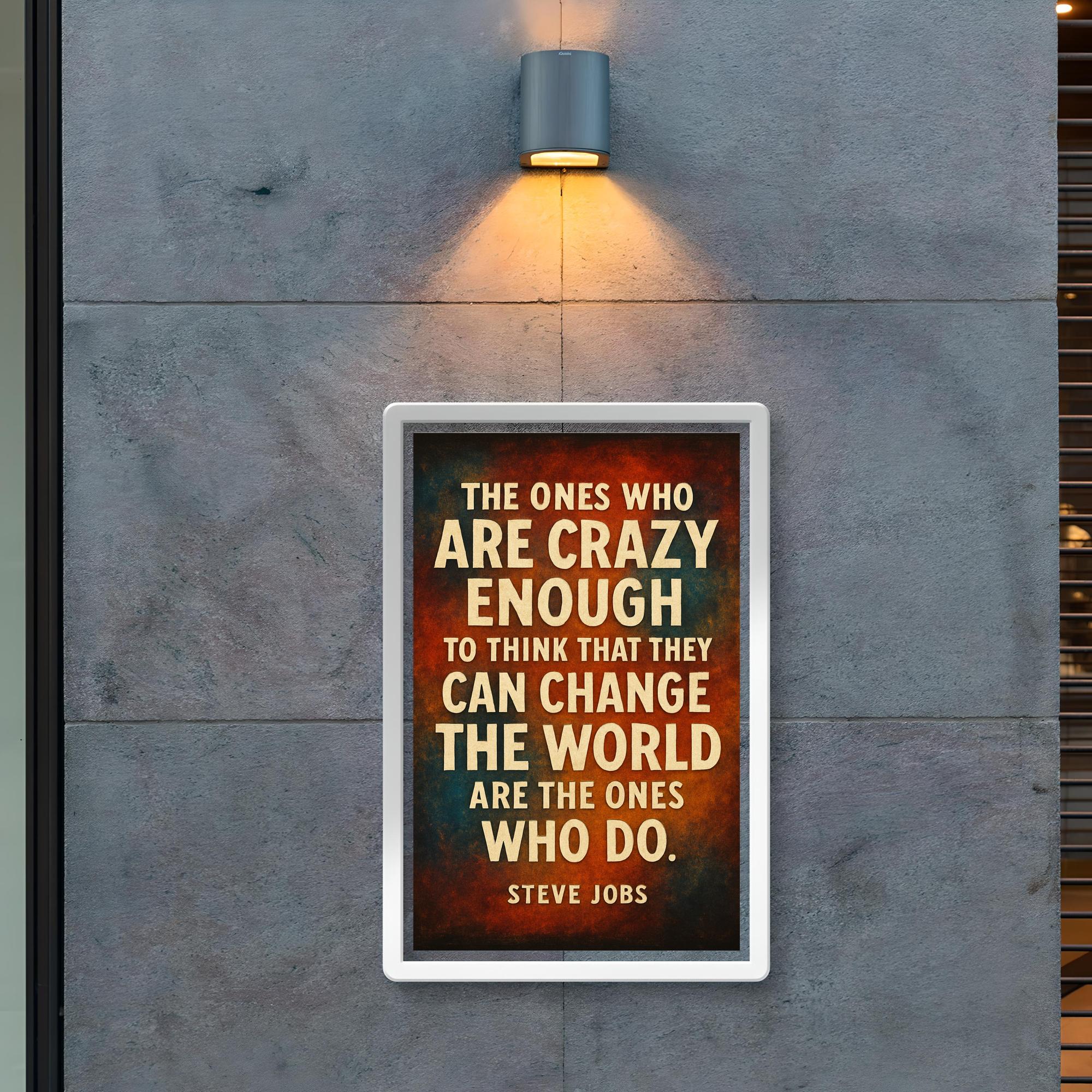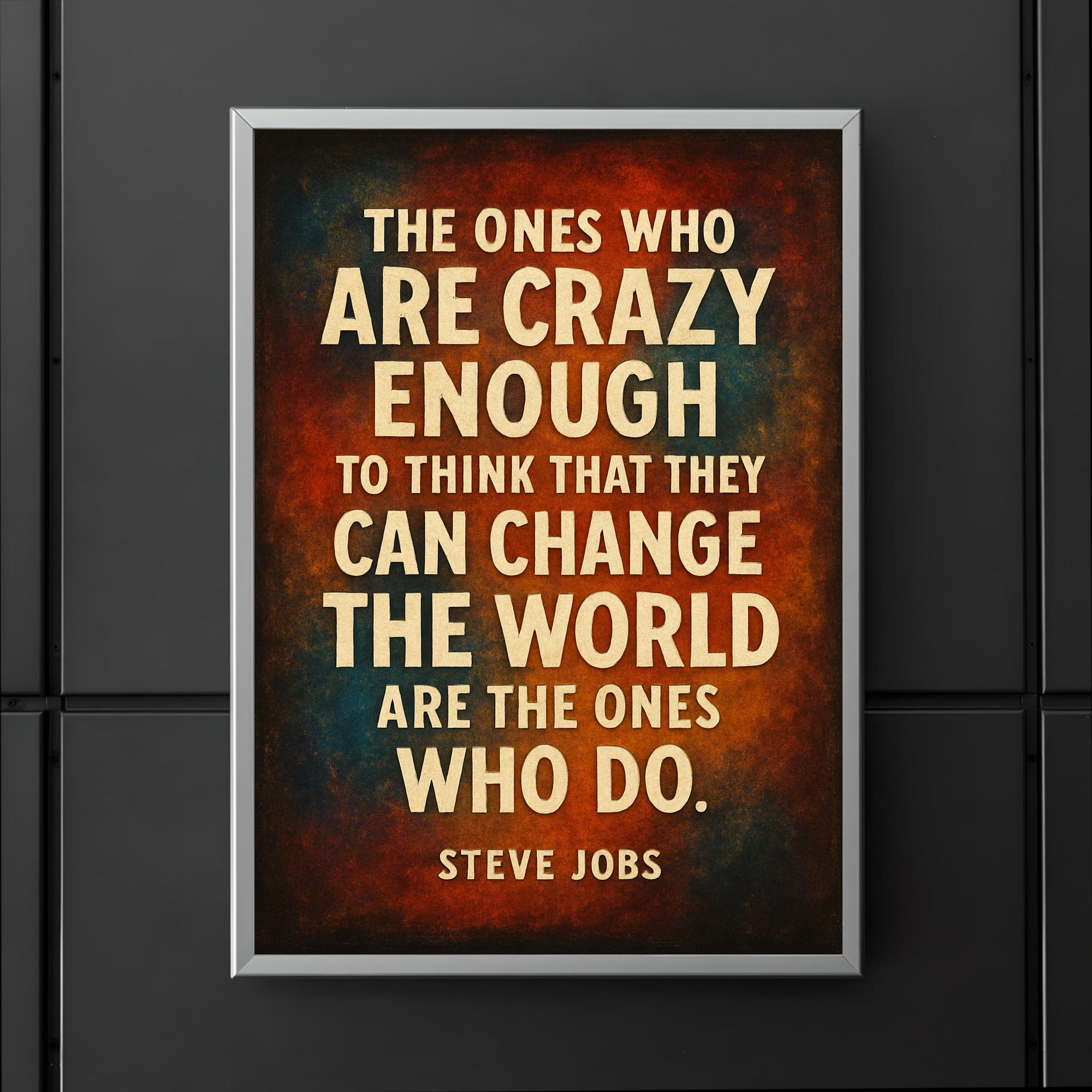 Ignite your passion and fuel your ambition with this inspiring poster featuring Steve Jobs' iconic quote: "The ones who are crazy enough to think that they can change the world." Perfect for any space where bold ideas take flight, it’s a constant reminder that daring to dream differently is the first step to making an extraordinary impact.