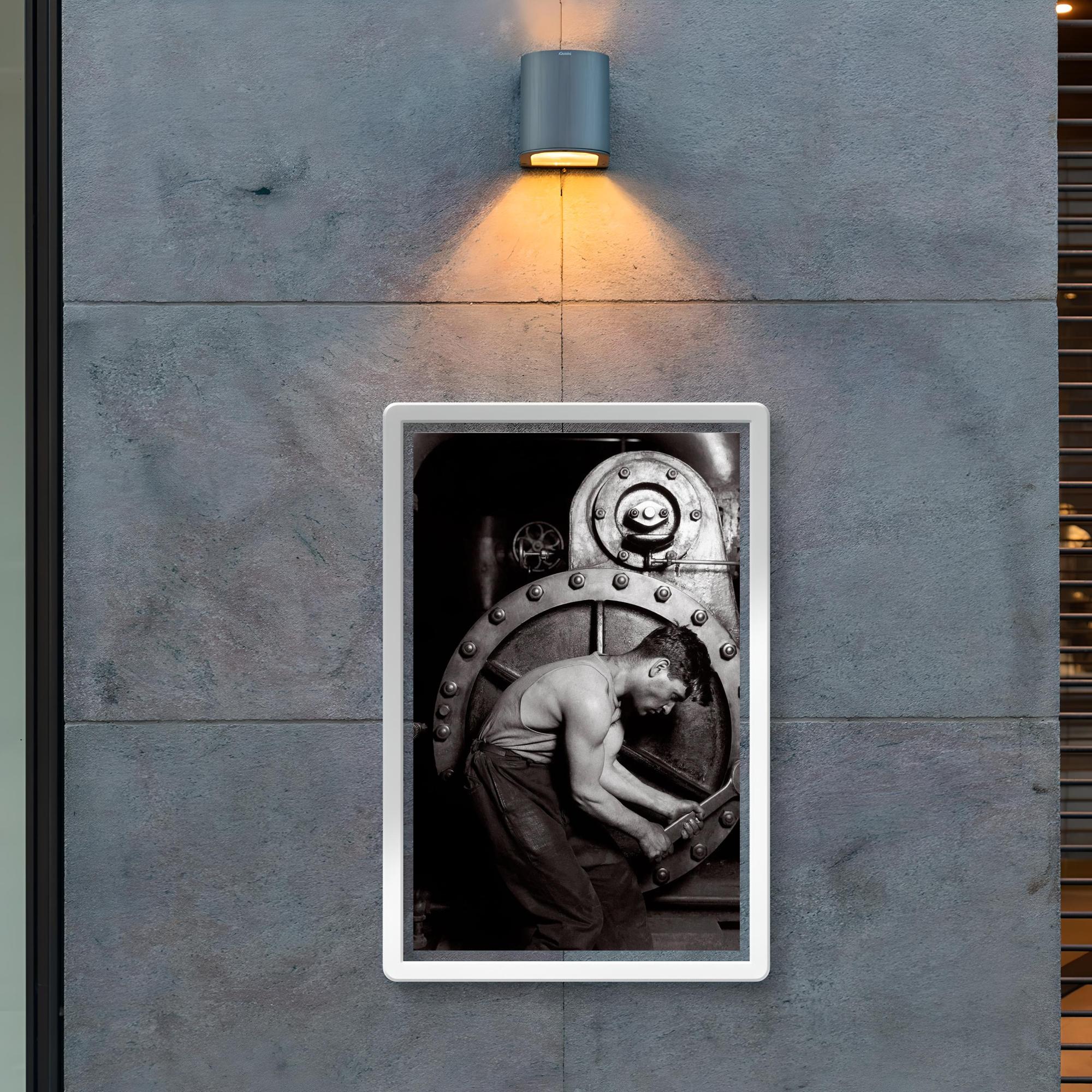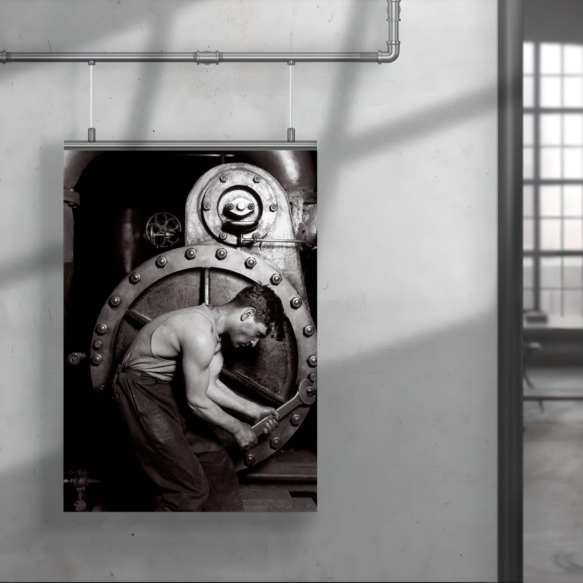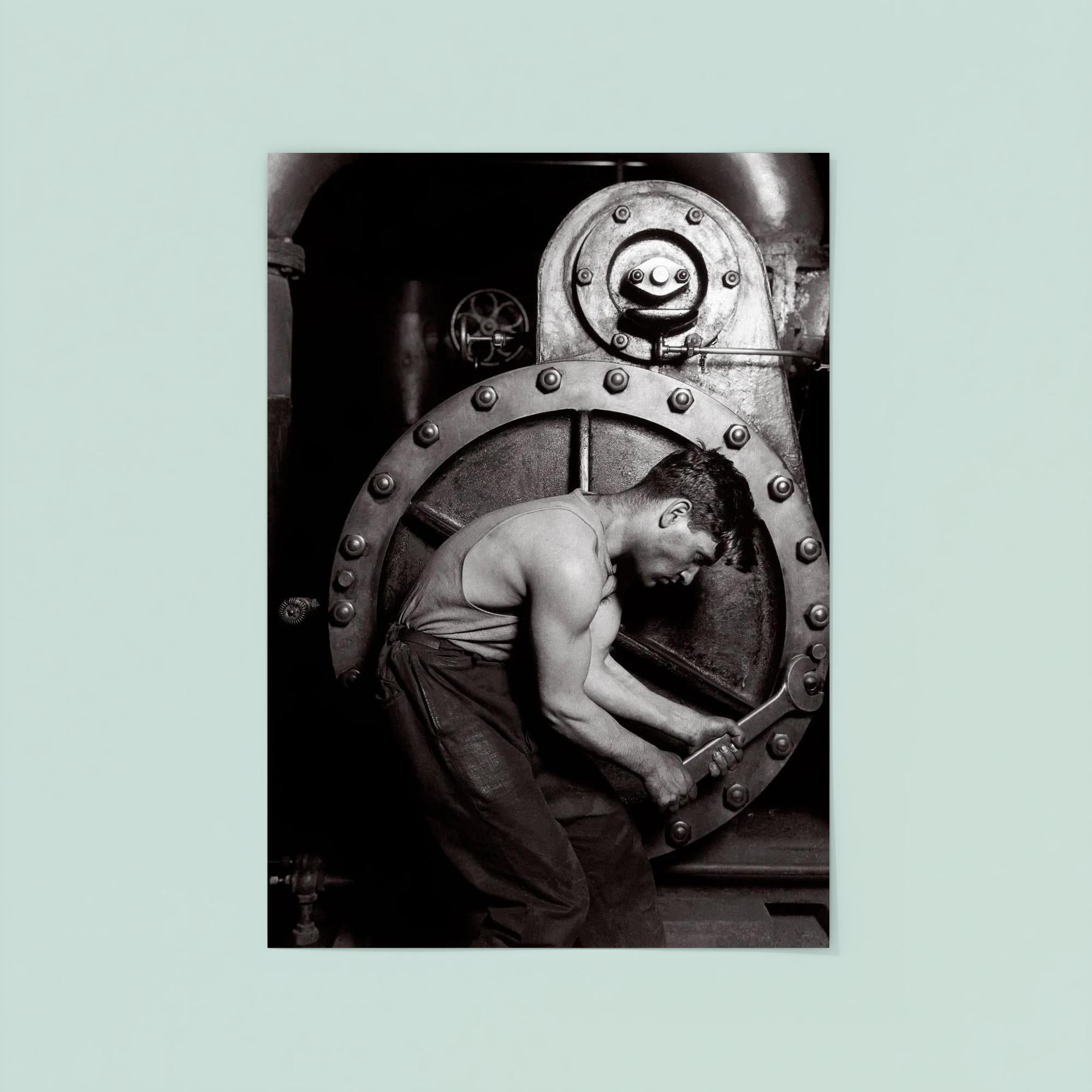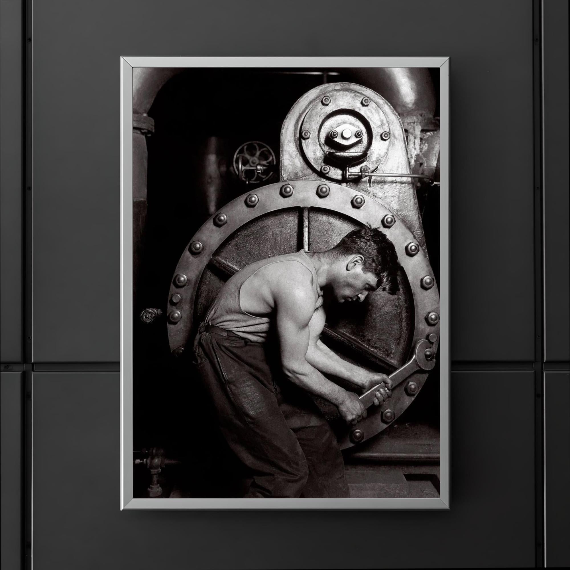 Elevate your space with "The Steamfitter, 1921," a striking black-and-white photograph by Lewis Hines that captures the quiet strength of a power plant mechanic standing resolutely before a massive steam generator. This iconic image speaks to the grit and determination of early industrial America, offering a powerful glimpse into history that inspires resilience and pride. Perfect for lovers of vintage photography and industrial heritage alike.