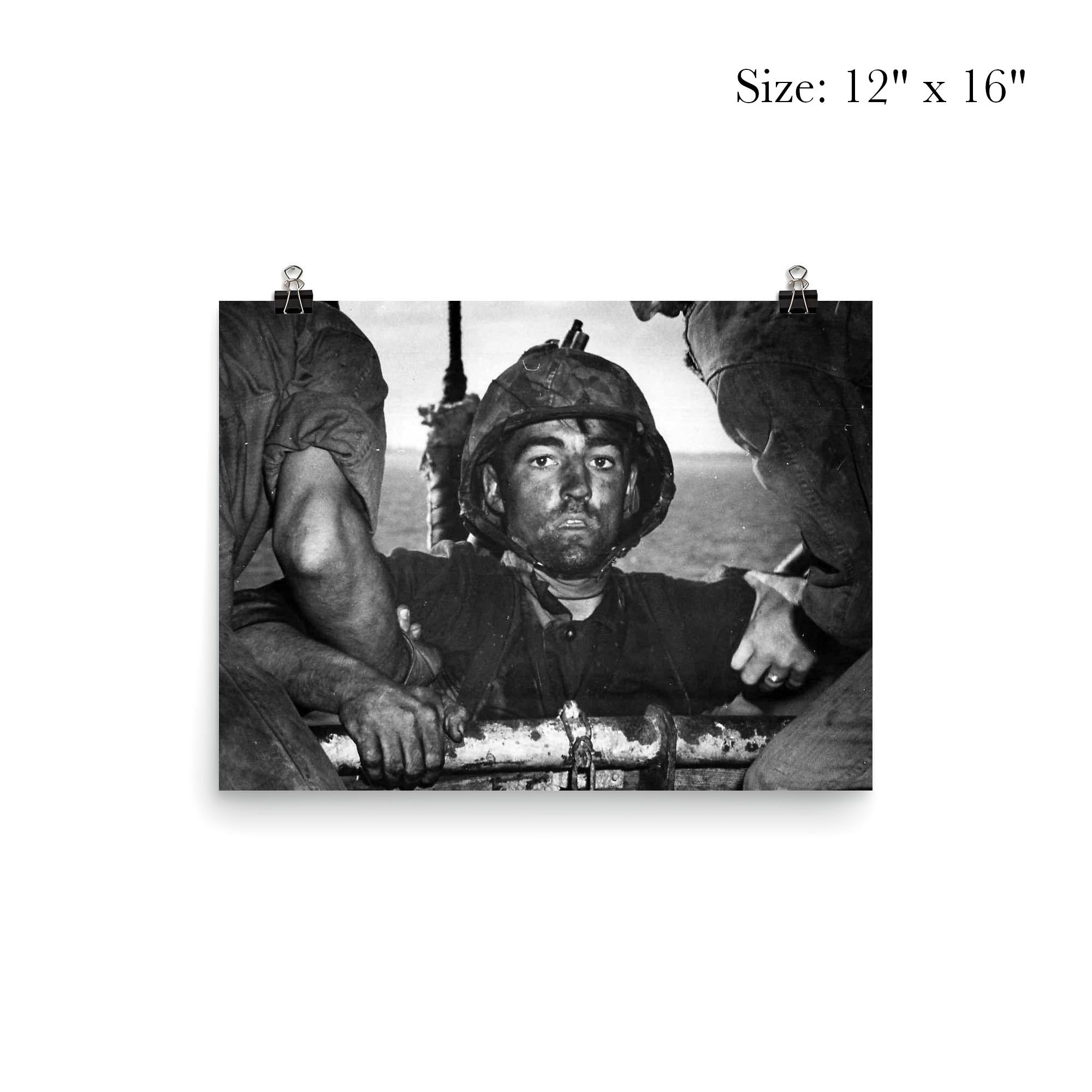 Capture a powerful moment in history with this striking poster of US Marine Theodore J. Miller, 1944, known as The Thousand Yard Stare. This iconic image reveals the profound intensity and resilience of a soldier amid the ravages of war, offering a timeless tribute to courage and sacrifice. Perfect for those who appreciate raw, authentic wartime photography that speaks volumes without words.