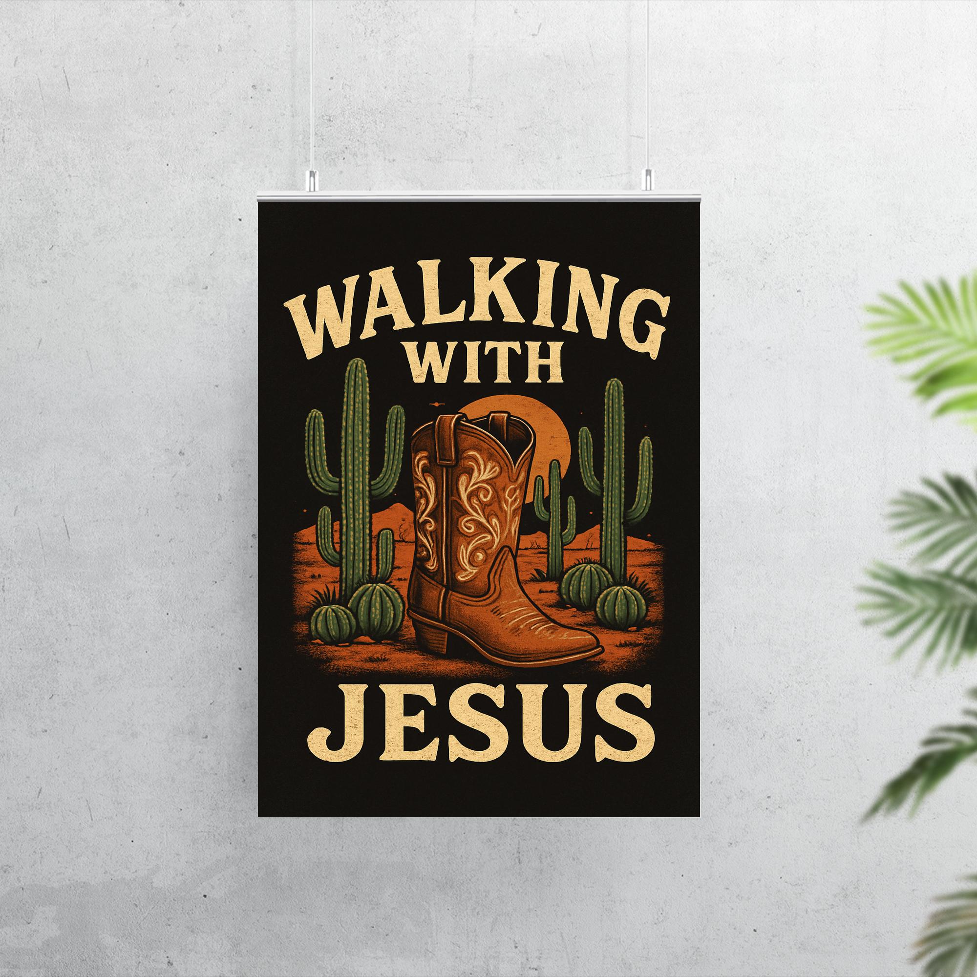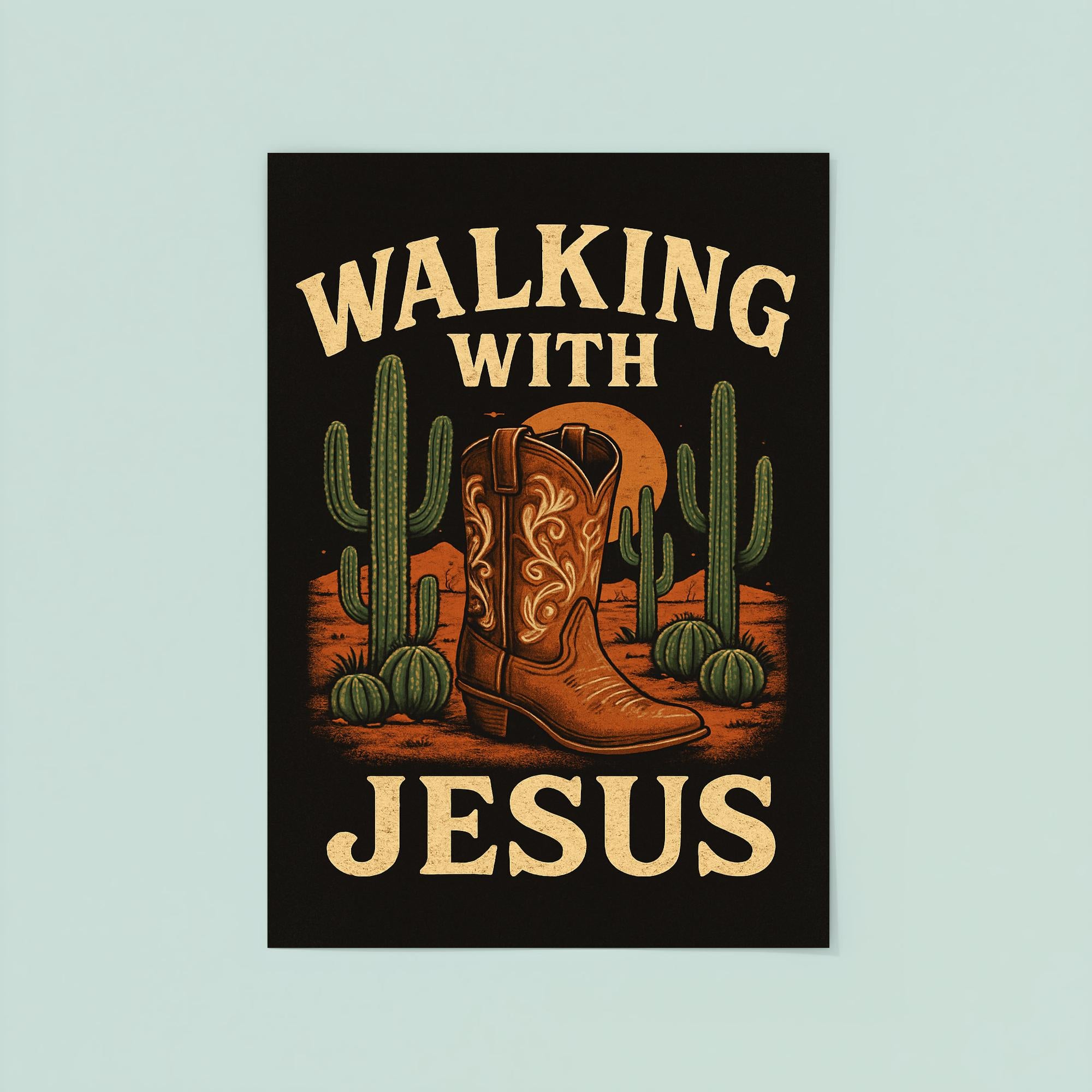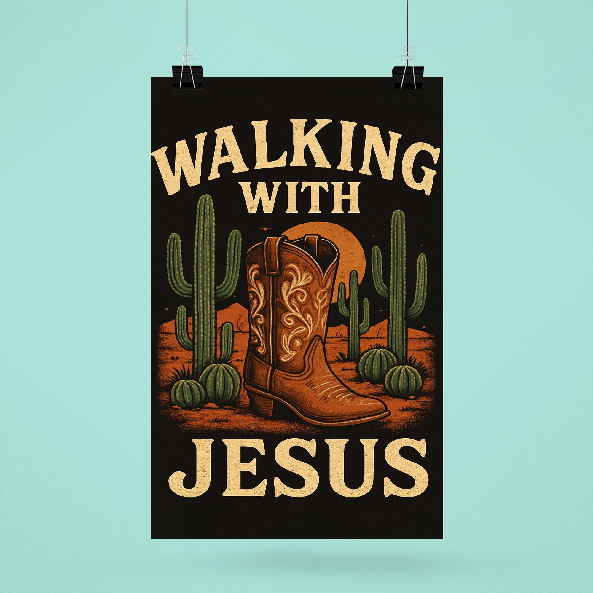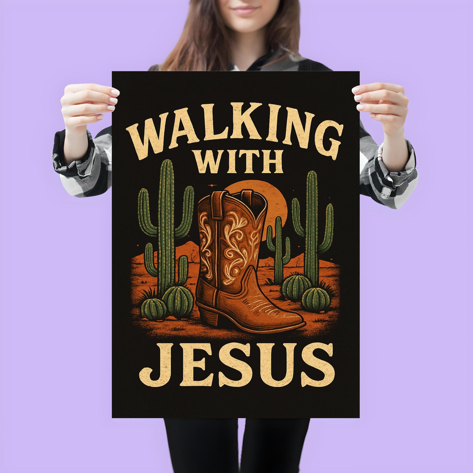 Embrace your faith with a bold cowgirl spirit through this striking "Walking with Jesus" poster. Featuring a warm desert vibe inspired by rugged cacti and classic cowgirl boots, it brings a soulful blend of strength and grace to any space. Perfect for those who cherish their walk with Jesus and a touch of Western charm.