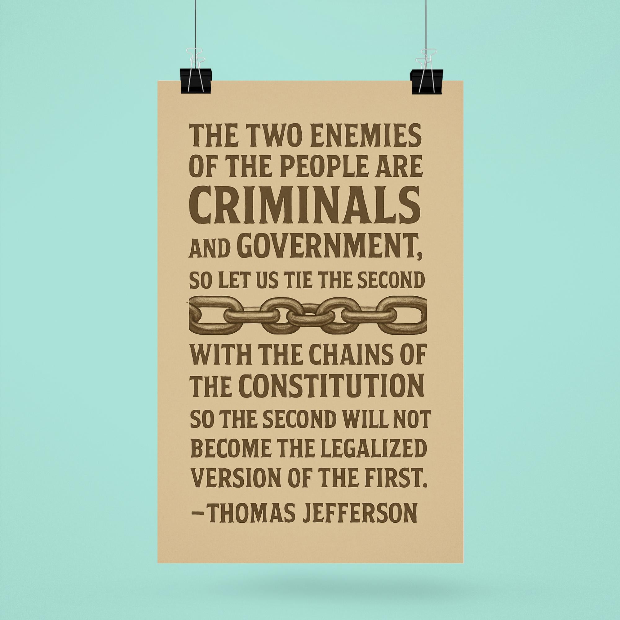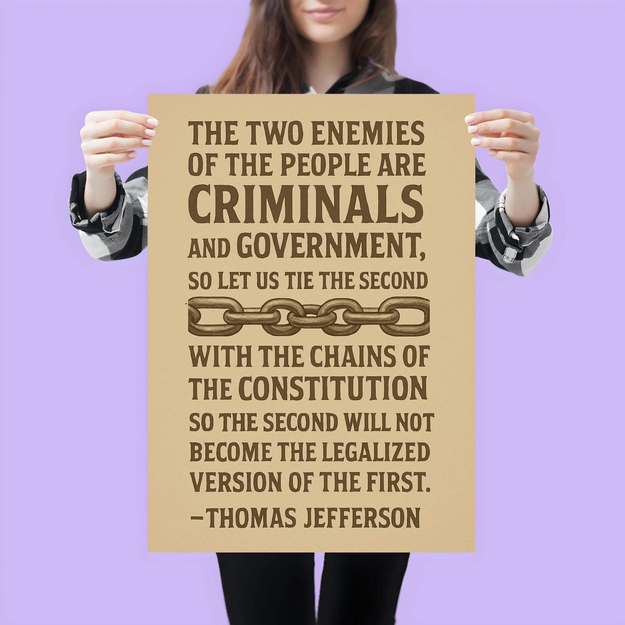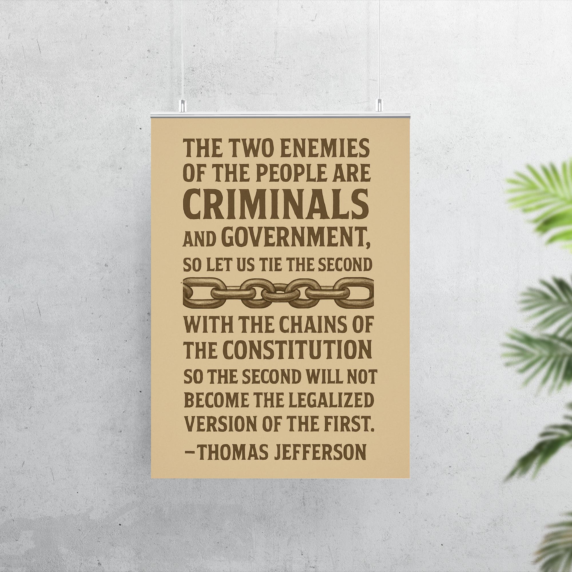 Inspire thoughtful reflection with this powerful poster featuring Thomas Jefferson’s timeless warning: "The two enemies of the people are criminals and government." Perfect for sparking conversation and emphasizing vigilance, this striking quote serves as a bold reminder of the delicate balance between freedom and authority. Display it proudly to provoke insight and ignite meaningful dialogue in any space.