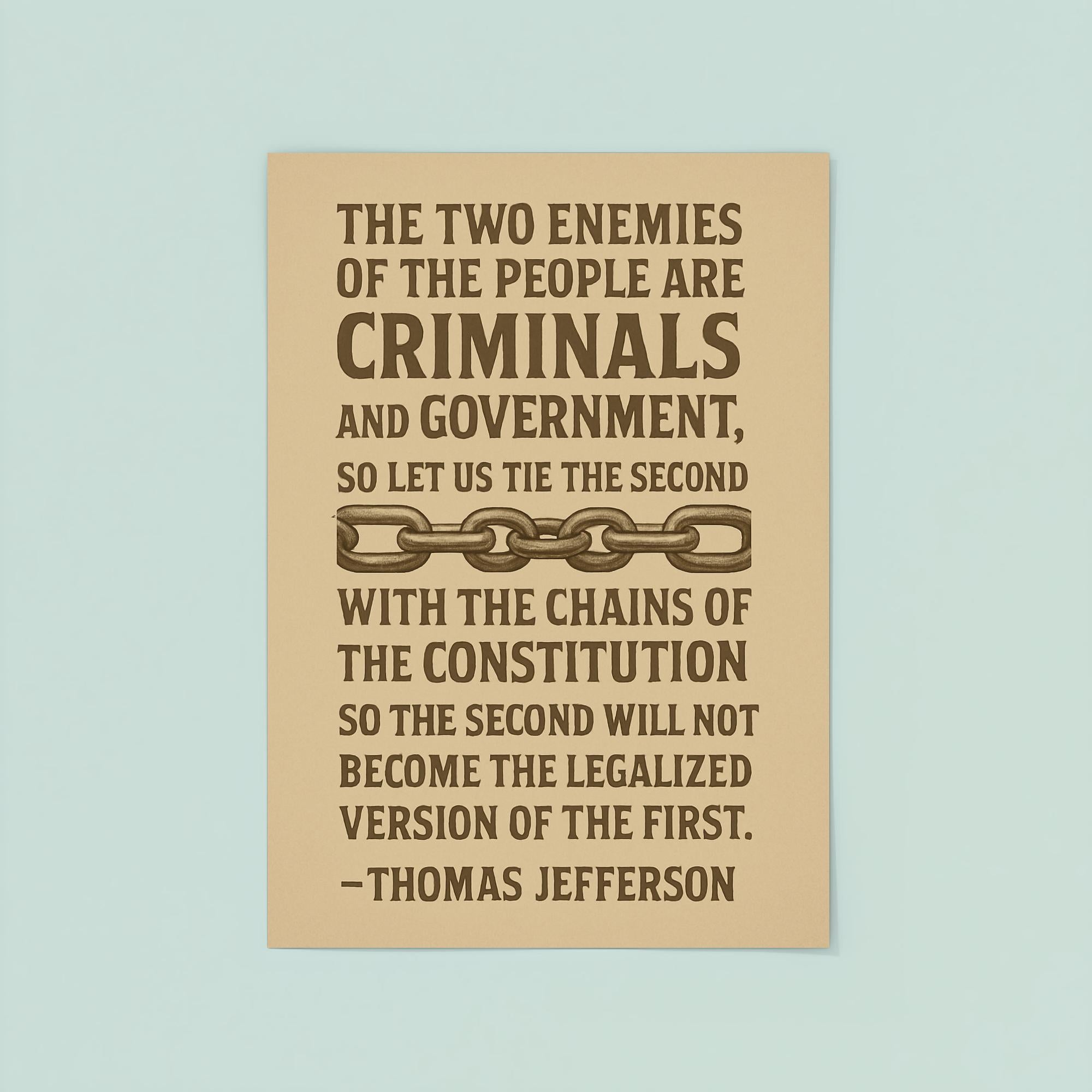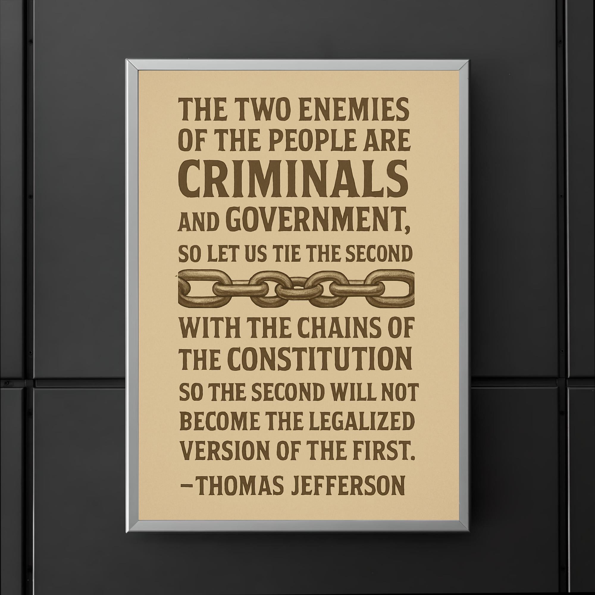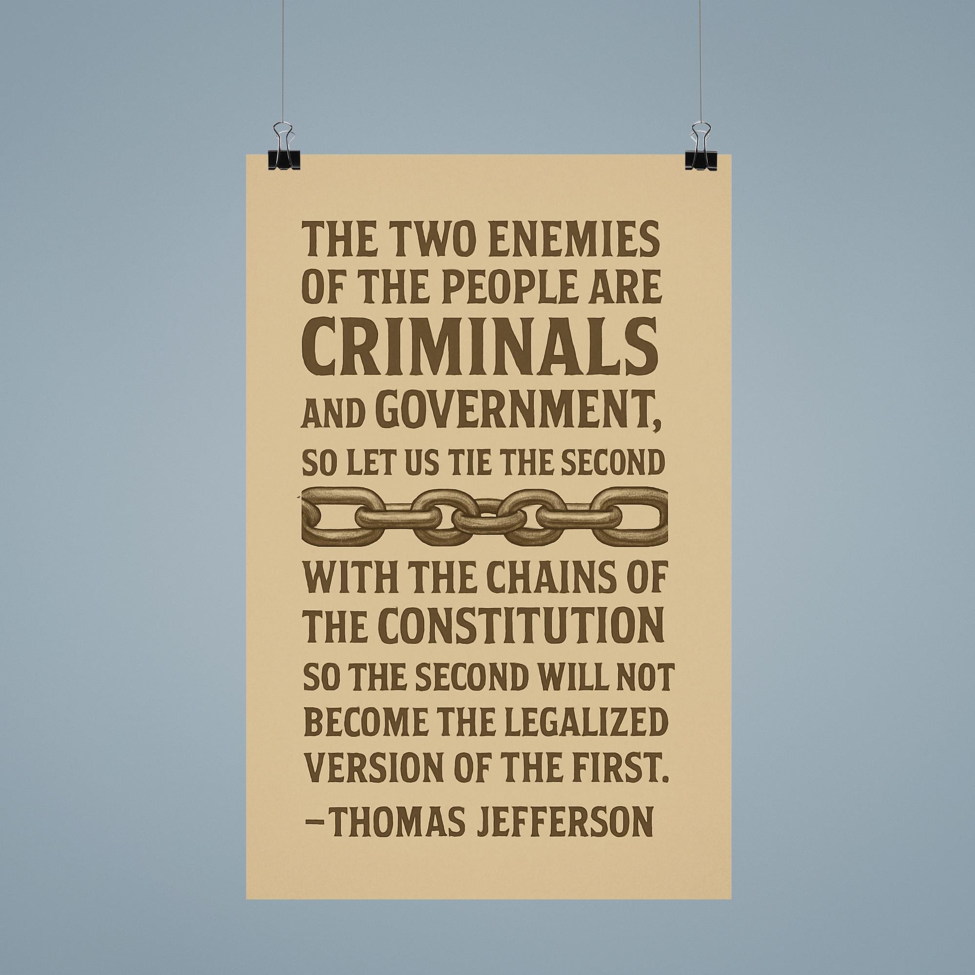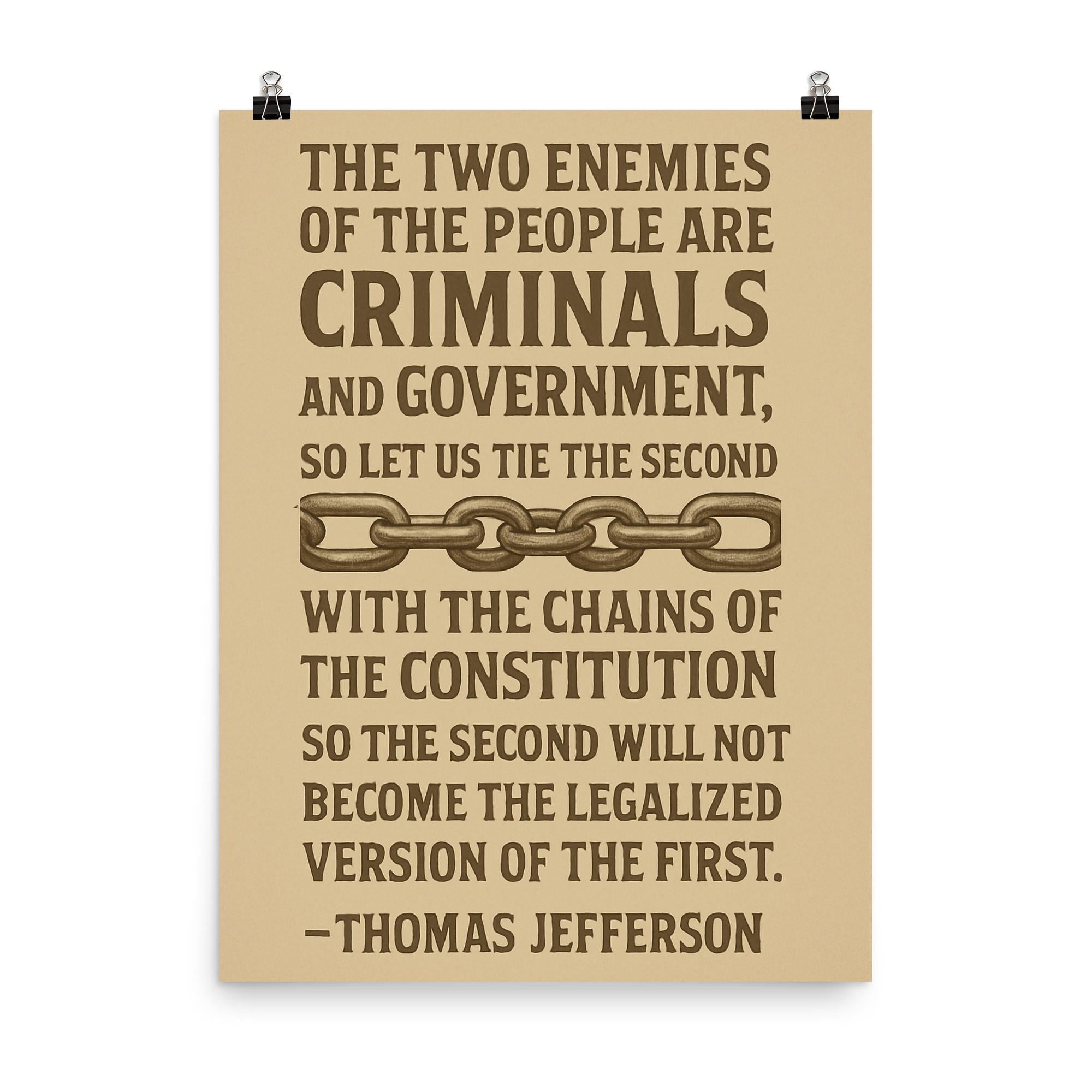 Inspire thoughtful reflection with this powerful poster featuring Thomas Jefferson’s timeless warning: "The two enemies of the people are criminals and government." Perfect for sparking conversation and emphasizing vigilance, this striking quote serves as a bold reminder of the delicate balance between freedom and authority. Display it proudly to provoke insight and ignite meaningful dialogue in any space.