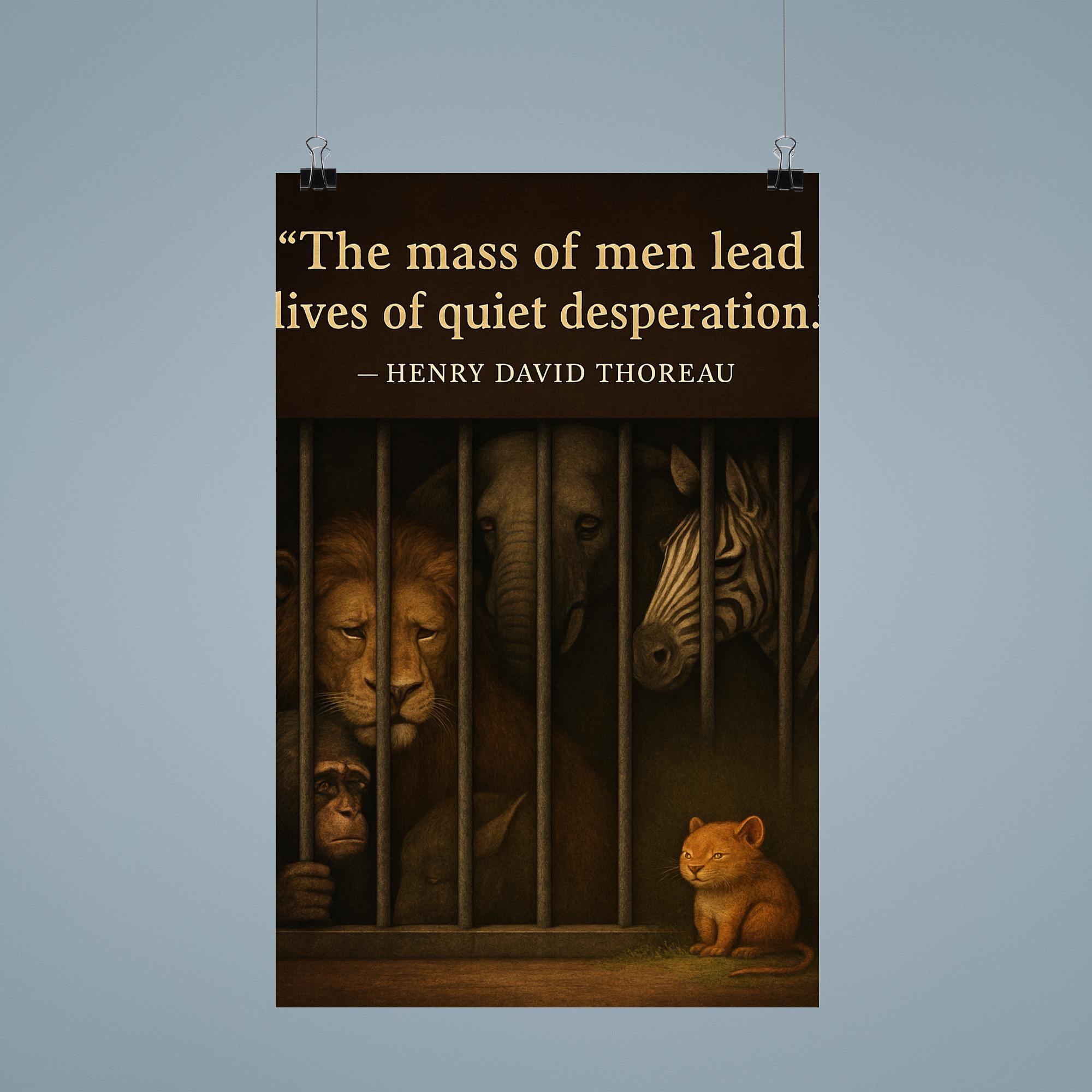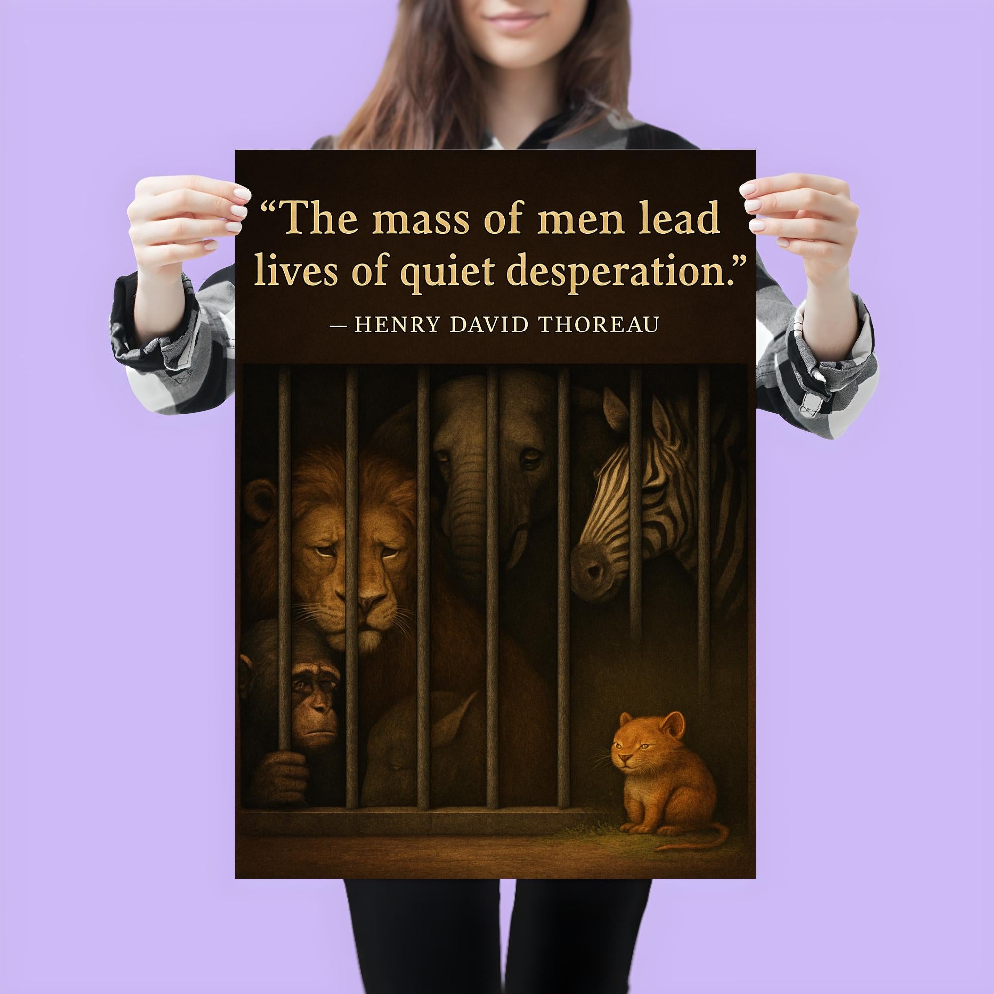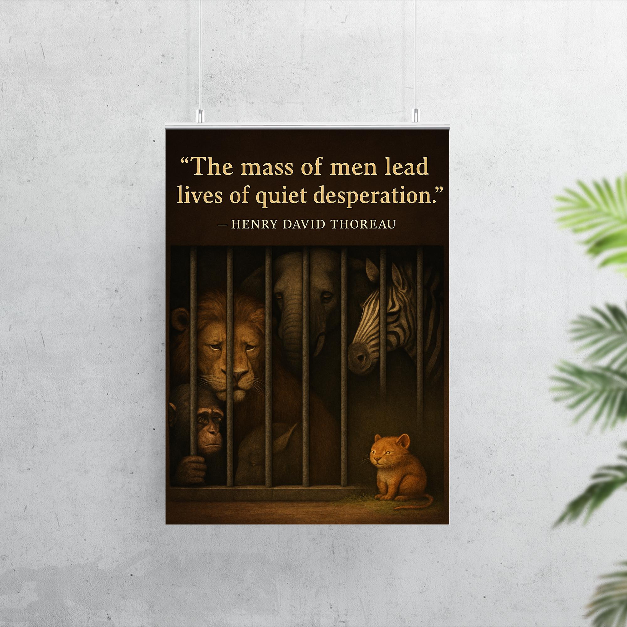 Capture the haunting truth behind Henry David Thoreau’s words with this powerful poster featuring his iconic quote on quiet desperation. Paired with a striking image of animals in a zoo, their somber expressions evoke a deep reflection on captivity and longing. A thought-provoking piece that inspires introspection and empathy, perfect for any space craving meaningful conversation.