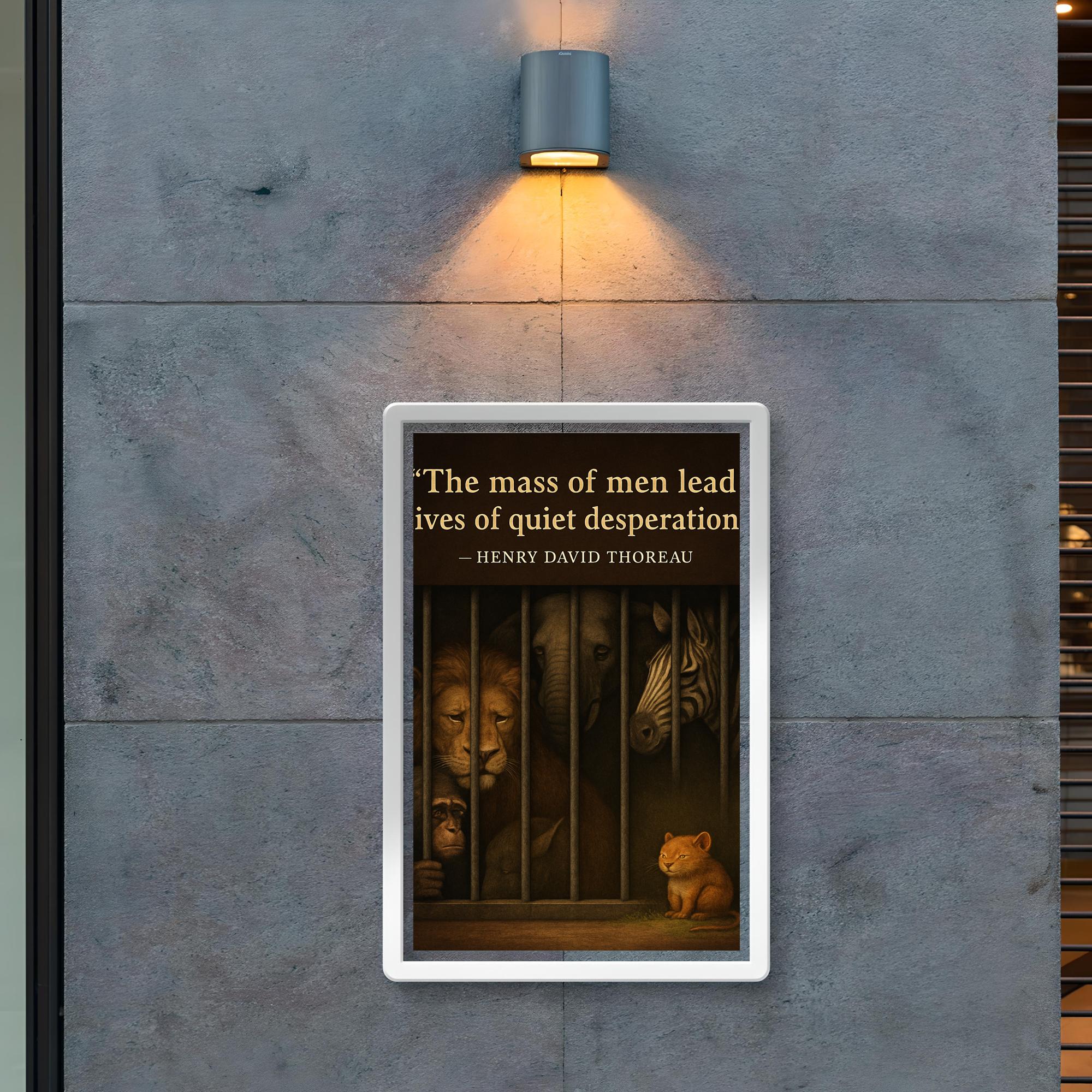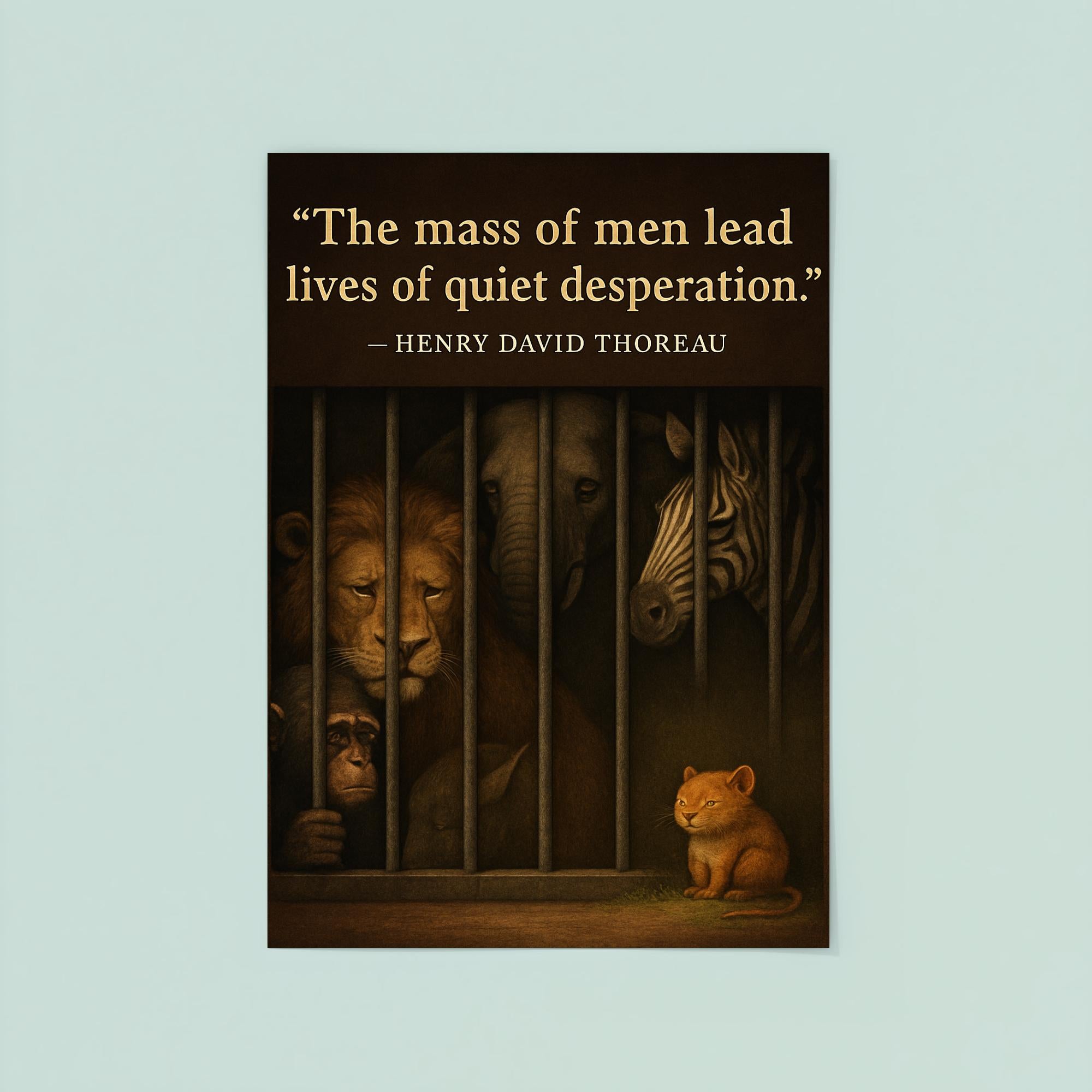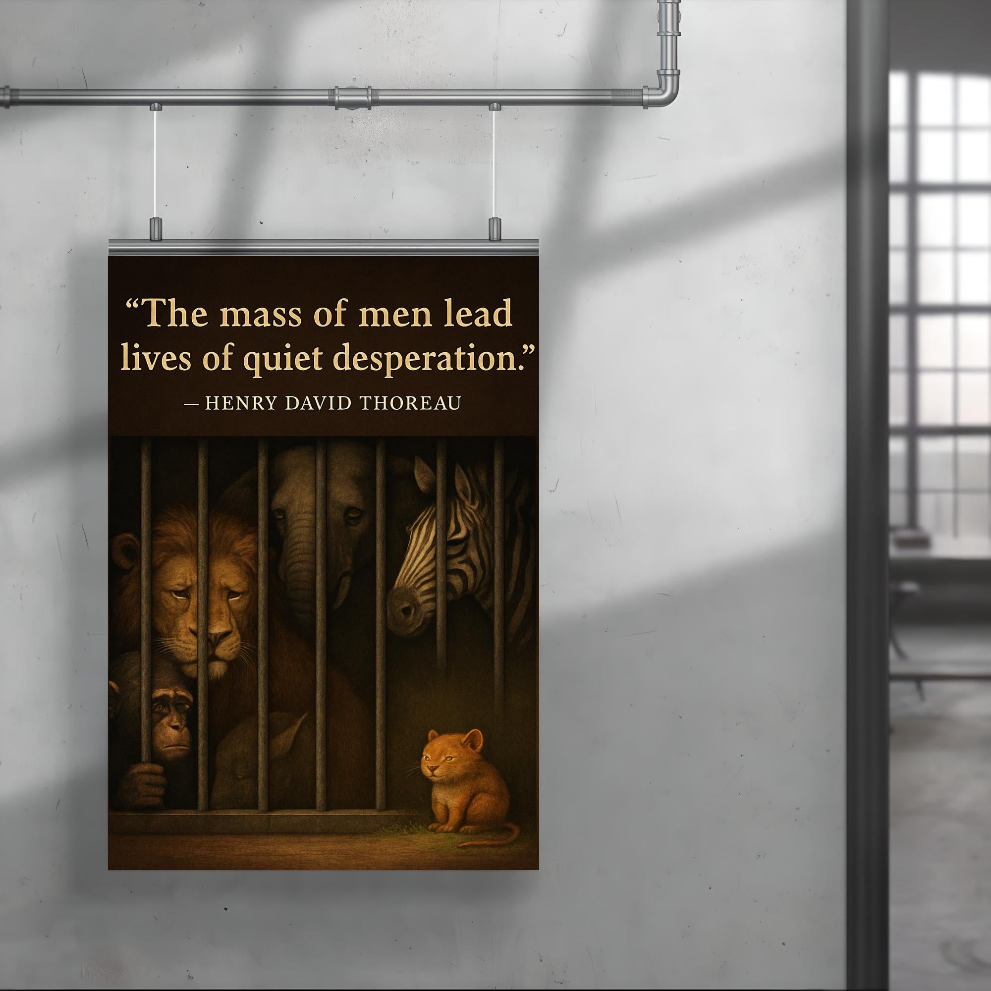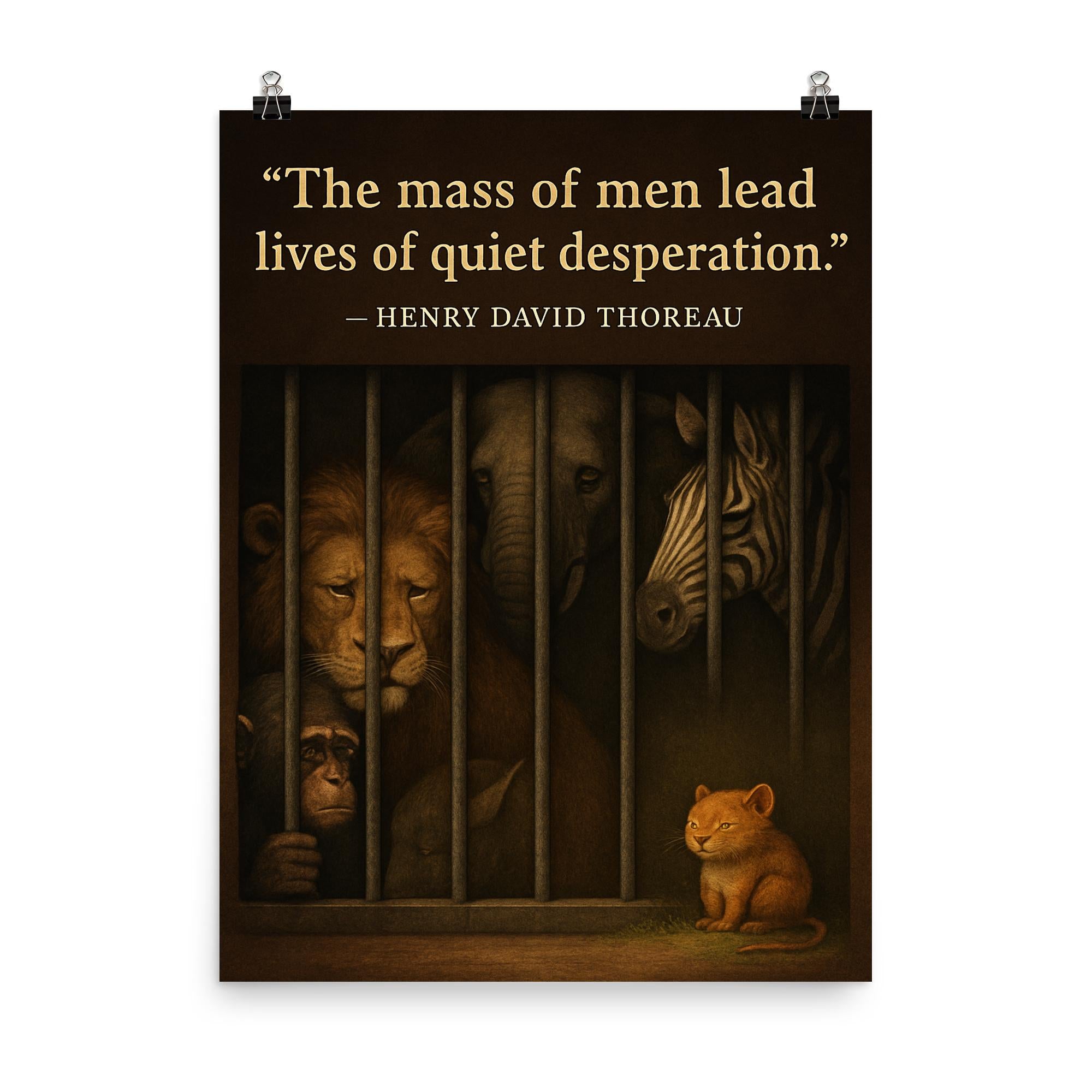 Capture the haunting truth behind Henry David Thoreau’s words with this powerful poster featuring his iconic quote on quiet desperation. Paired with a striking image of animals in a zoo, their somber expressions evoke a deep reflection on captivity and longing. A thought-provoking piece that inspires introspection and empathy, perfect for any space craving meaningful conversation.