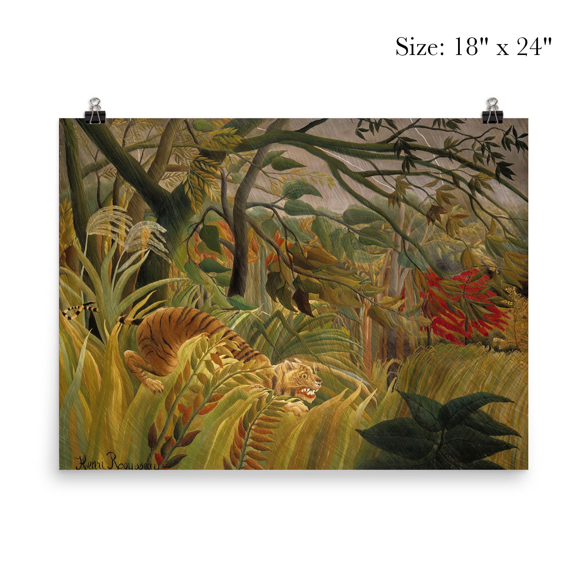Transform your space with the electrifying intensity of Henri Rousseau’s 1891 masterpiece, *Tiger in a Tropical Storm*. This poster captures the raw power and mysterious allure of the wild as the majestic tiger prowls through a tempestuous jungle. Bring home this timeless work of art to evoke a sense of adventure and vibrant energy in any room.