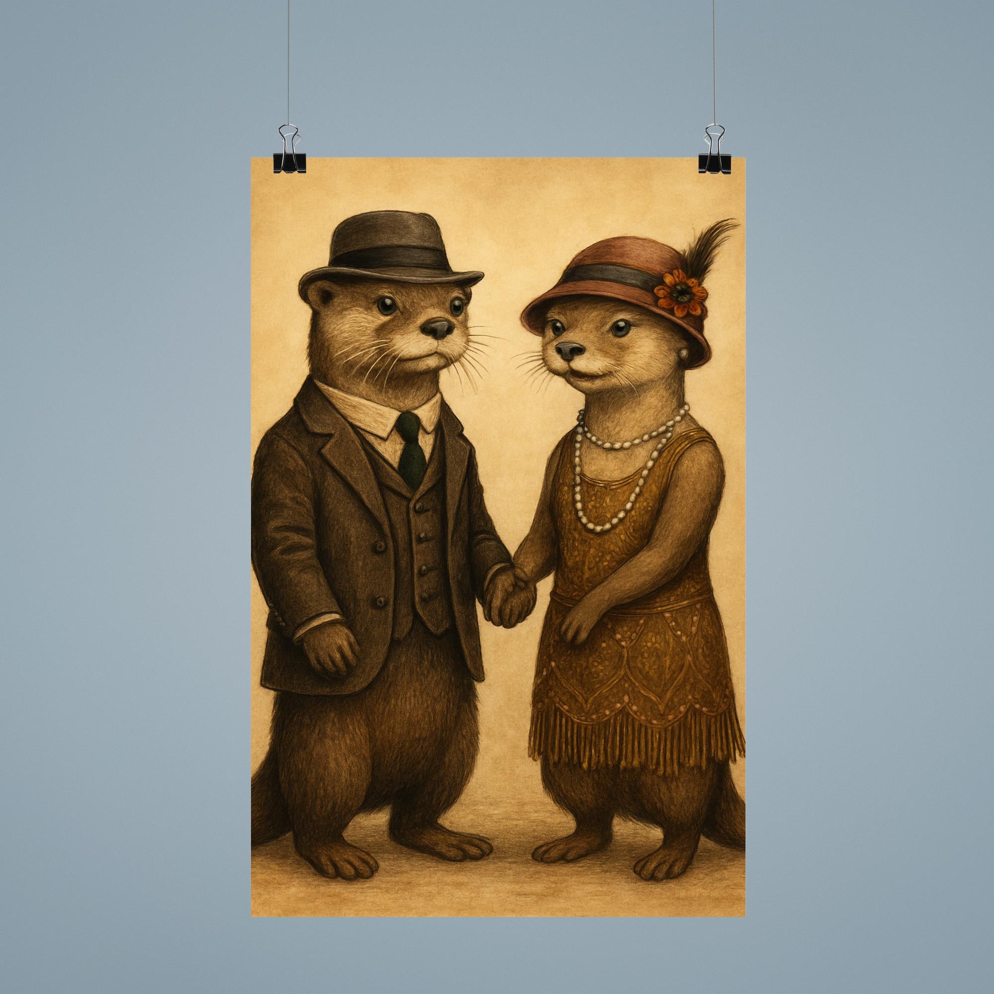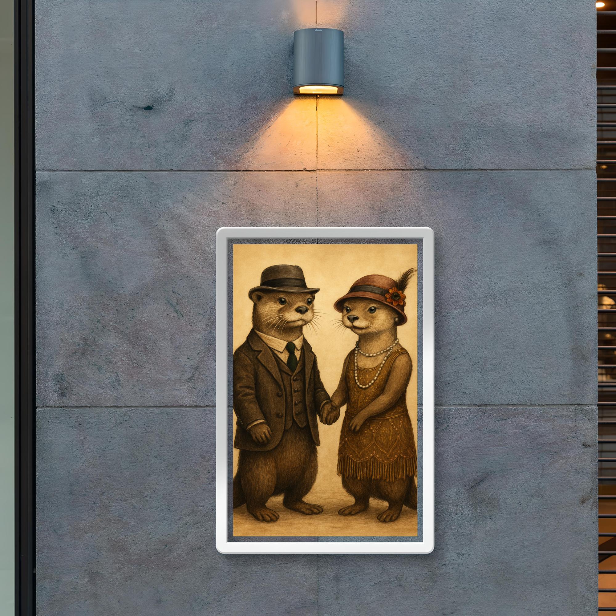 Step back in time with this charming poster featuring two otters dressed in 1920s attire, holding hands in a delightful display of vintage elegance and playful companionship. Perfect for adding a touch of whimsy and nostalgic flair to any space, this artwork captures a unique blend of charm and character that will brighten your walls and spark conversation.