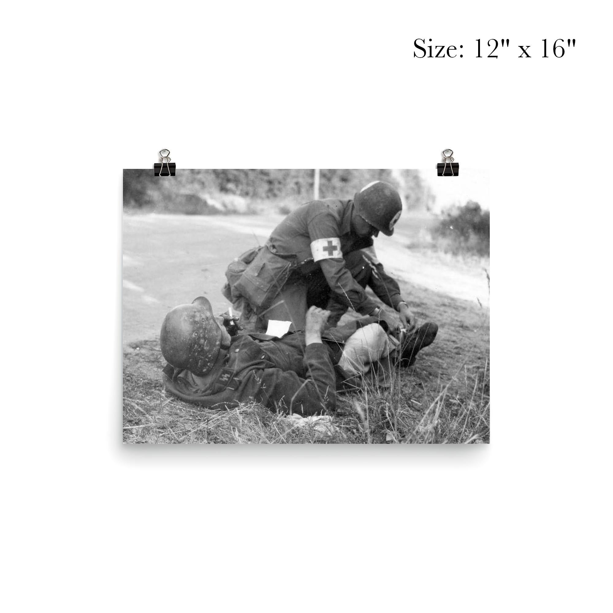 Capture a powerful moment of compassion and courage with this striking poster of a US medic providing first aid to a wounded German soldier in France, 1944. This evocative image honors the humanity that transcends conflict, reminding us of bravery and mercy even amid the chaos of war. Perfect for history enthusiasts and those inspired by stories of healing and hope.