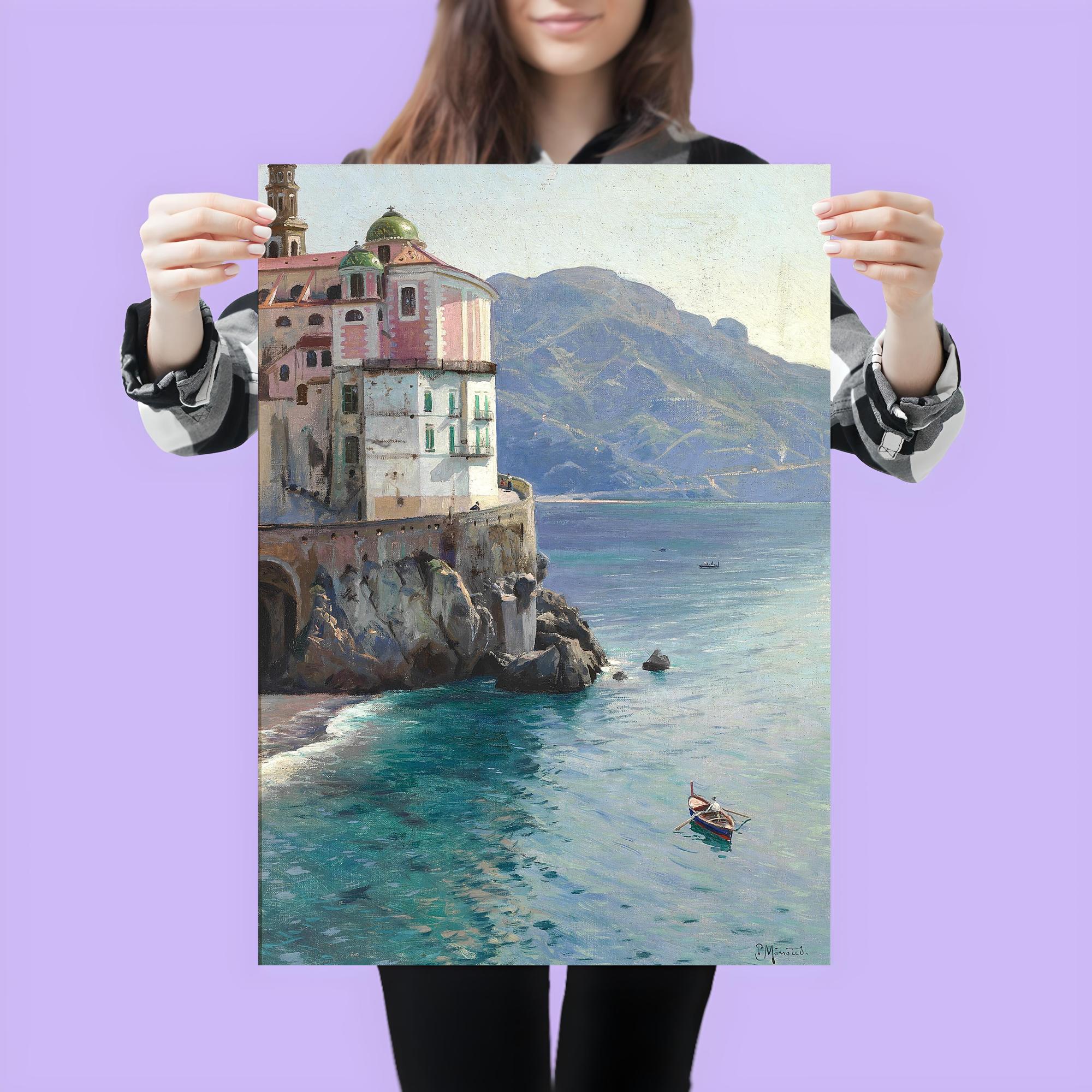 Transform your space with the timeless beauty of Peder Mork Mønsted’s 1925 masterpiece, "View of the Atrani Coast Near Amalfi, Italy." This exquisite poster captures the serene charm and sunlit elegance of the Italian coast, inviting a sense of tranquility and classic European allure into any room. Perfect for lovers of fine art and breathtaking landscapes, it’s a window to a world where history and nature gracefully meet.