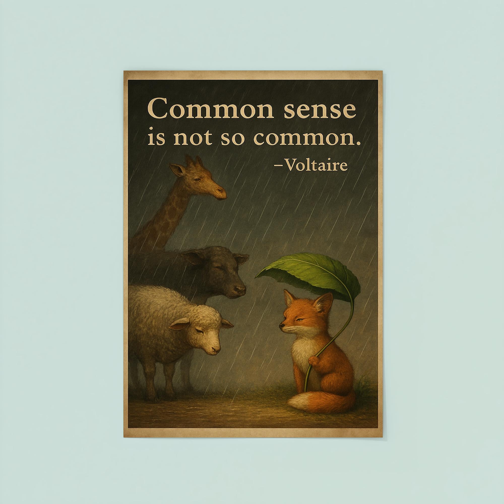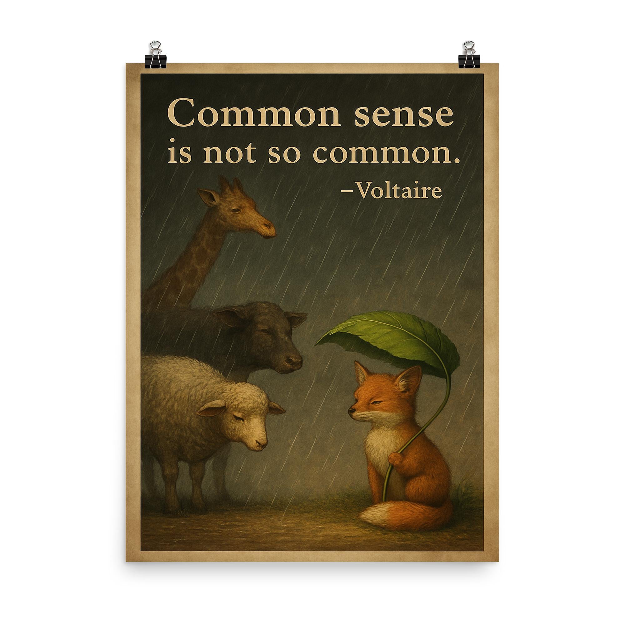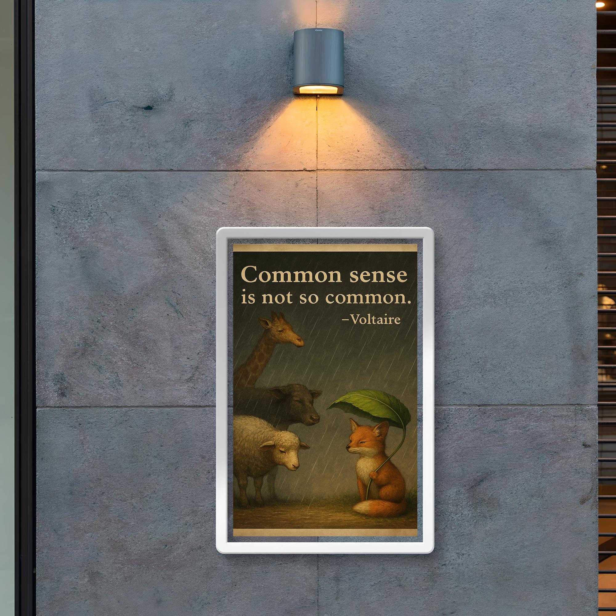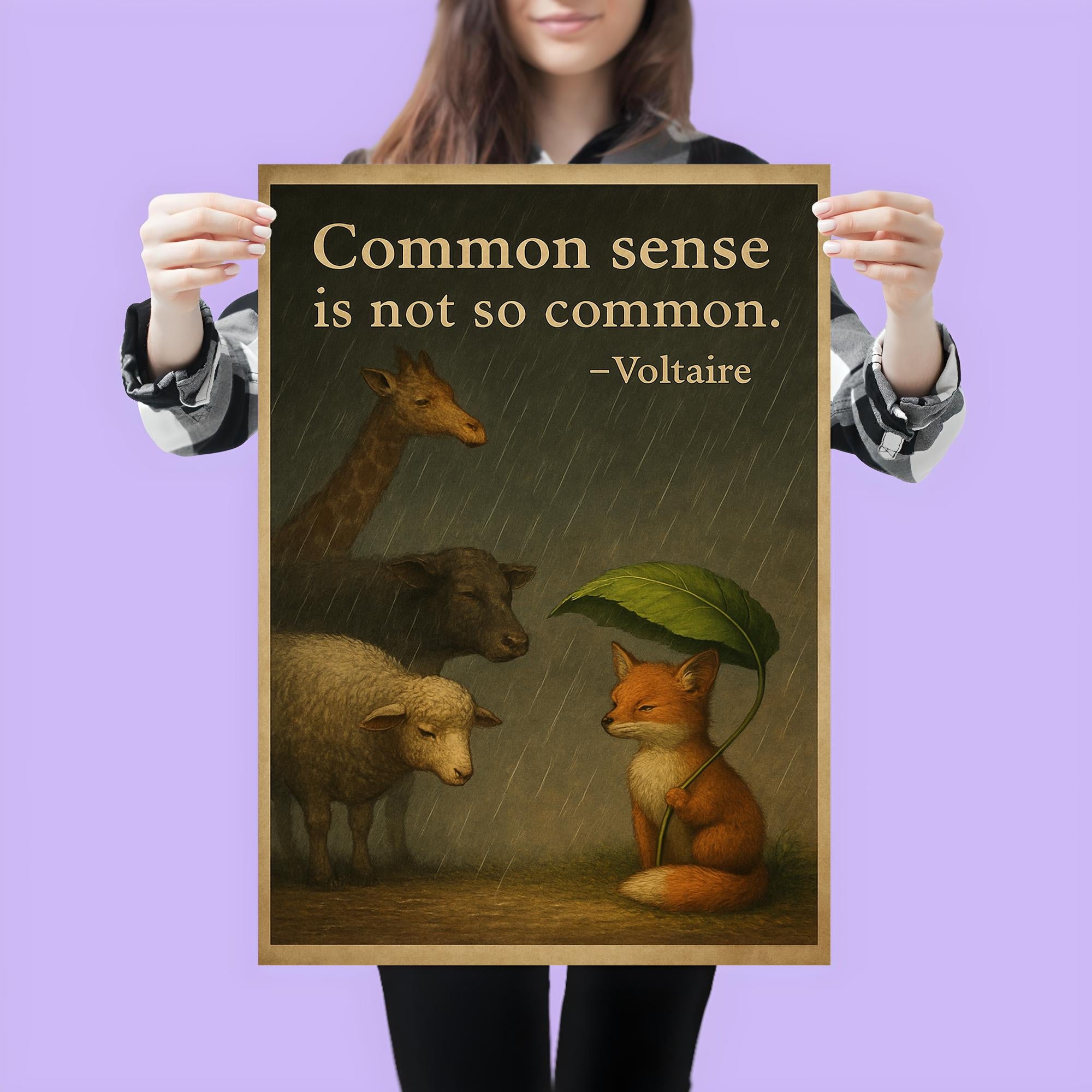 Elevate your space with this inspiring poster featuring Voltaire’s timeless quote on common sense, animal shelter, and rain. A perfect reminder to embrace wisdom and compassion, it brings thoughtful motivation to any room. Let these powerful words spark reflection and uplift your everyday environment.