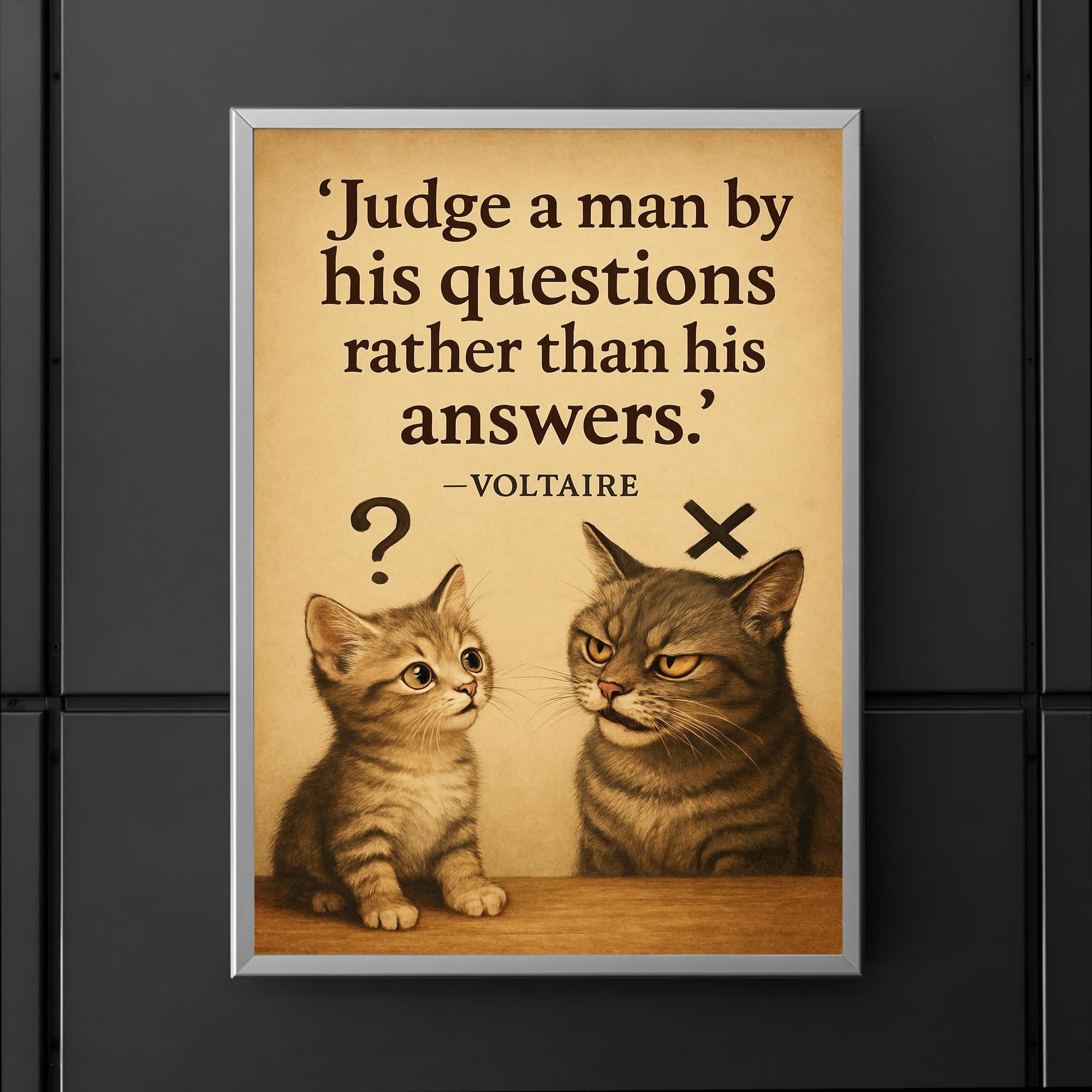Embrace the wisdom of Voltaire with this inspiring poster featuring the timeless quote, "Judge a man by his questions rather than his answers," alongside charming illustrations of a curious kitten and a know-it-all cat. Perfect for sparking thoughtful reflection in any space, this poster combines sharp insight with a playful touch to brighten your walls and mind alike.