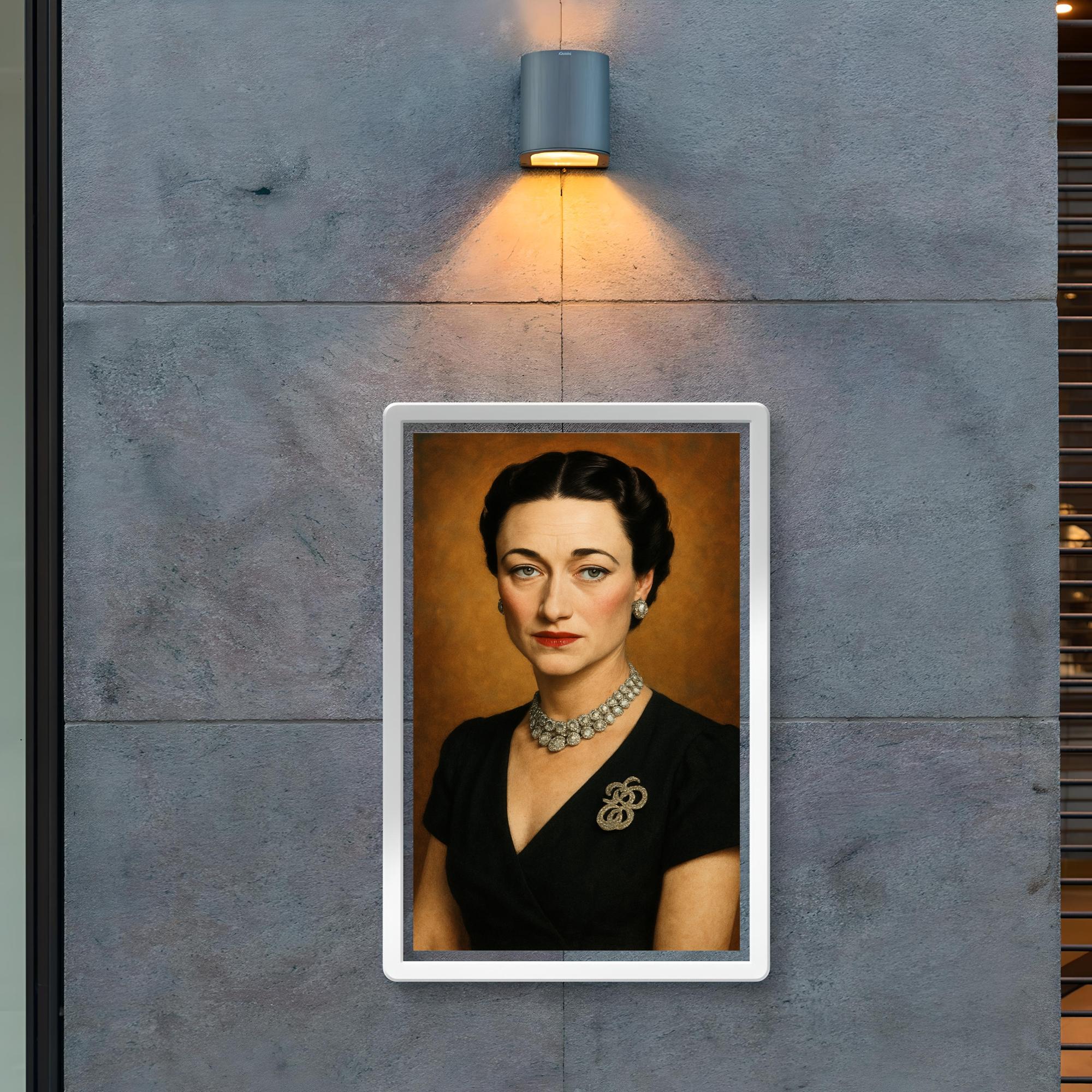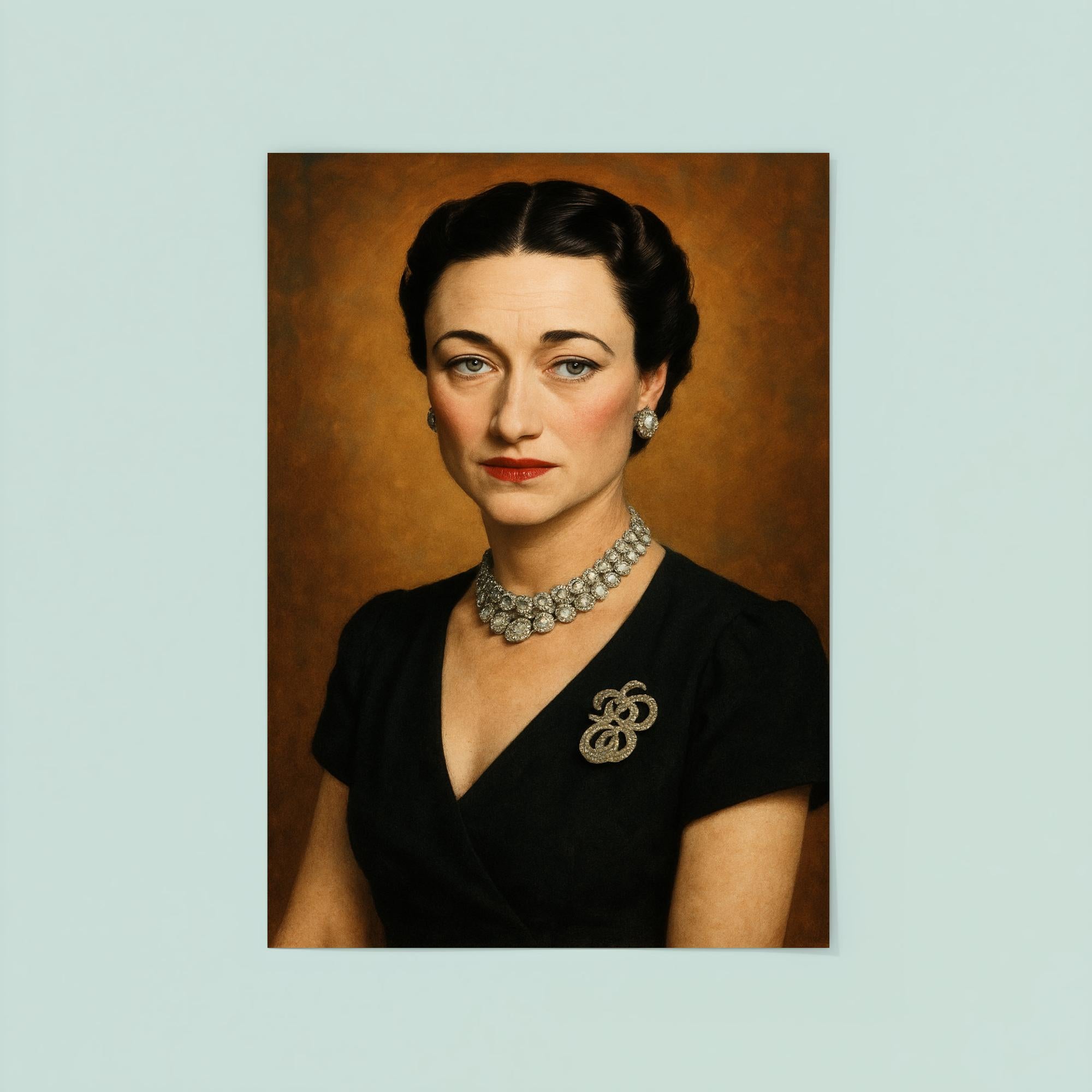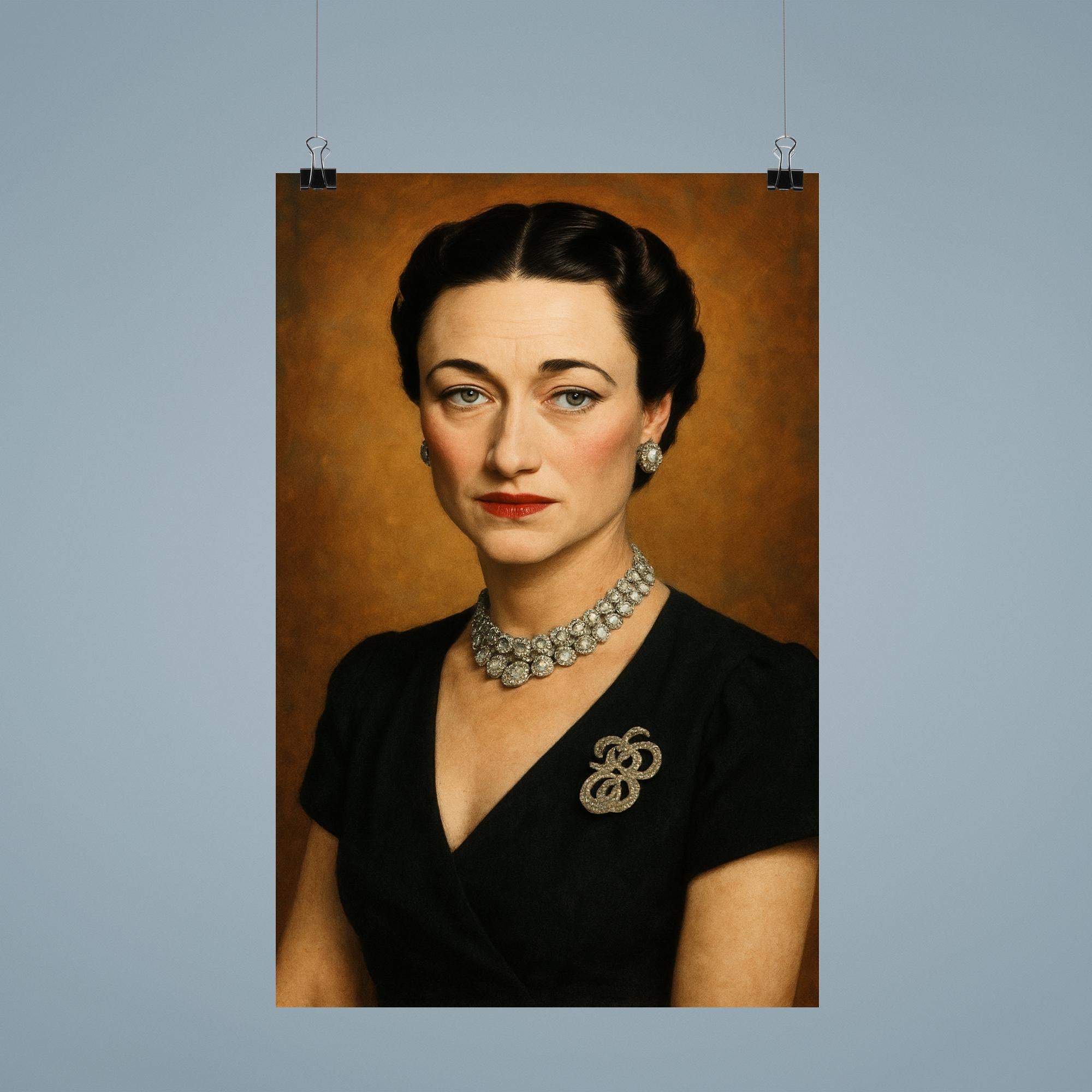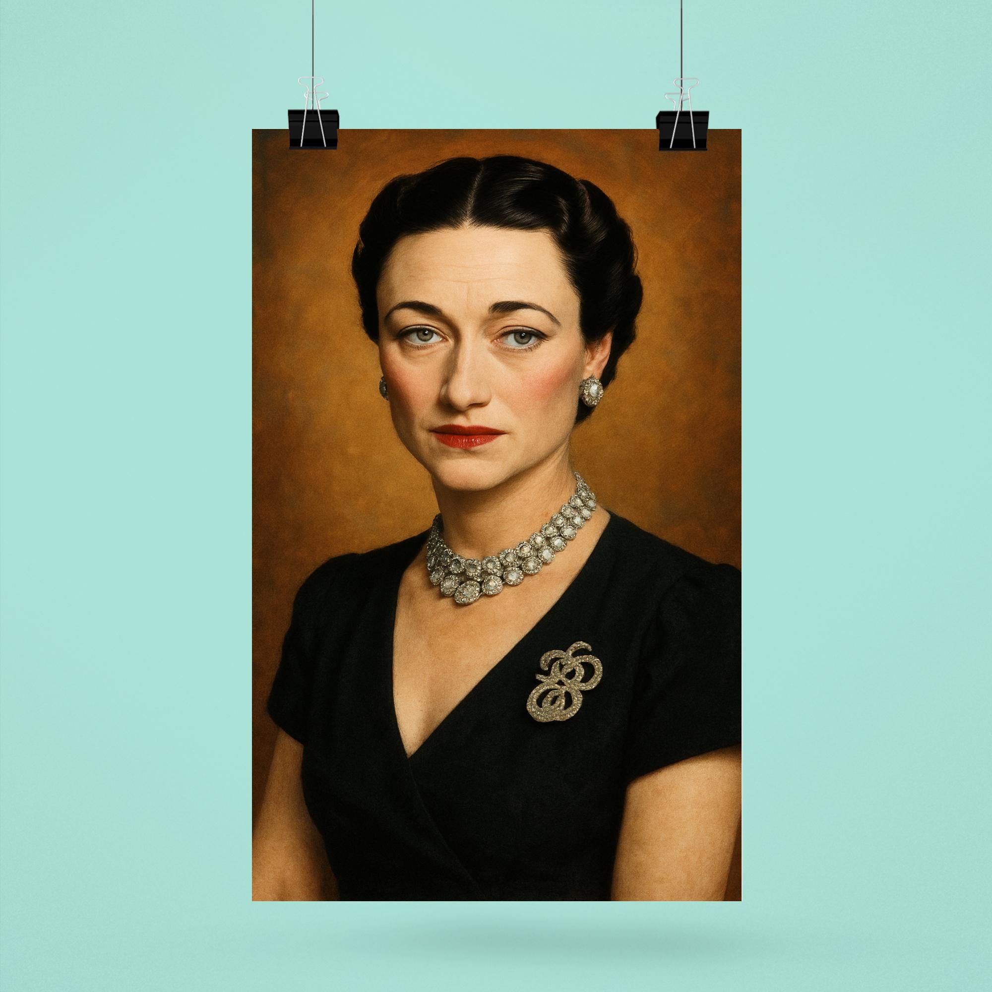 Celebrate timeless elegance and intrigue with this striking Wallis Simpson poster. Capturing the essence of one of history’s most fascinating figures, this artwork brings a touch of vintage glamour and bold sophistication to any space. Perfect for admirers of iconic style and captivating stories, this poster turns your wall into a tribute to enduring allure.