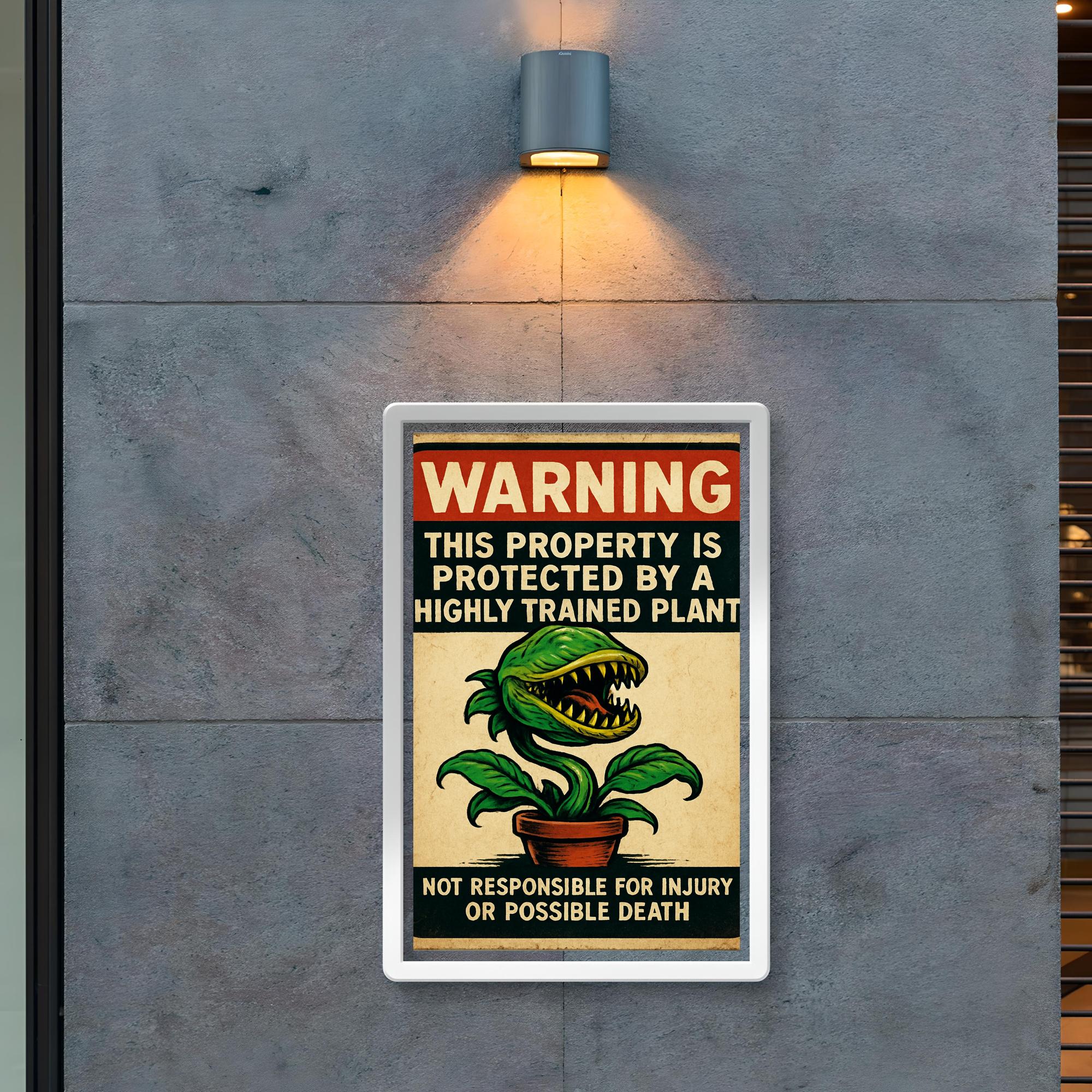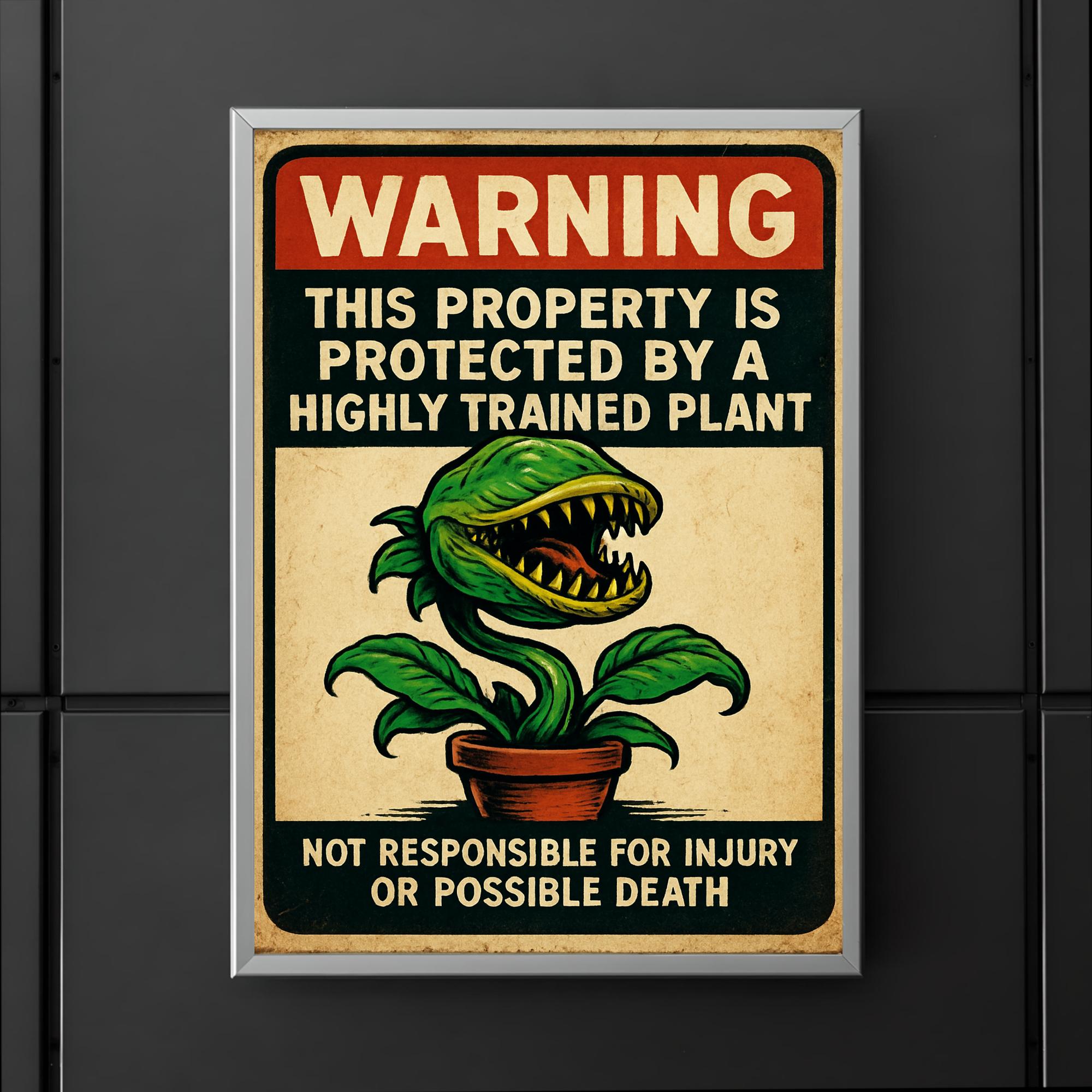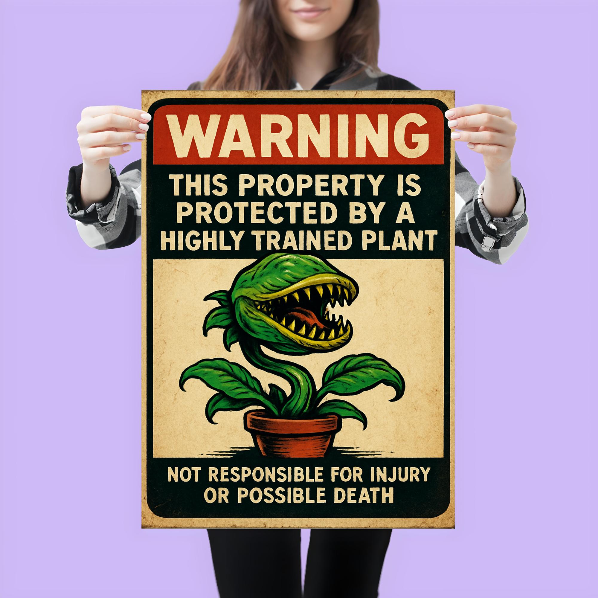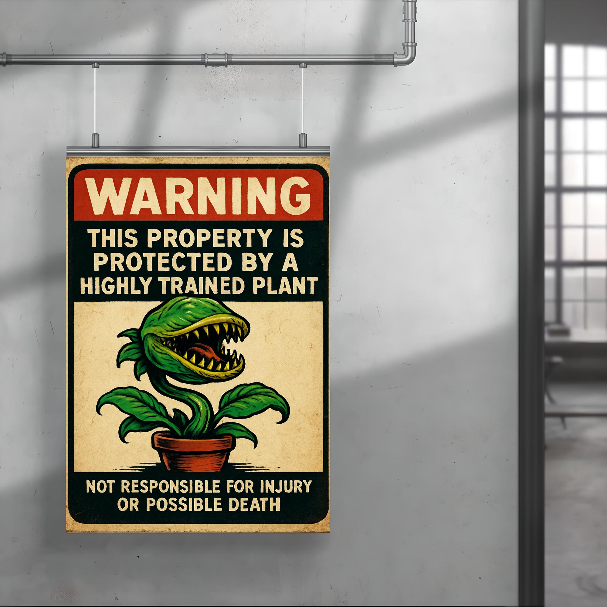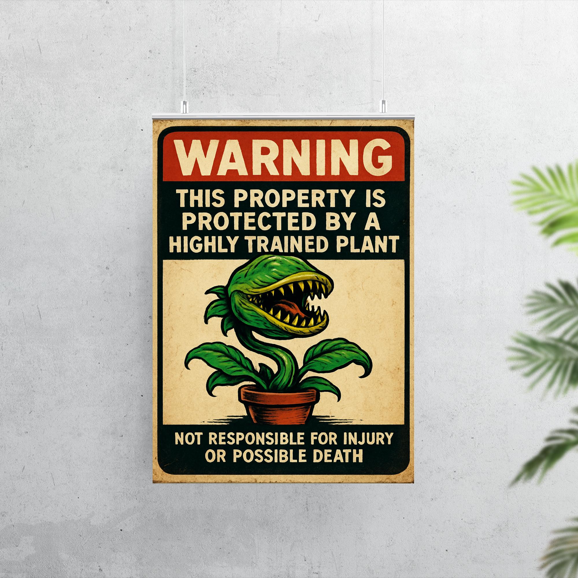 Add a touch of humor and bold character to your space with this striking "WARNING: This property is protected by a highly trained plant" poster. Perfect for plant lovers and pranksters alike, it delivers a clever twist on traditional security signs that’s sure to spark smiles and start conversations. Durable and eye-catching, this poster turns a simple message into a playful statement you’ll love displaying.