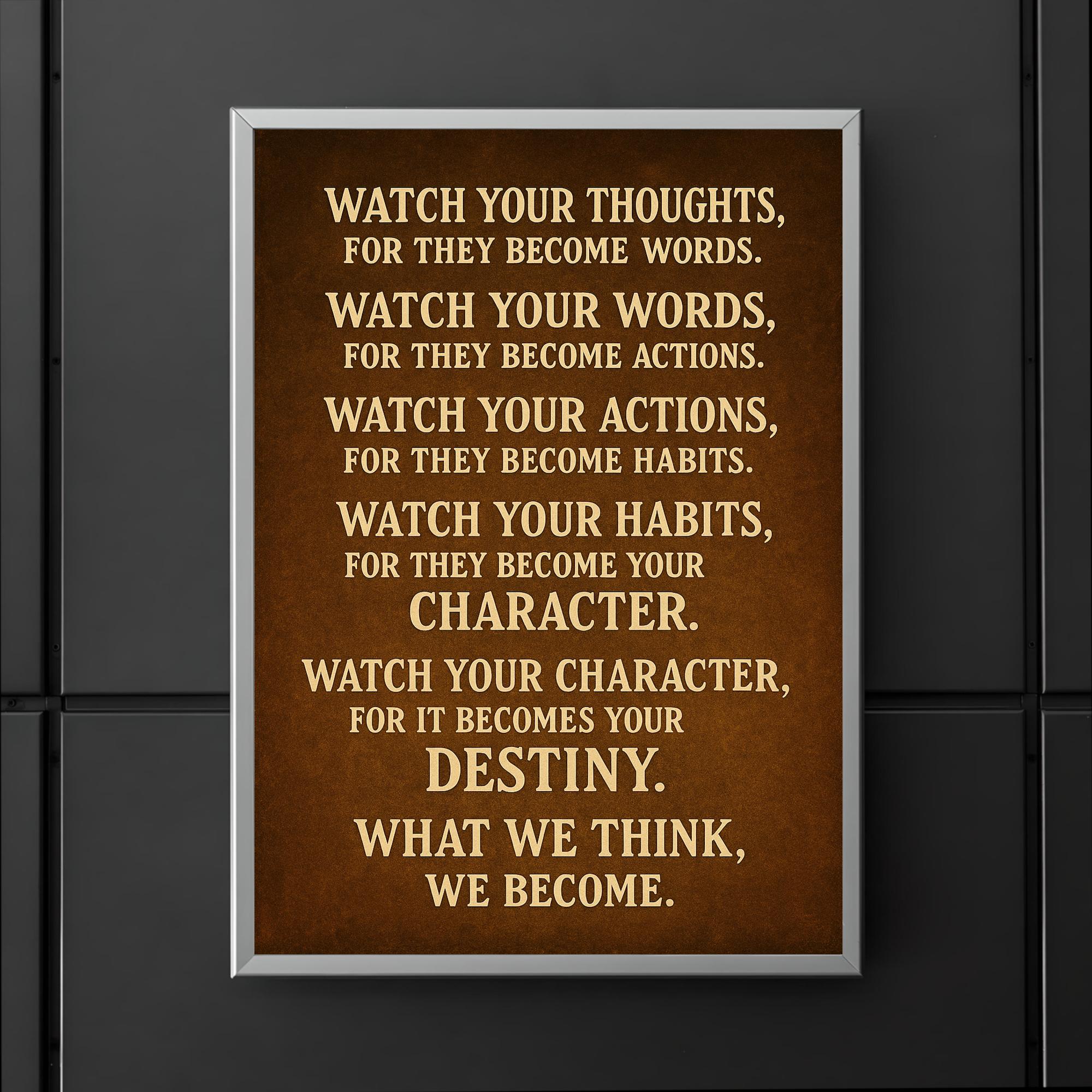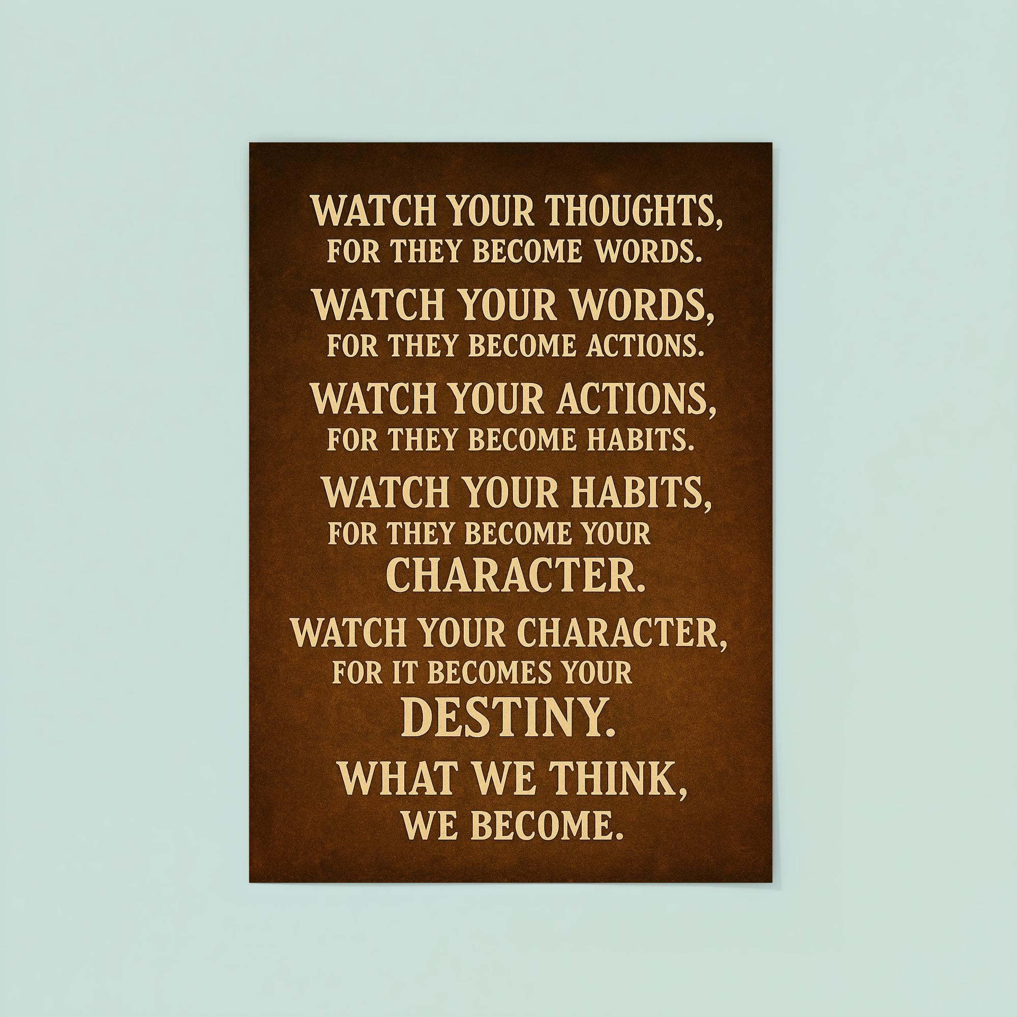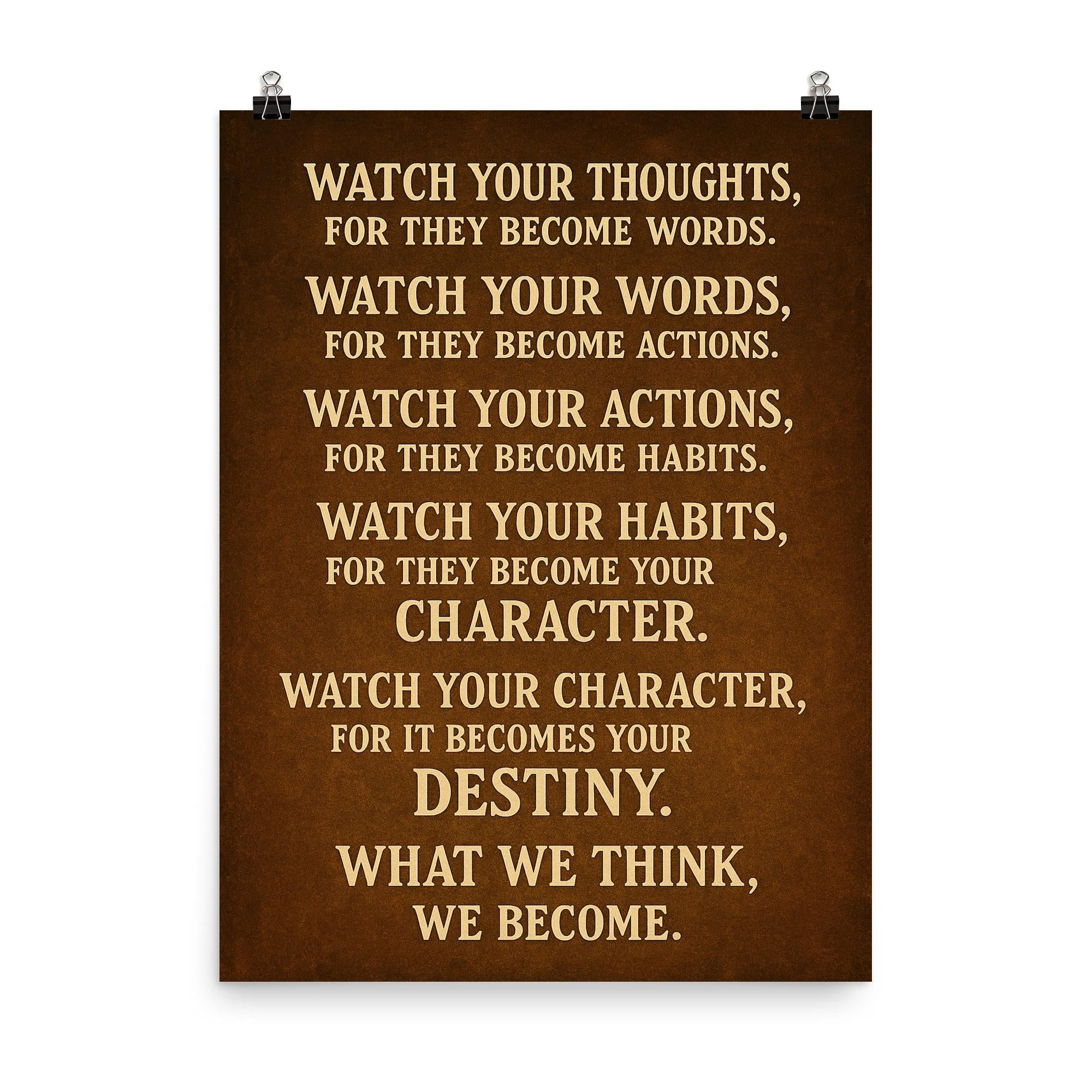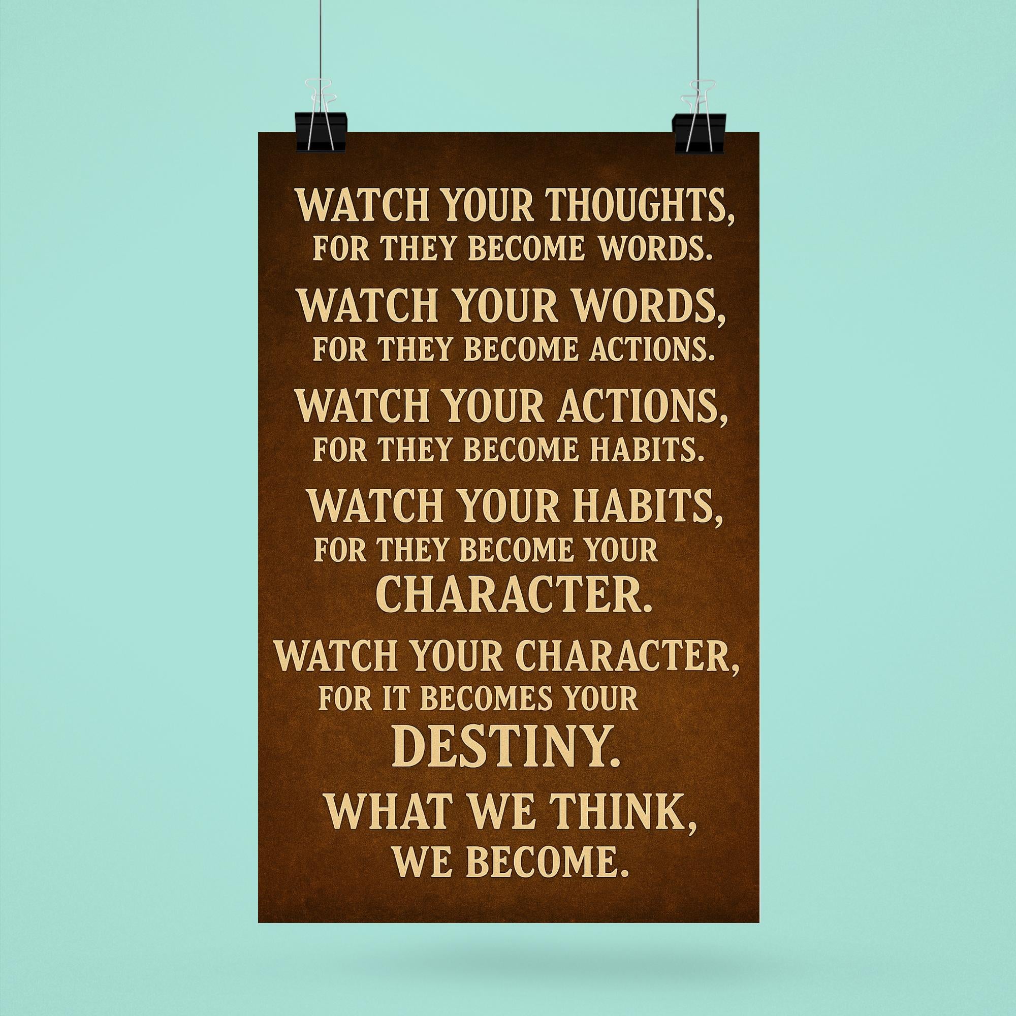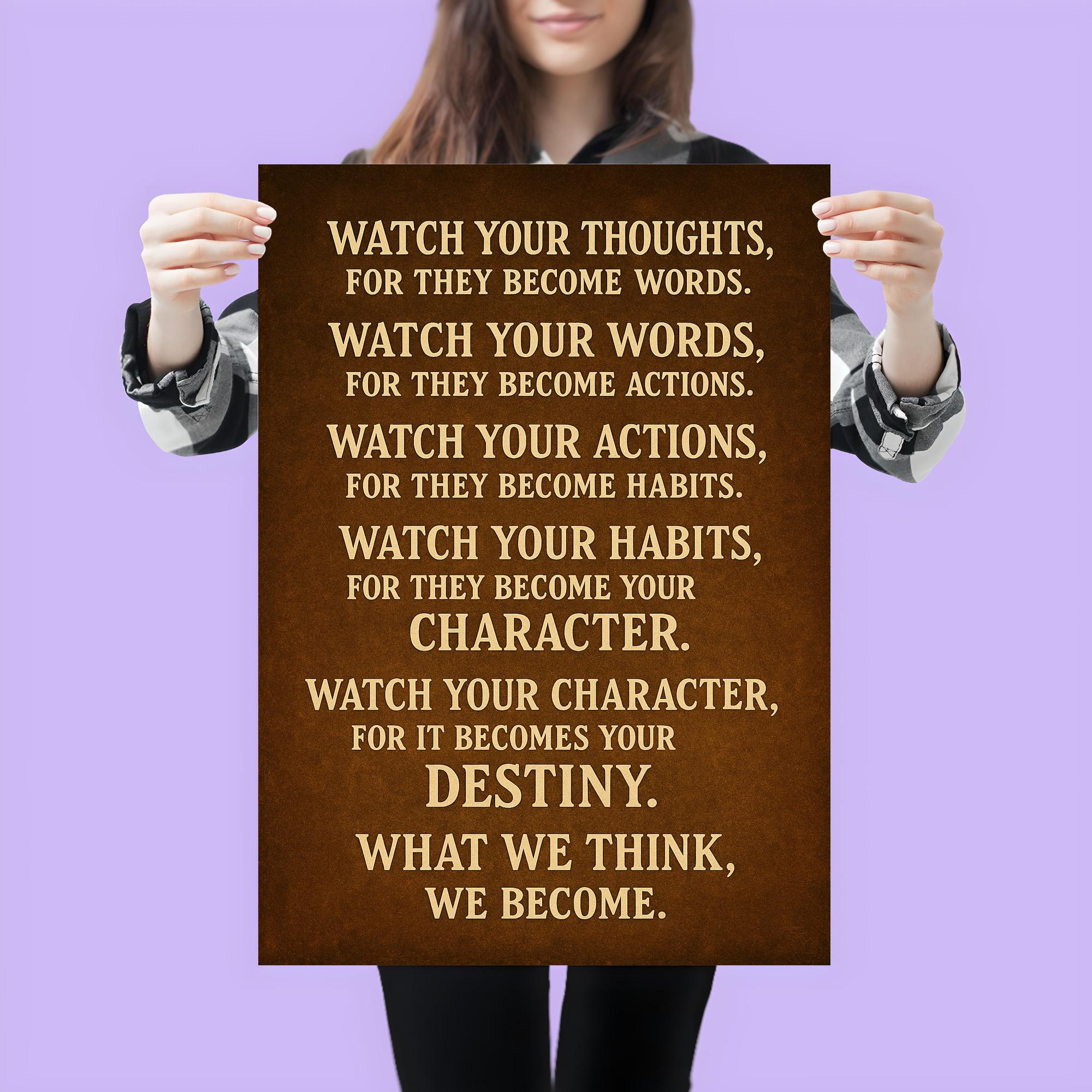 Inspire daily mindfulness with this powerful "Watch your thoughts for they become words" poster. A timeless reminder that the path to your destiny begins with the thoughts you cultivate—perfect for fueling motivation and intentional living in any space. Elevate your mindset and let every word you speak shape the future you deserve.