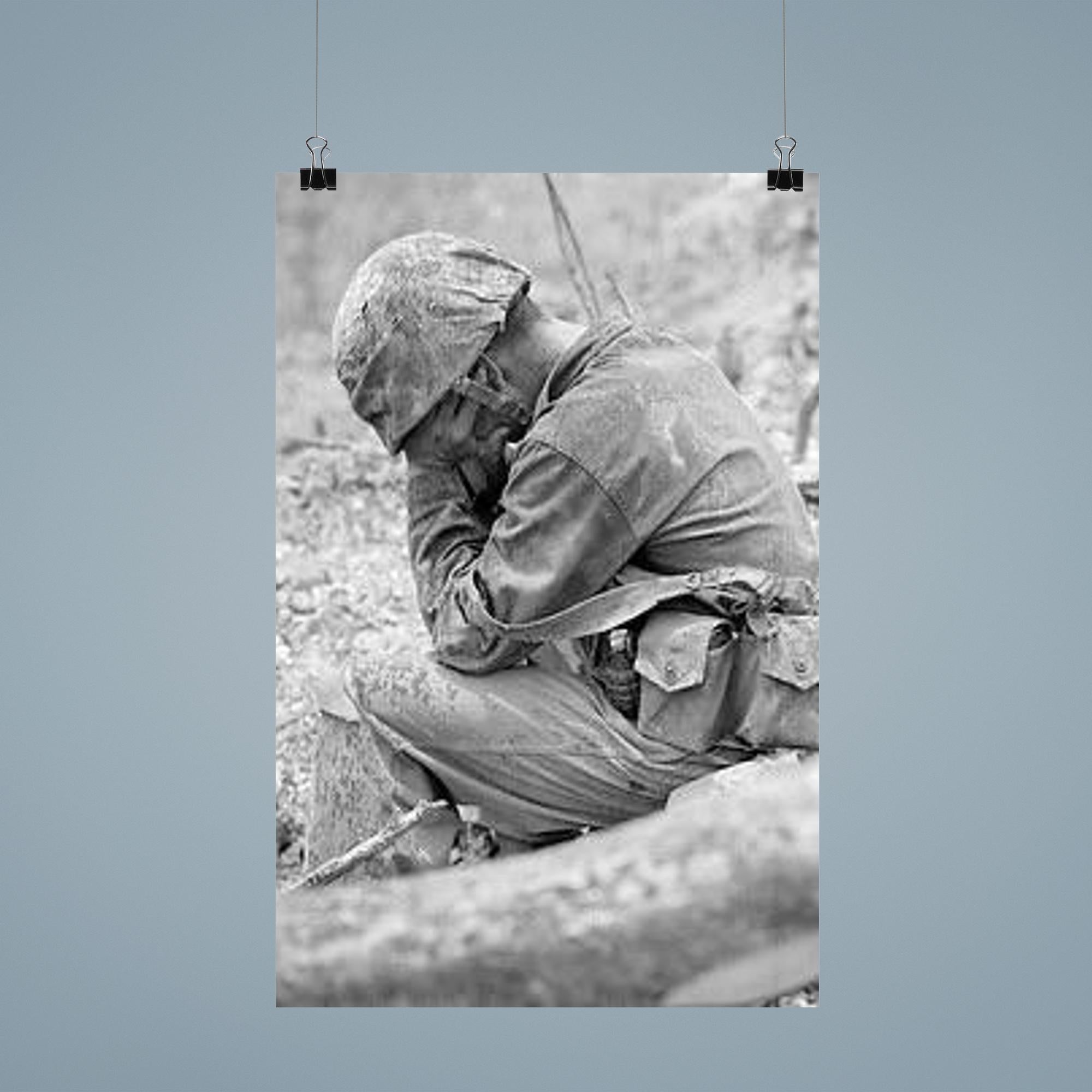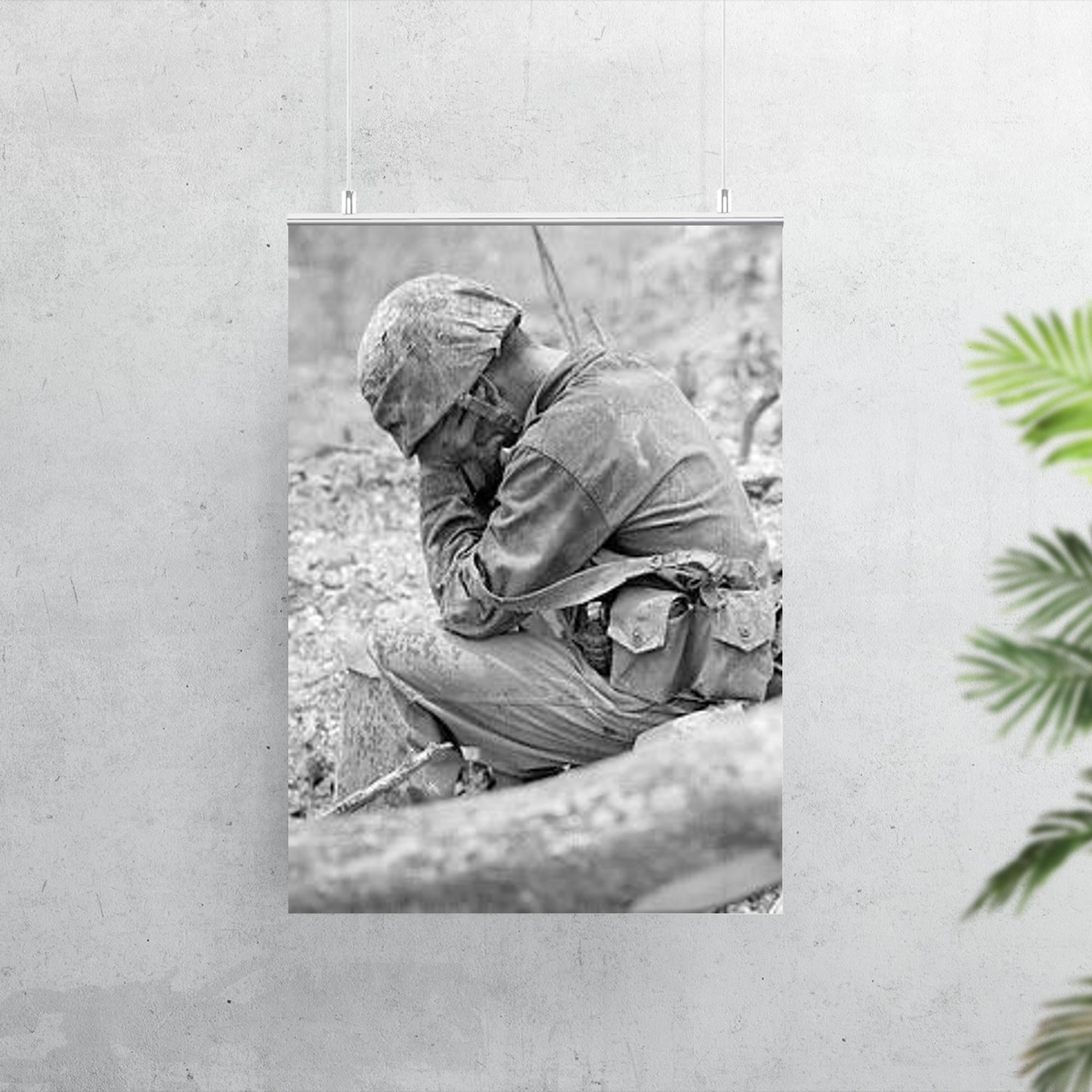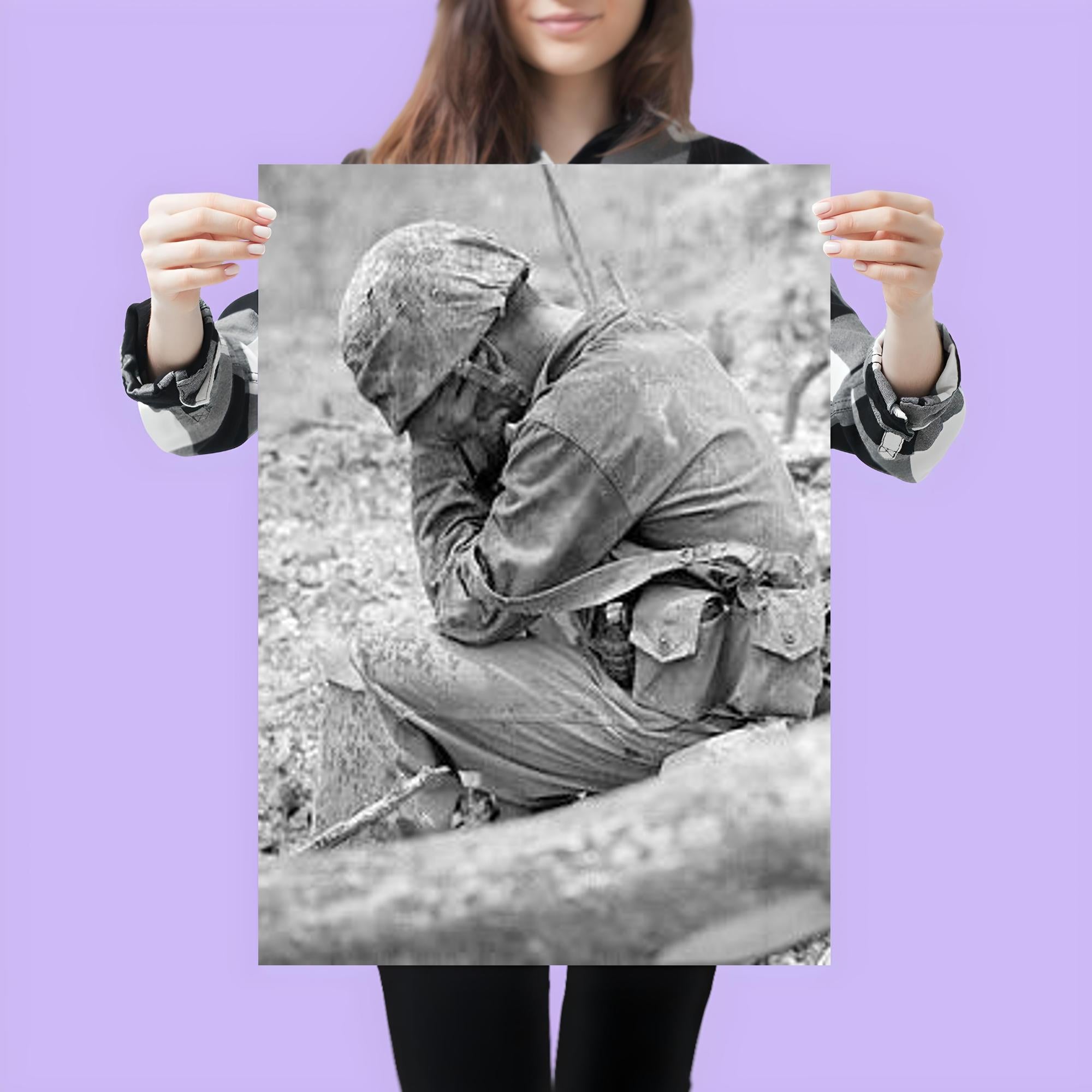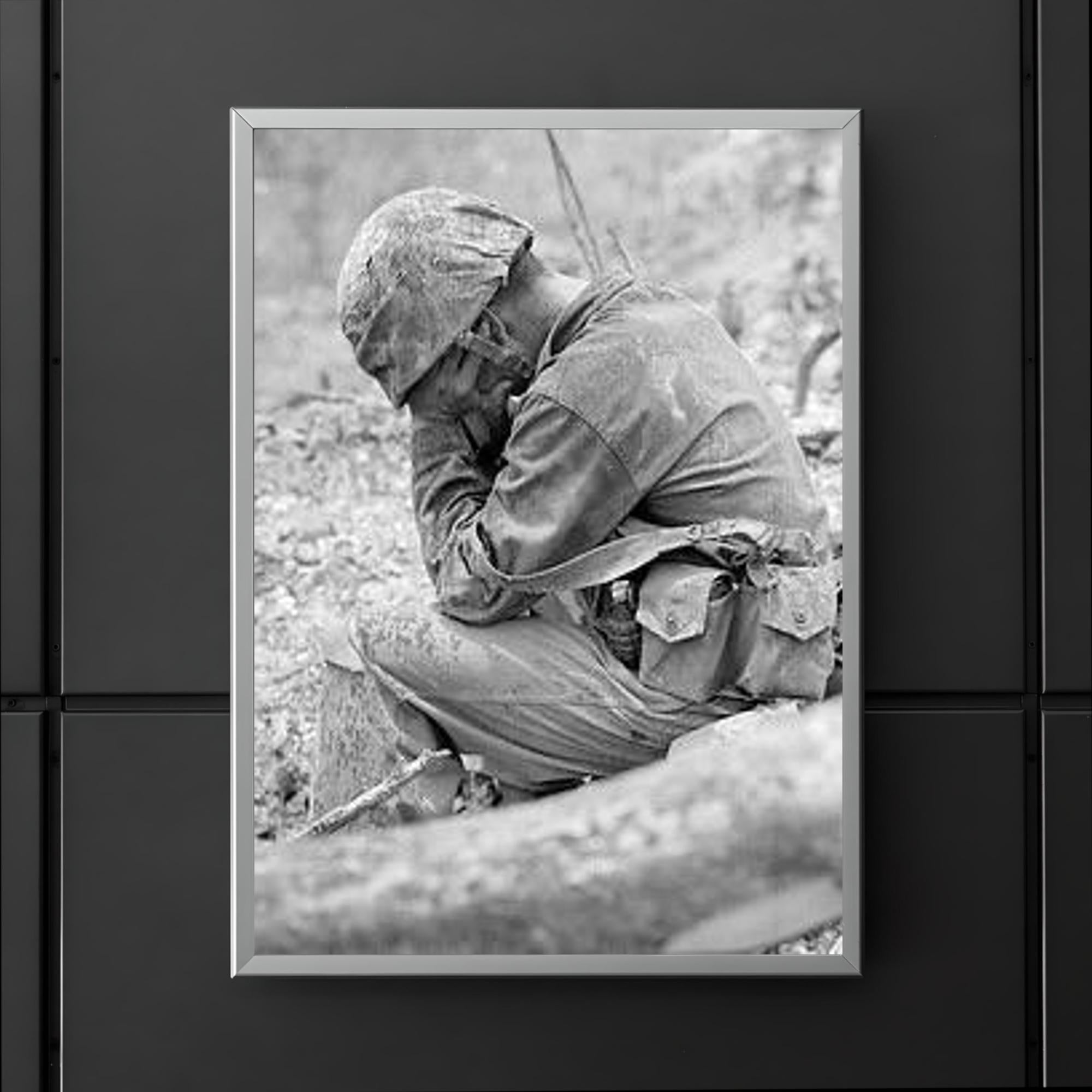Capture the profound emotion of sacrifice and resilience with this striking poster of a weary marine weeping amid the rubble after the fierce Battle for Hill 200, August 1944. This powerful image honors the untold stories of courage and the human cost of war, serving as a poignant reminder of strength through hardship. Perfect for history enthusiasts and collectors, this poster brings a solemn moment of World War II vividly to life.