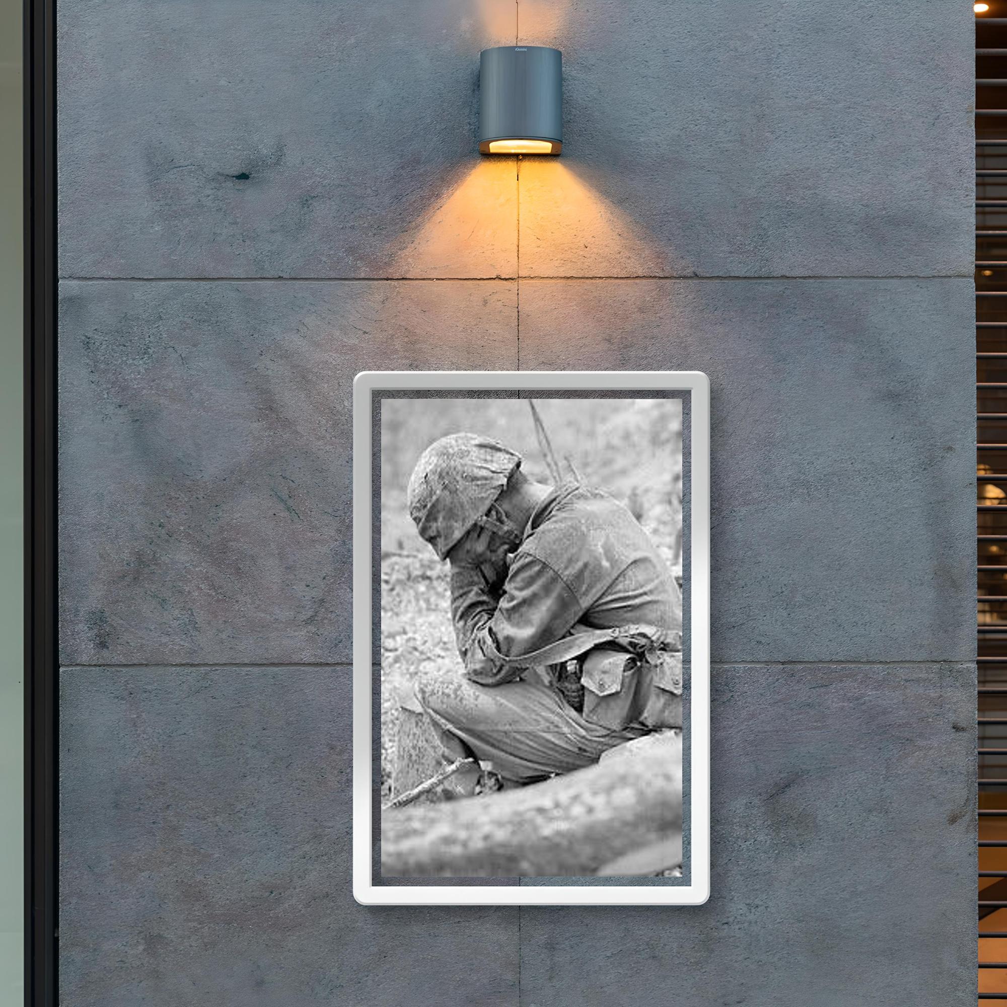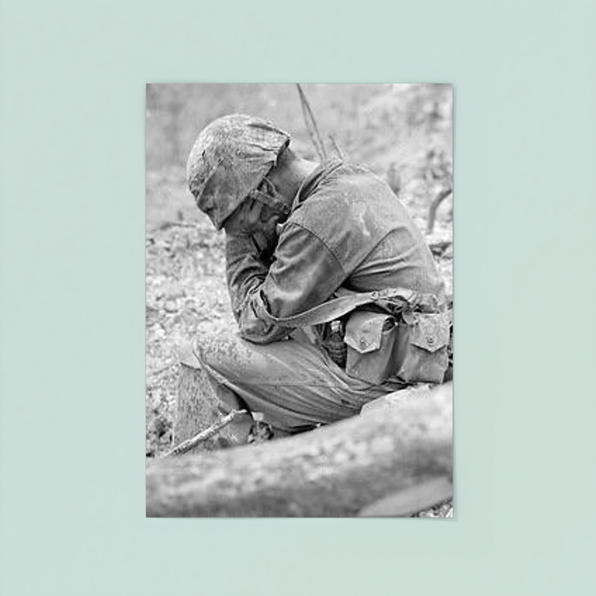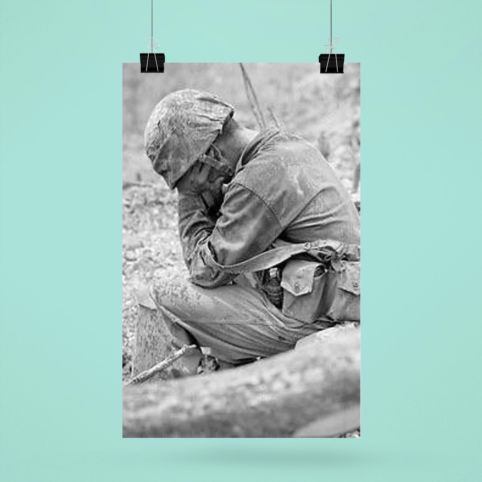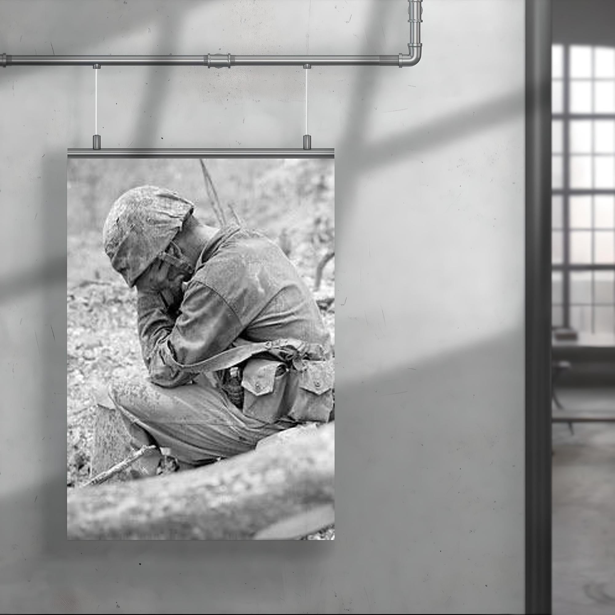 Capture the profound emotion of sacrifice and resilience with this striking poster of a weary marine weeping amid the rubble after the fierce Battle for Hill 200, August 1944. This powerful image honors the untold stories of courage and the human cost of war, serving as a poignant reminder of strength through hardship. Perfect for history enthusiasts and collectors, this poster brings a solemn moment of World War II vividly to life.