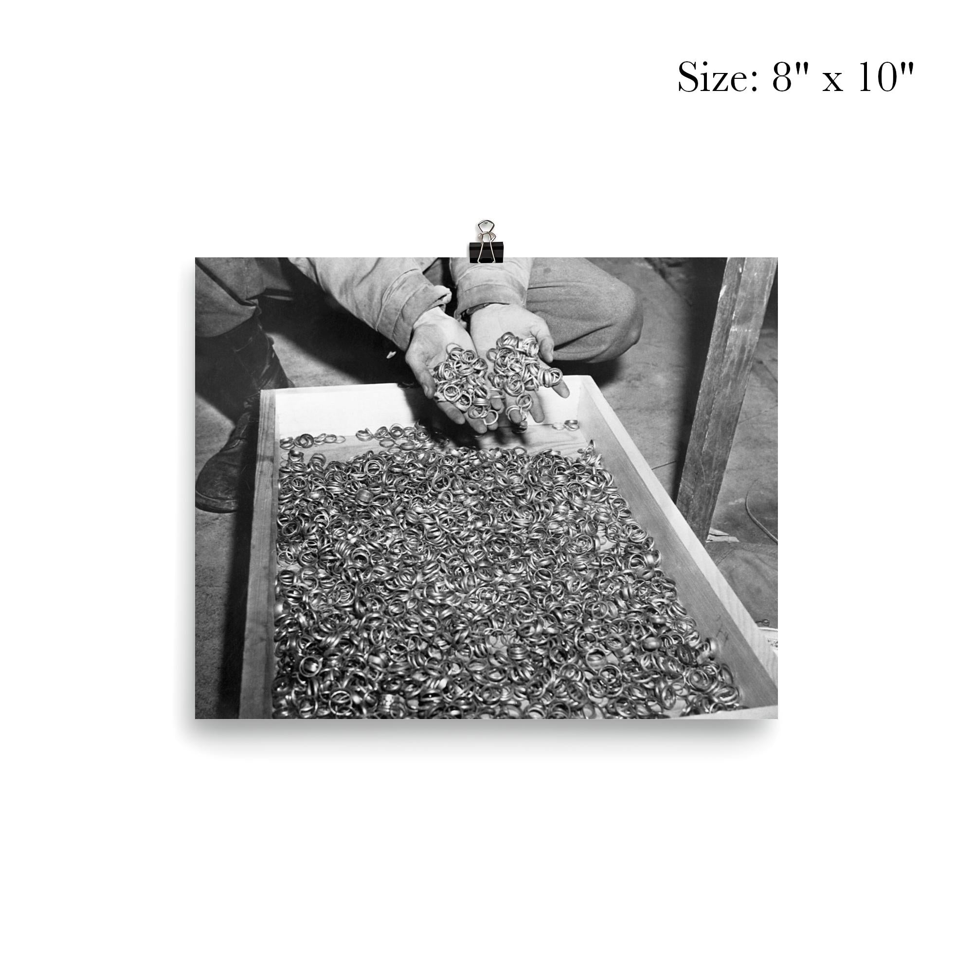 This powerful poster captures the somber legacy of Holocaust victims through an evocative display of wedding rings collected in 1945. A poignant reminder of lives and love interrupted, it invites reflection on history’s deepest tragedies with quiet dignity. Perfect for those seeking to honor memory and resilience, this poster transforms any space into a place of profound remembrance.