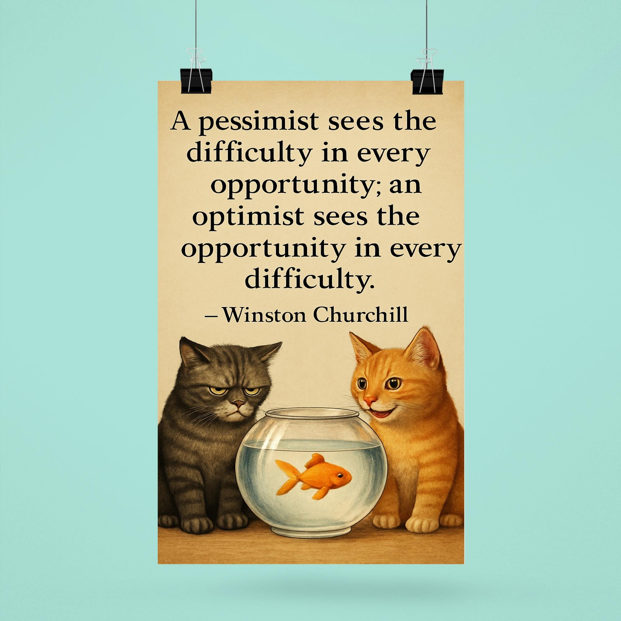 Embrace the timeless wisdom of Winston Churchill with this striking poster featuring his famous reflection on optimism and pessimism. Perfect for inspiring resilience and perspective, it’s a powerful reminder that attitude shapes our experience. Whether in an office, study, or living space, this piece sparks thought and motivation every day.