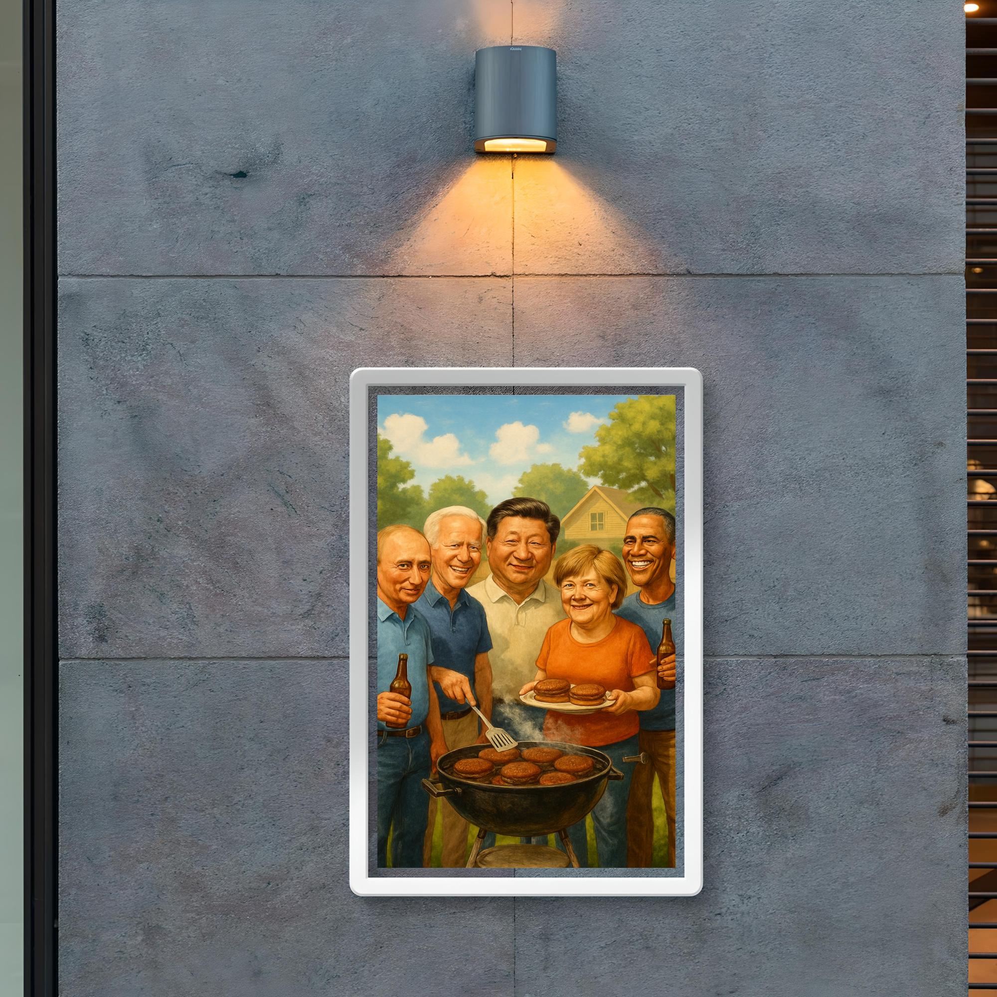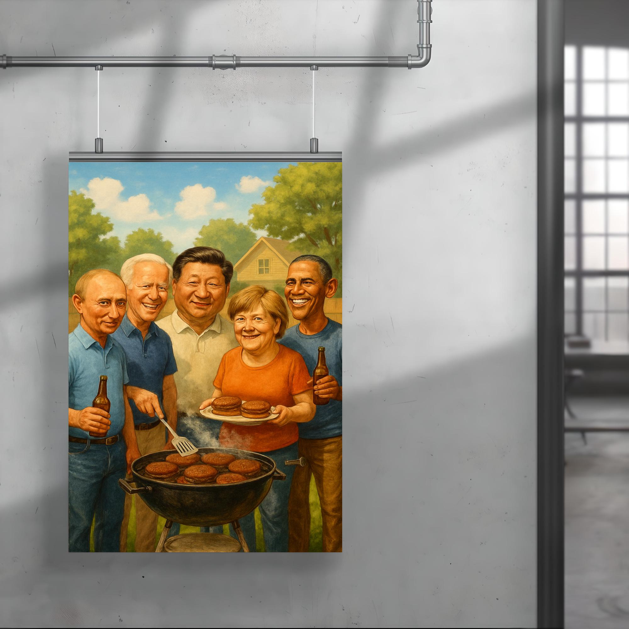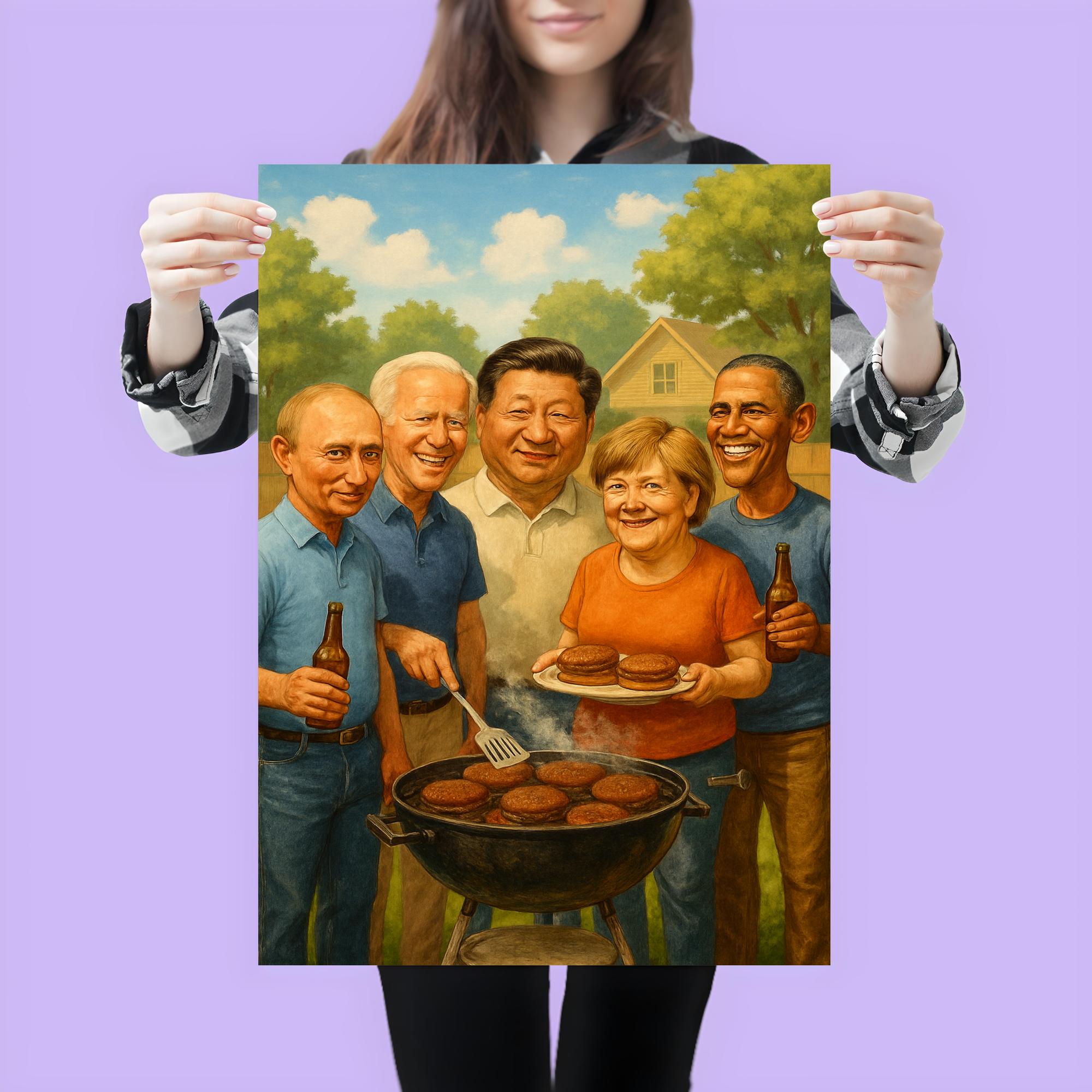 Bring a playful twist to your space with this striking poster featuring world leaders enjoying a relaxed backyard BBQ. The unexpected scene of powerful figures casually grilling burgers sparks conversation and adds a touch of humor and humanity to any room. Perfect for sparking smiles and inviting a fresh perspective on global camaraderie.