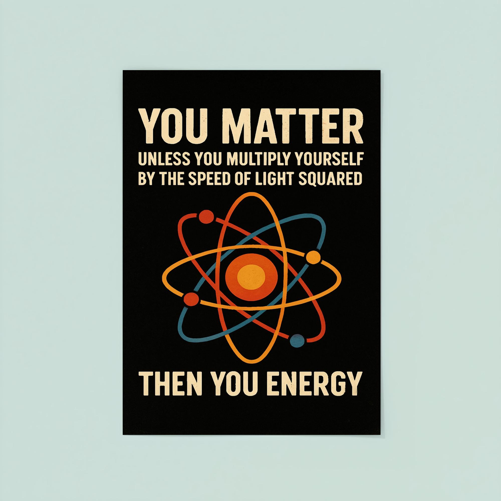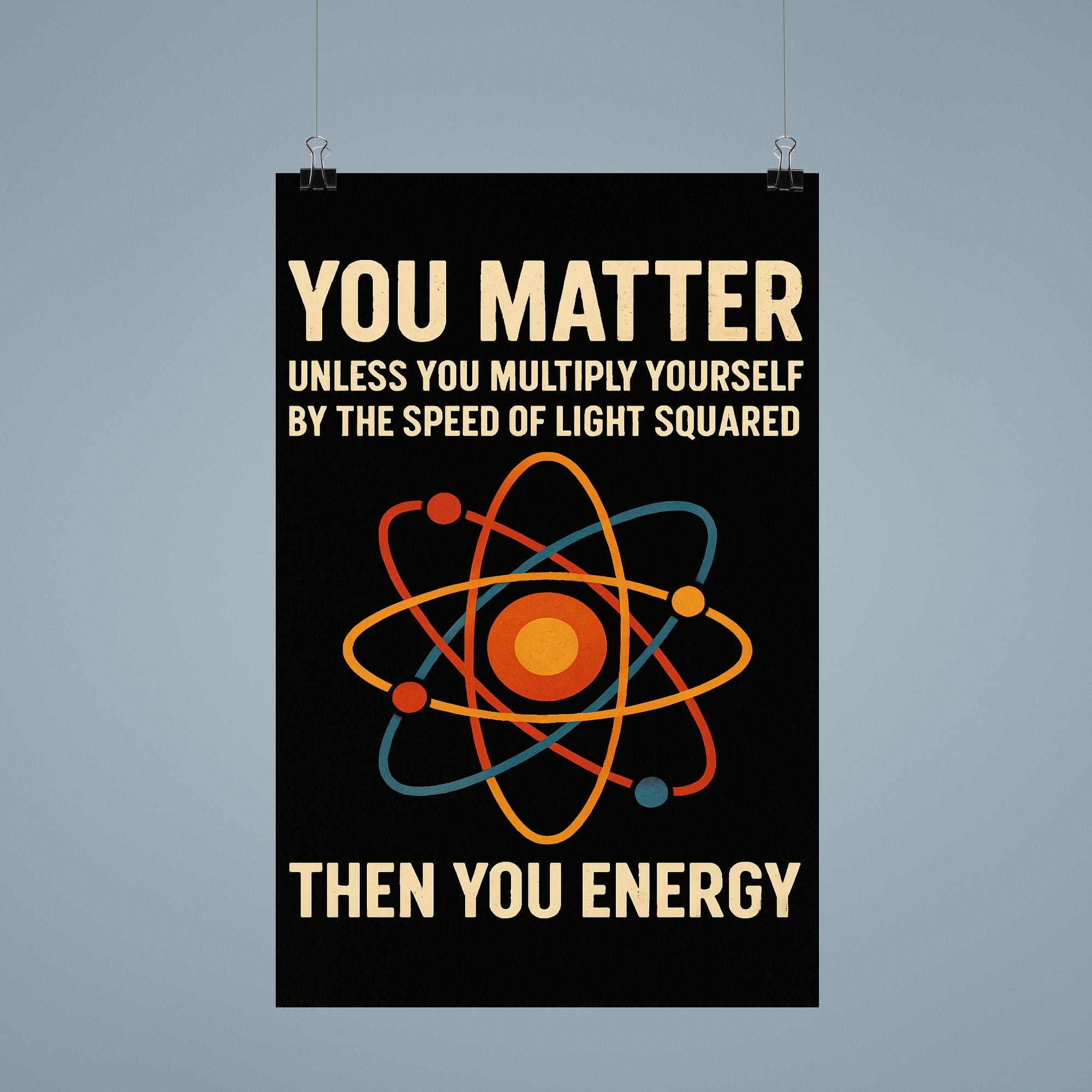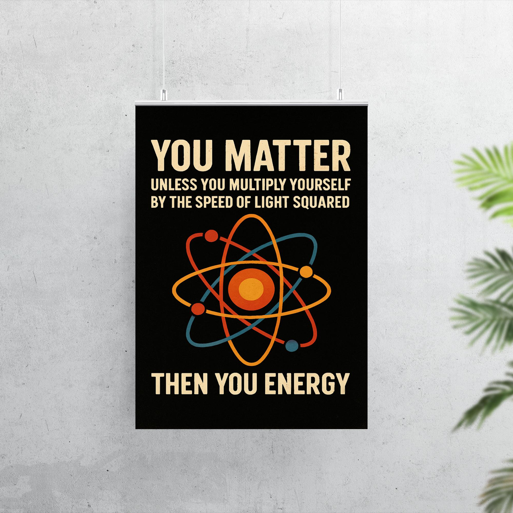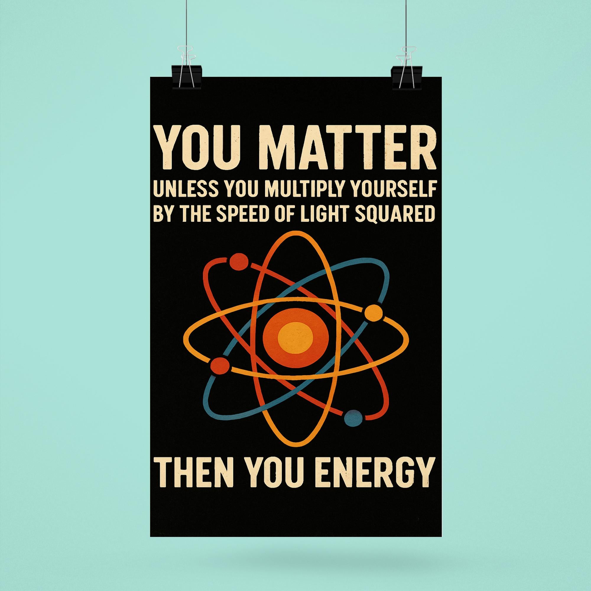 Inject a dose of humor and smarts into any space with this witty physics poster! Featuring the clever twist, "You matter... unless you multiply by energy," it’s the perfect way to celebrate science lovers and brighten up your room with a clever play on words that’s sure to spark smiles.
