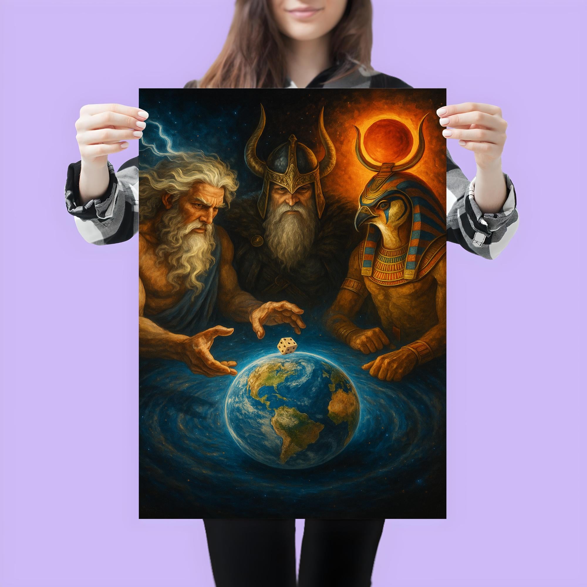 Zeus Odin Ra Dice Battle Poster Print Wall Art Mythological Gods Roll for Earth Ownership