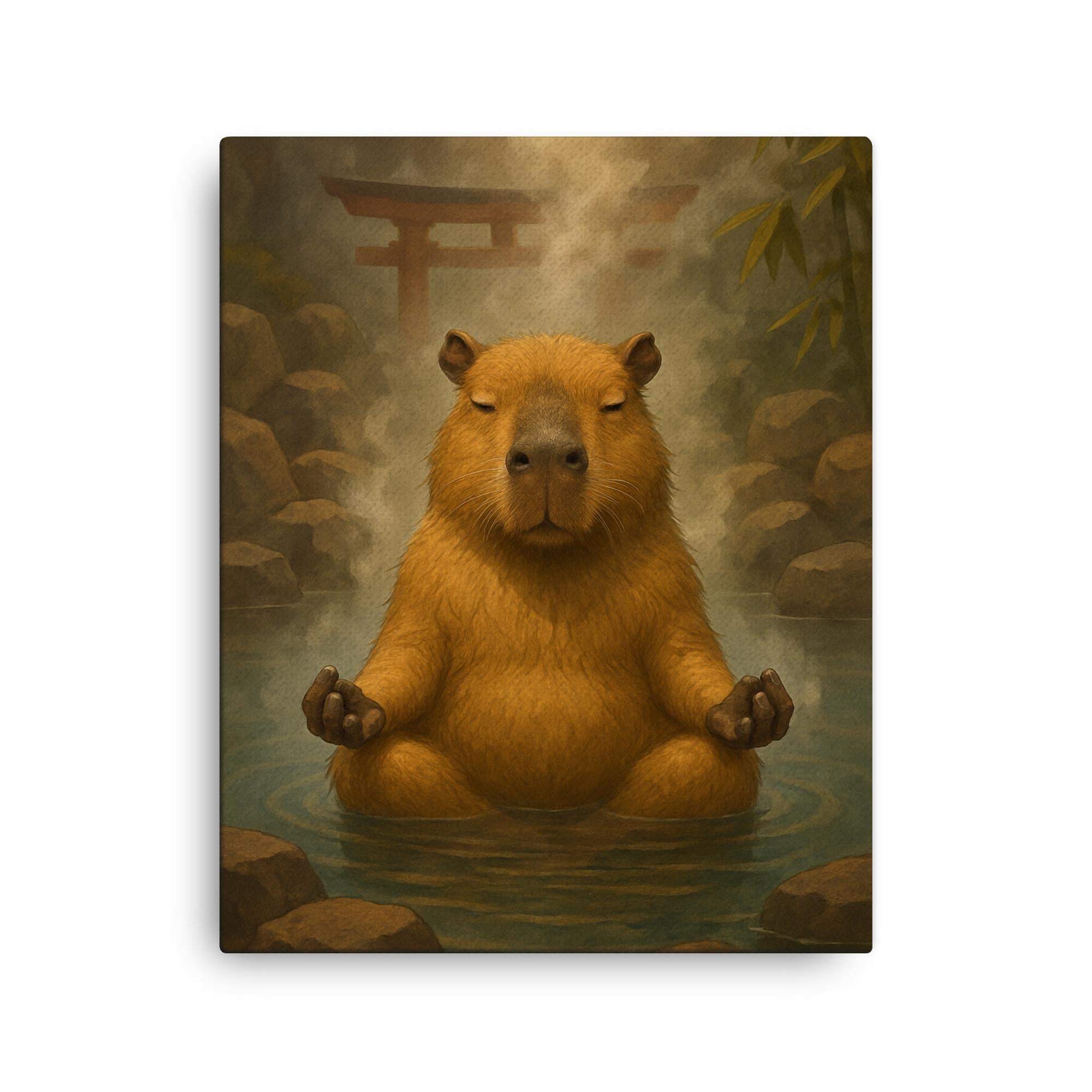 Transform your space with serene charm through this exquisite canvas print featuring a meditative capybara enveloped in the gentle steam of a Japanese hot spring.