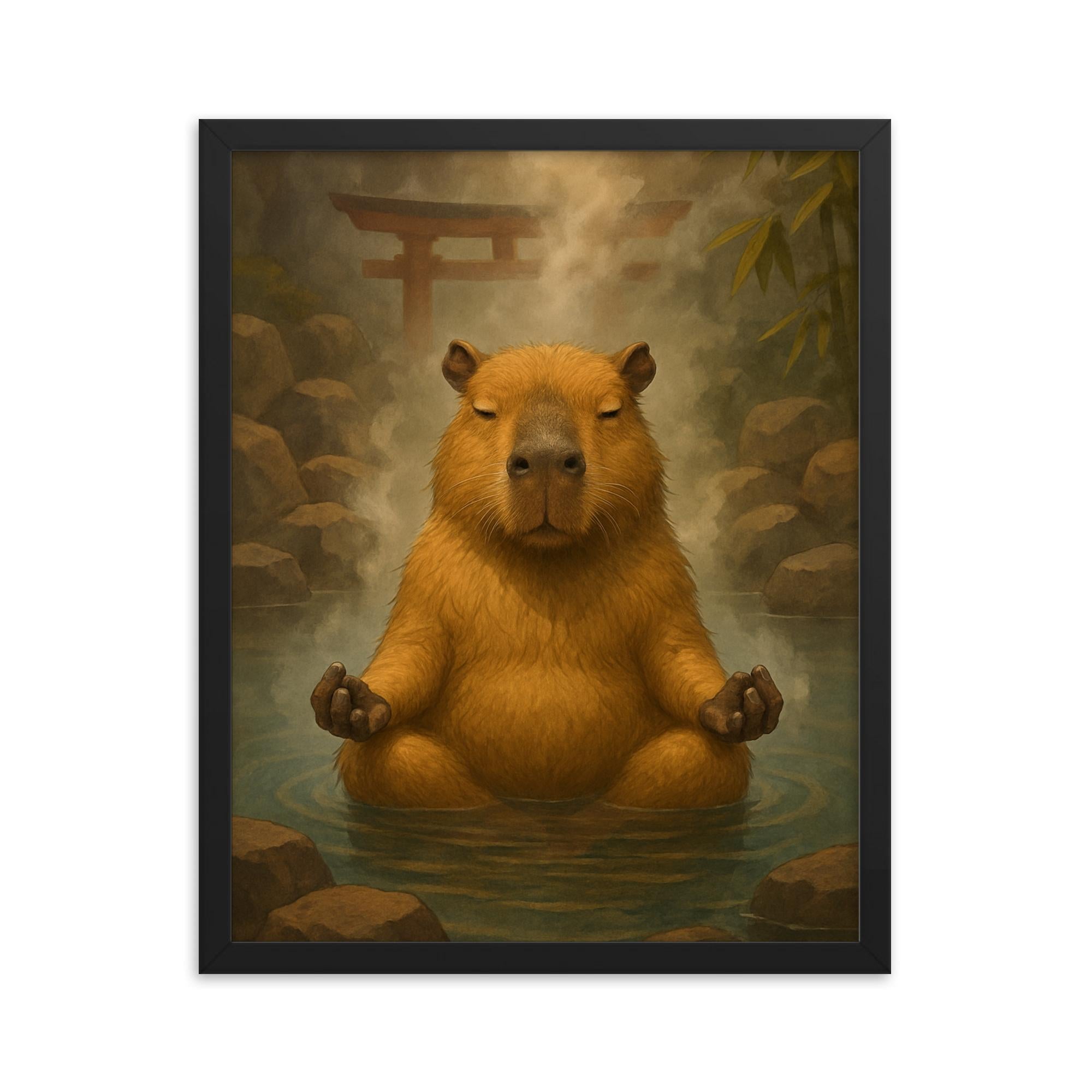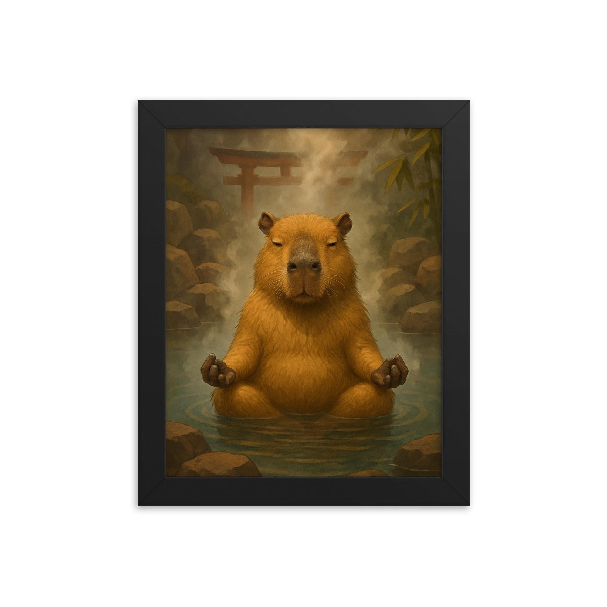 Immerse your space in tranquil charm with this stunning framed print of a capybara meditating in a Japanese hot spring, steam gently rising around it.