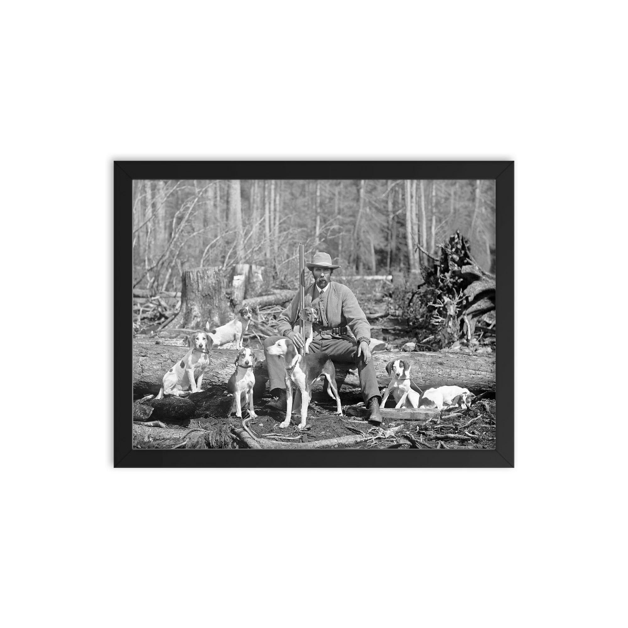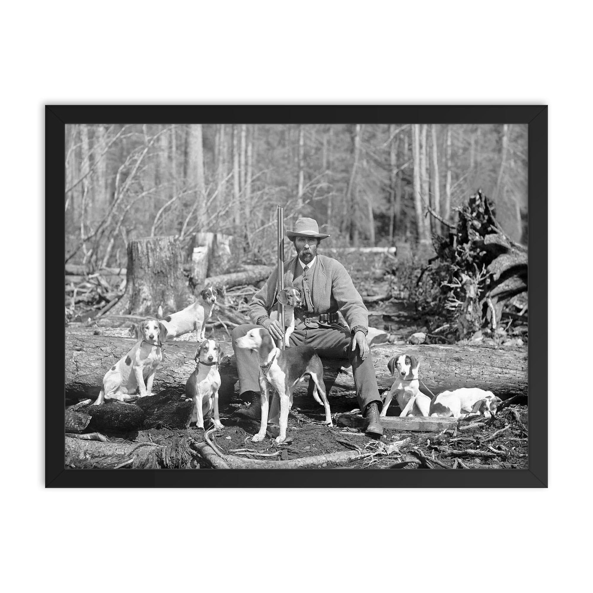 This framed print of "A Deer Hunter Poses for a Portrait with His Hounds, 1897" brings a distinguished piece of history right into your home or office.